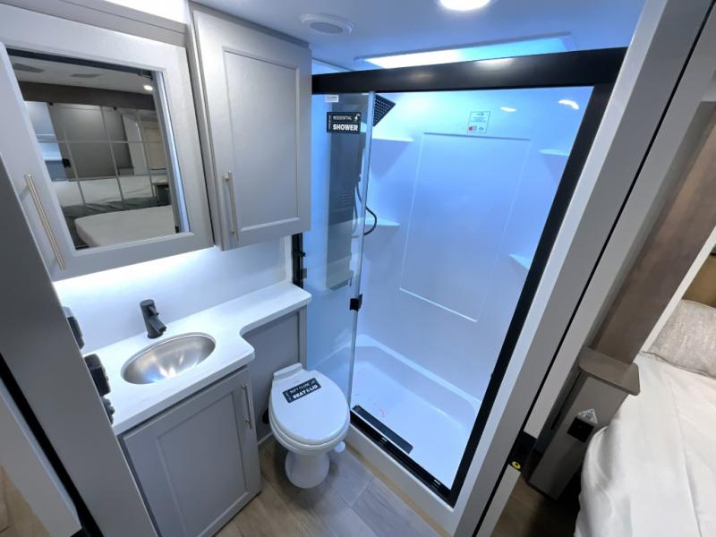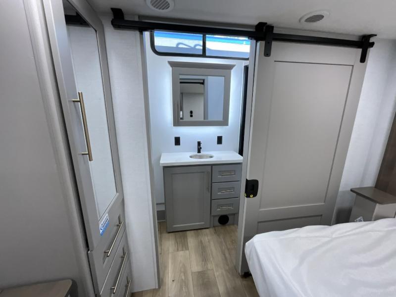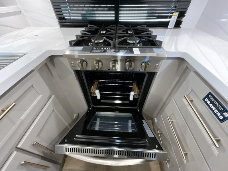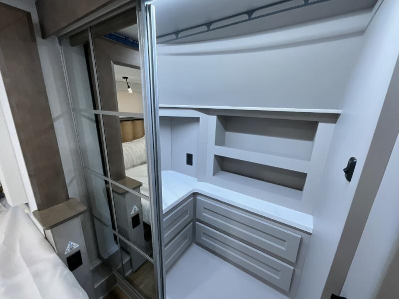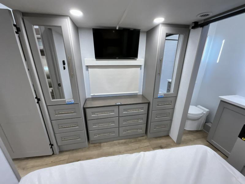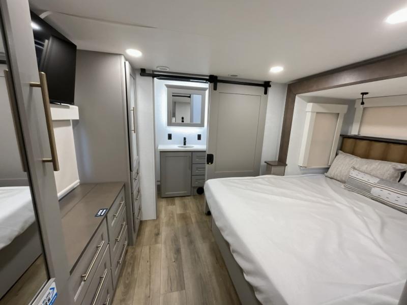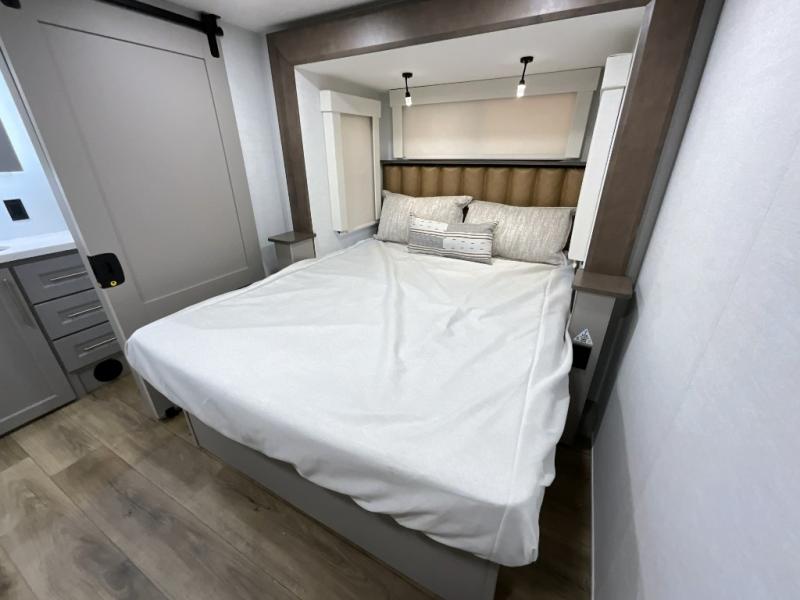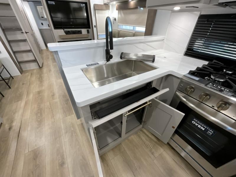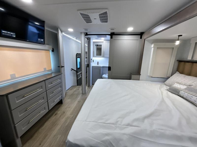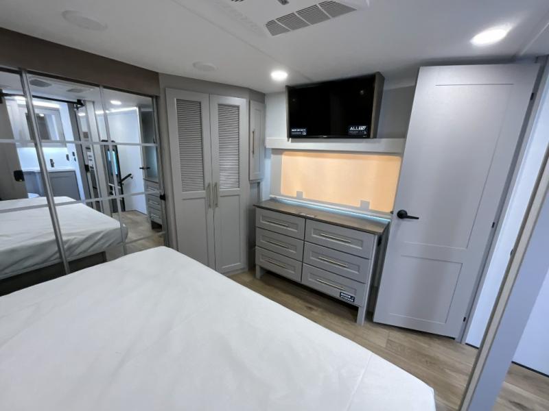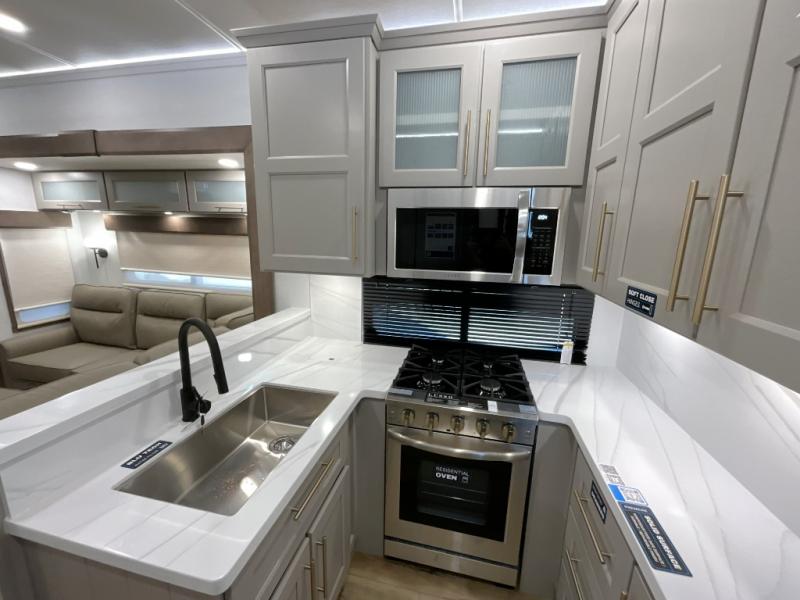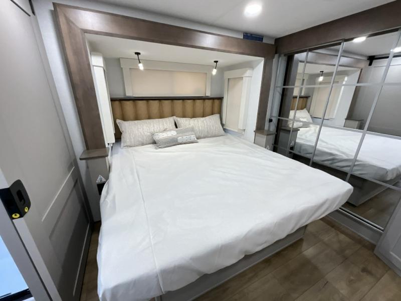 The Paradigm fifth wheels by Alliance RV are functional, high-quality, and luxurious for an unforgettable camping experience. There are three A/C units and a 40K BTU furnace to keep you comfortable year around, and you'll appreciate additional convenient amenities, like the all-in-one enclosed/heated utility center and the color coded and numbered wiring. A Helux Series coil spring pin box comes standard for hassle-free towing, along with Super-G 4,400 lb. rated tires and Dexter 7,000 lb. axles. You'll love the kitchen with its LG solid surface countertops and Lusso range, plus there is LED motion lighting in the pantry and a Maxx fan with a rain sensor to keep everything fresh when making dinner. Each model also includes an HD Smart TV in the living room and bedroom, plus a Winegard Air 360 antenna to keep you connected to the outside world. And of course there are a variety of options you can choose from to further customize your fifth wheel; dual pane windows, Super Solar Plus, slide out awning toppers, and generator prep or a generator to name a few!
