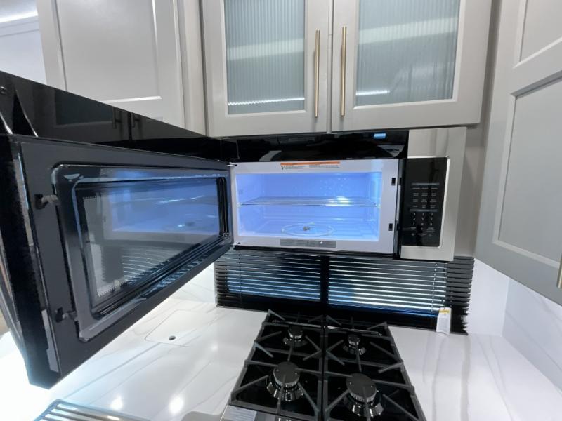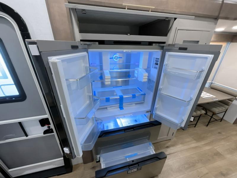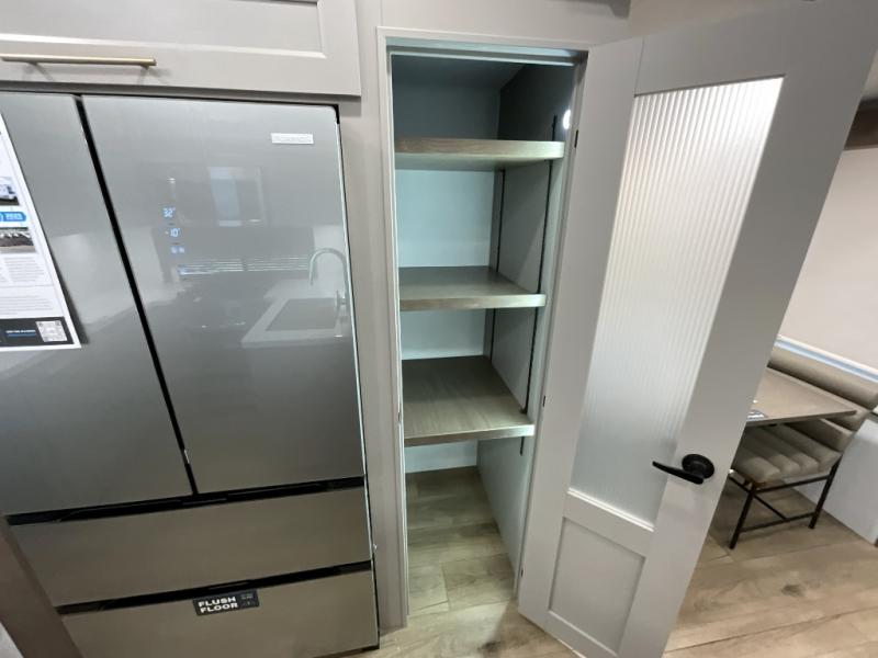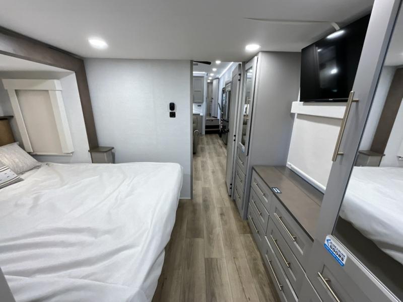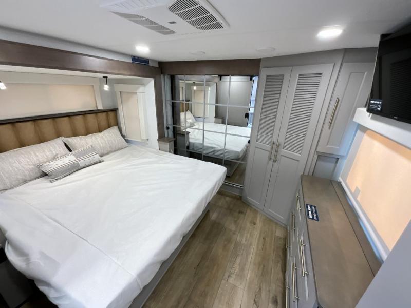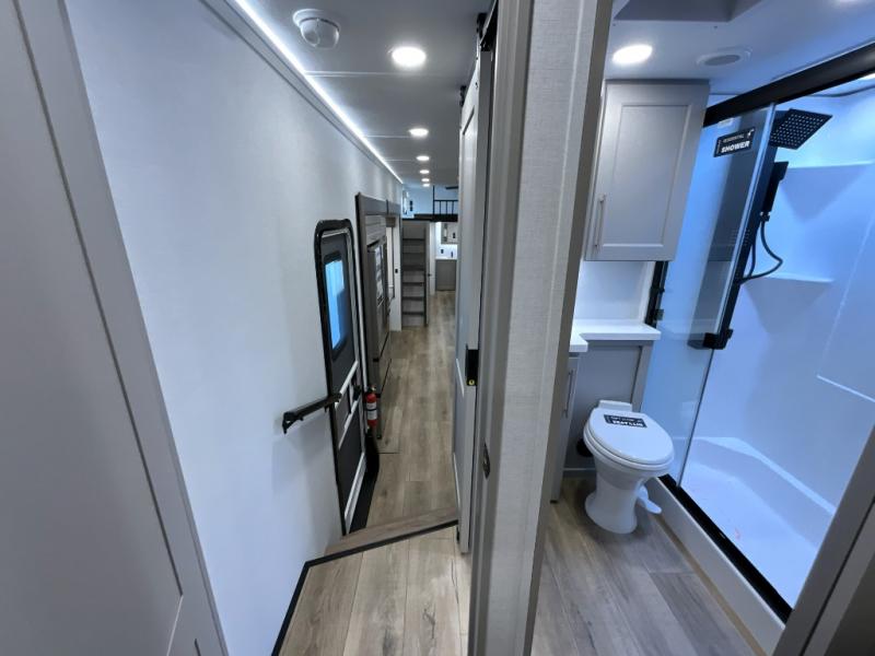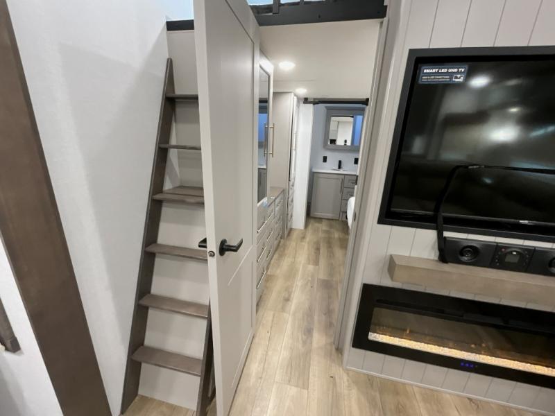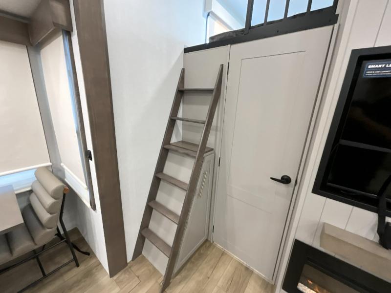 A spacious unit with sleeping for eight with plenty of choices to suit everyone! There is a front private bedroom with a king size bed that offers a large full front closet that has also been prepped for a washer and dryer if you choose that option. The front bath features a 40" x 30" shower and dual entry. Head down to the kitchen and living space at the bottom of the stairs to find a curbside slide that houses the 19 cu. ft. residential refrigerator, a pantry, and a swivel table and desk. As you continue on toward the rear of this coach, you will find a spacious living area along the roadside with a 50" Smart TV and a fireplace, a sofa sleeper slide, and a dual reclining loveseat. This makes a great gathering place for television watching, game playing, and even added sleeping space if needed at night. The rear private bedroom with its own private bath features a queen bed, two closets, and a Smart TV as well. The multipurpose loft area above can be accessed just before this rear bedroom entry by a ladder, and it is perfect for extra storage, or it can be used for added sleeping that the kiddos are sure to love.