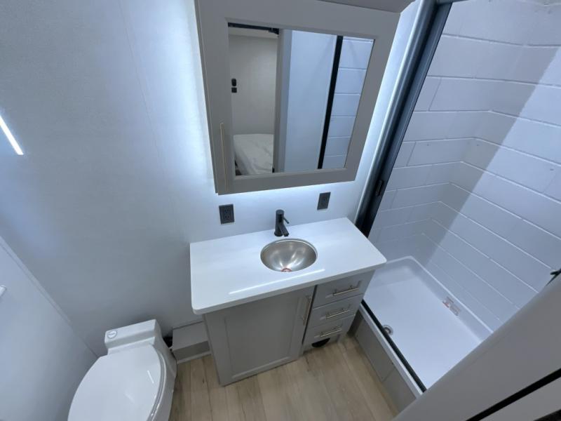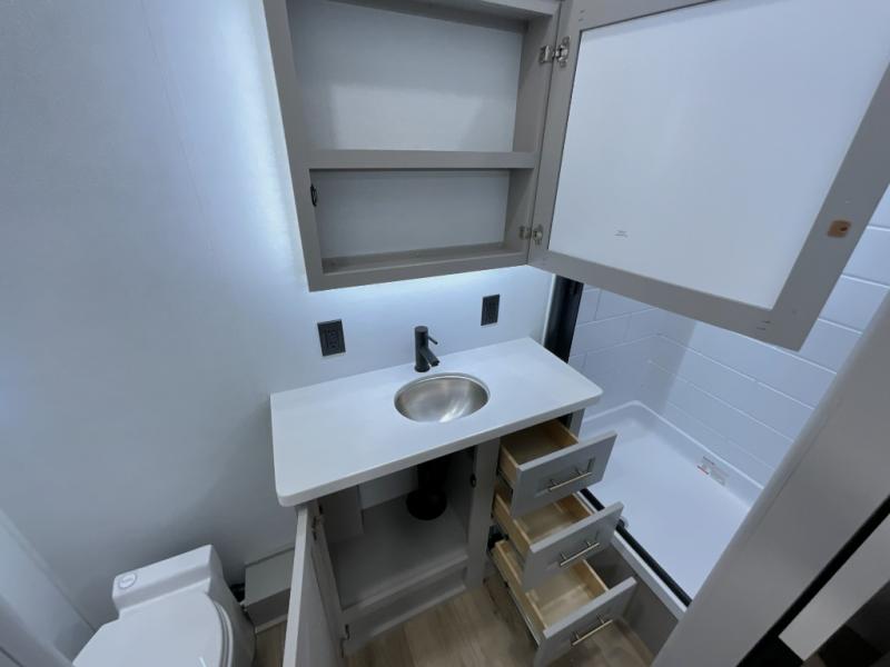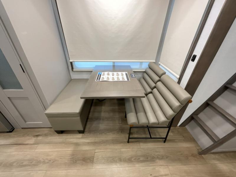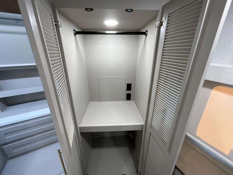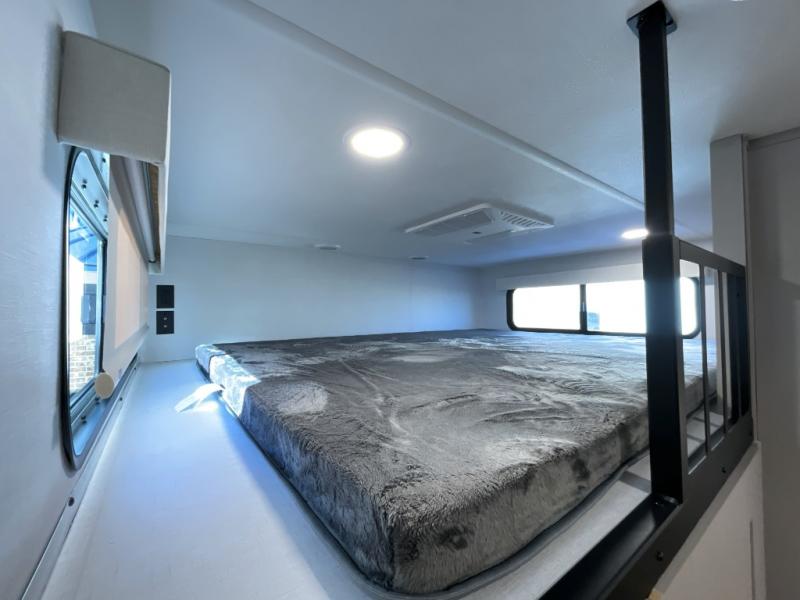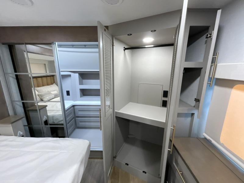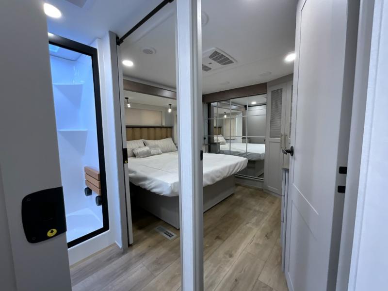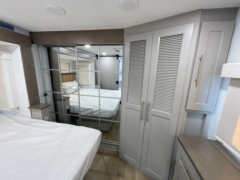 A spacious unit with sleeping for eight with plenty of choices to suit everyone! There is a front private bedroom with a king size bed that offers a large full front closet that has also been prepped for a washer and dryer if you choose that option. The front bath features a 40" x 30" shower and dual entry. Head down to the kitchen and living space at the bottom of the stairs to find a curbside slide that houses the 19 cu. ft. residential refrigerator, a pantry, and a swivel table and desk. As you continue on toward the rear of this coach, you will find a spacious living area along the roadside with a 50" Smart TV and a fireplace, a sofa sleeper slide, and a dual reclining loveseat. This makes a great gathering place for television watching, game playing, and even added sleeping space if needed at night. The rear private bedroom with its own private bath features a queen bed, two closets, and a Smart TV as well. The multipurpose loft area above can be accessed just before this rear bedroom entry by a ladder, and it is perfect for extra storage, or it can be used for added sleeping that the kiddos are sure to love.