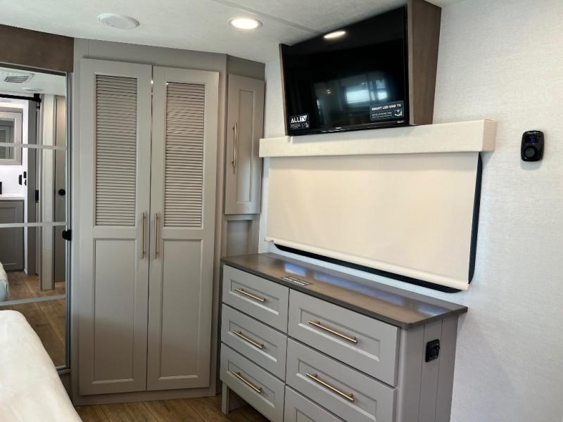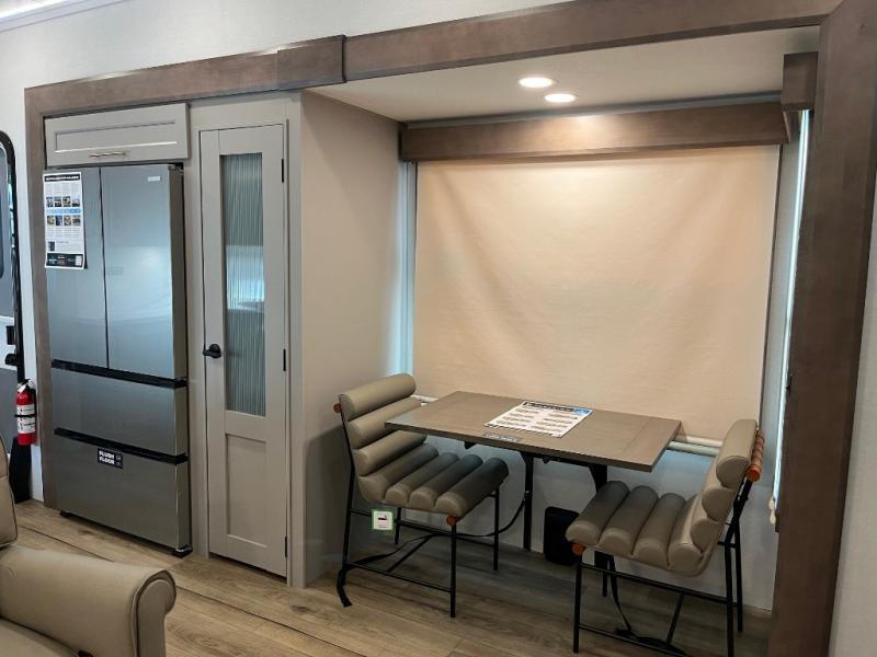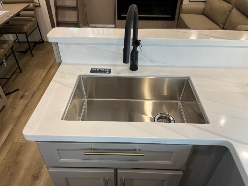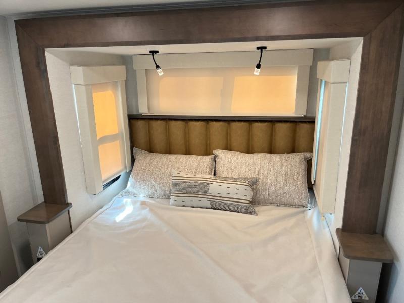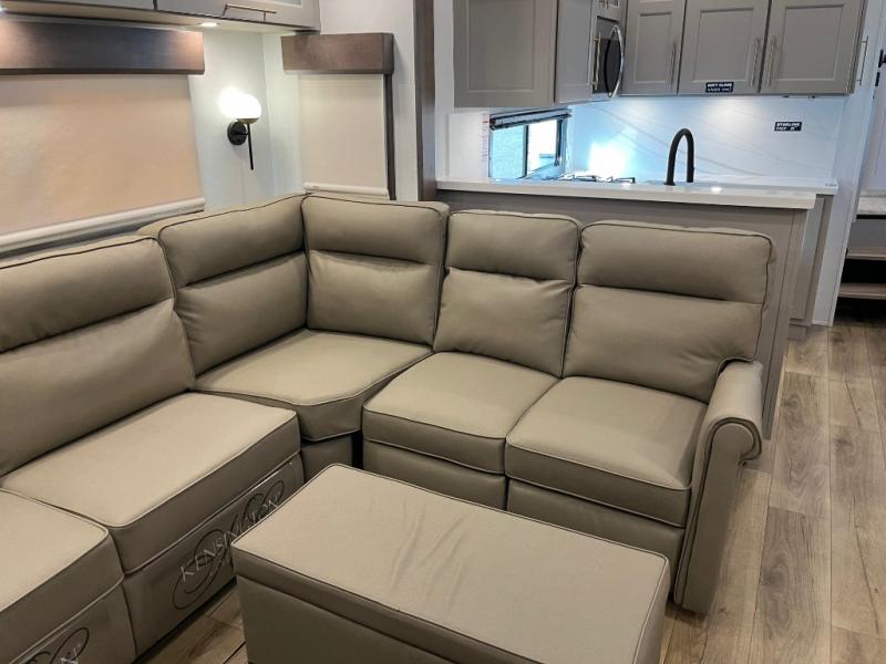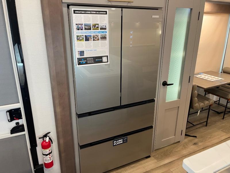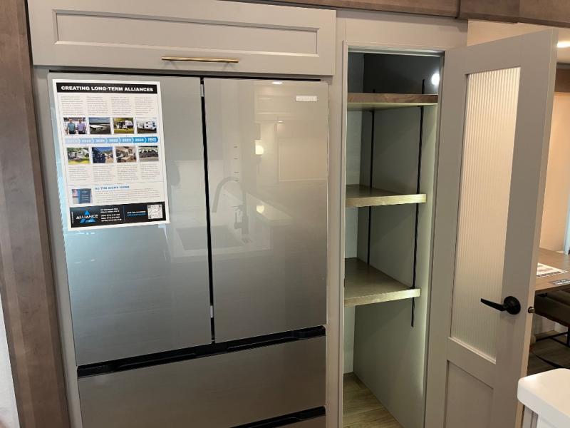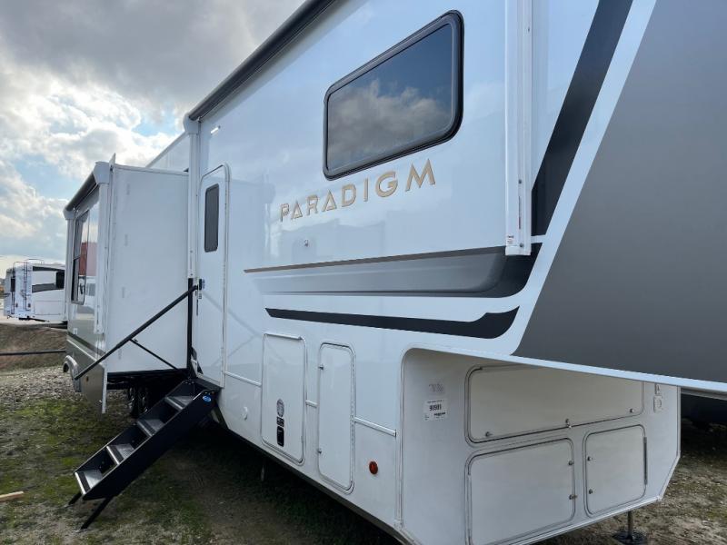 The Paradigm fifth wheels by Alliance RV are functional, high-quality, and luxurious for an unforgettable camping experience. There are three A/C units and a 40K BTU furnace to keep you comfortable year around, and you'll appreciate additional convenient amenities, like the all-in-one enclosed/heated utility center and the color coded and numbered wiring. A Helux Series coil spring pin box comes standard for hassle-free towing, along with Super-G 4,400 lb. rated tires and Dexter 7,000 lb. axles. You'll love the kitchen with its LG solid surface countertops and Lusso range, plus there is LED motion lighting in the pantry and a Maxx fan with a rain sensor to keep everything fresh when making dinner. Each model also includes an HD Smart TV in the living room and bedroom, plus a Winegard Air 360 antenna to keep you connected to the outside world. And of course there are a variety of options you can choose from to further customize your fifth wheel; dual pane windows, Super Solar Plus, slide out awning toppers, and generator prep or a generator to name a few!
