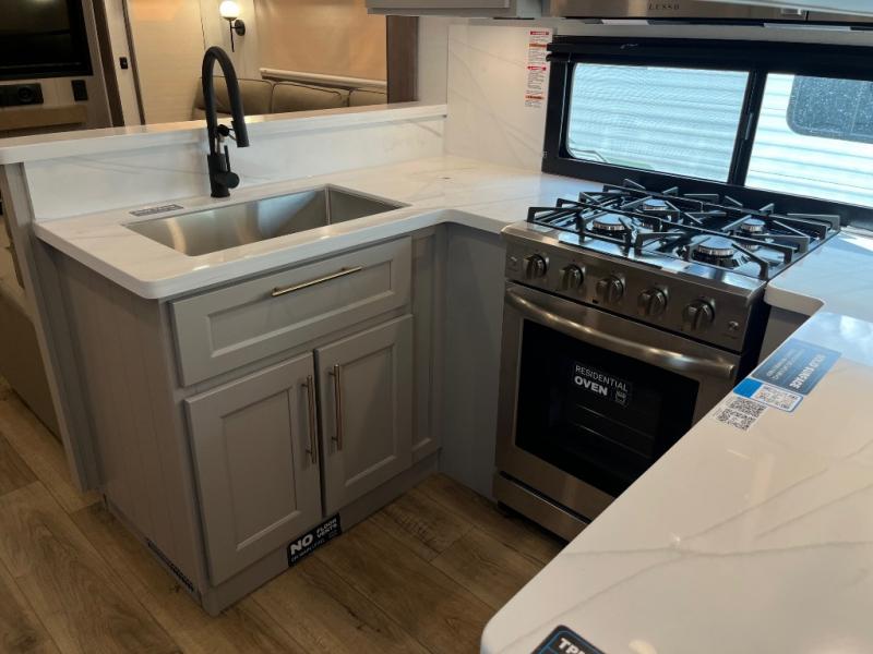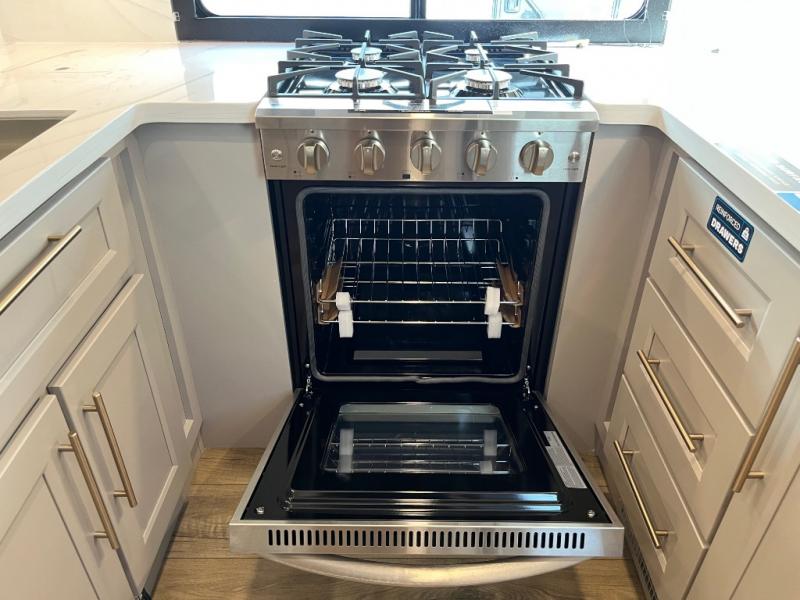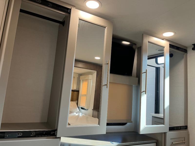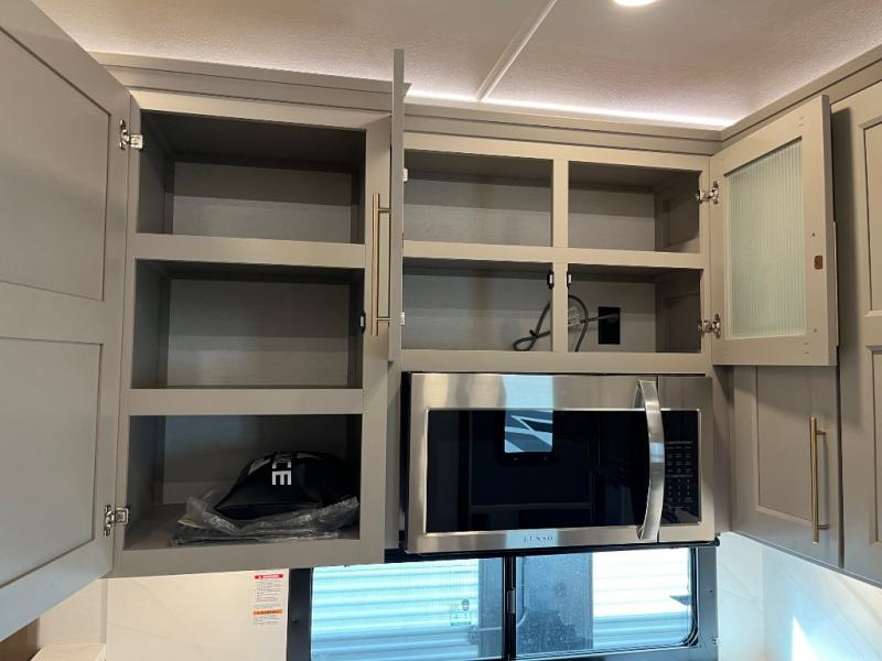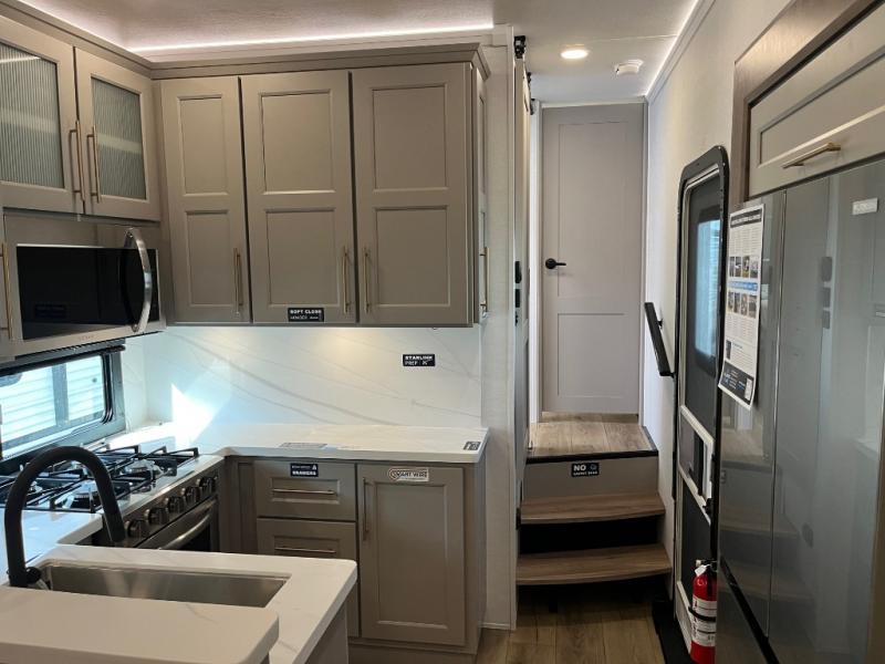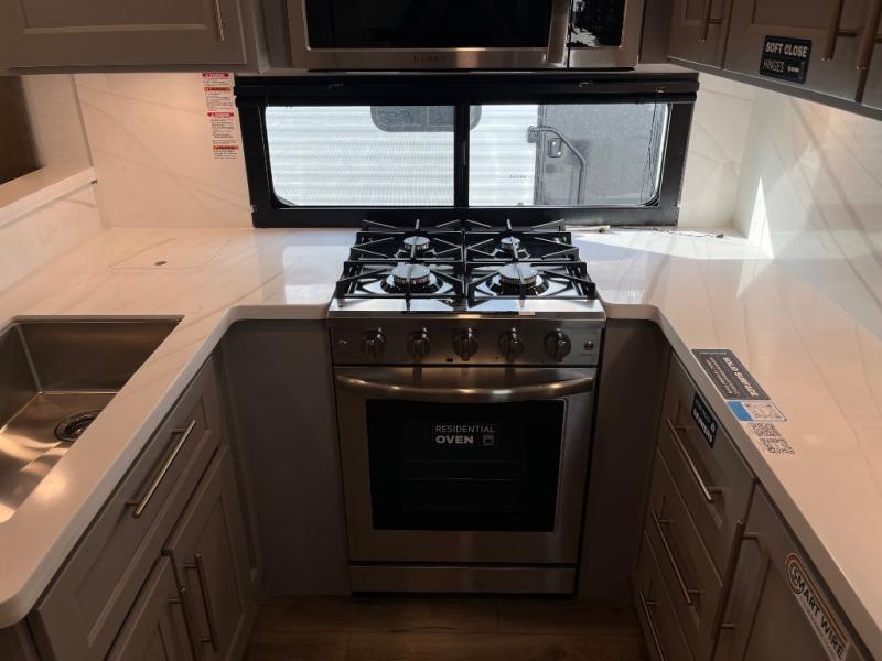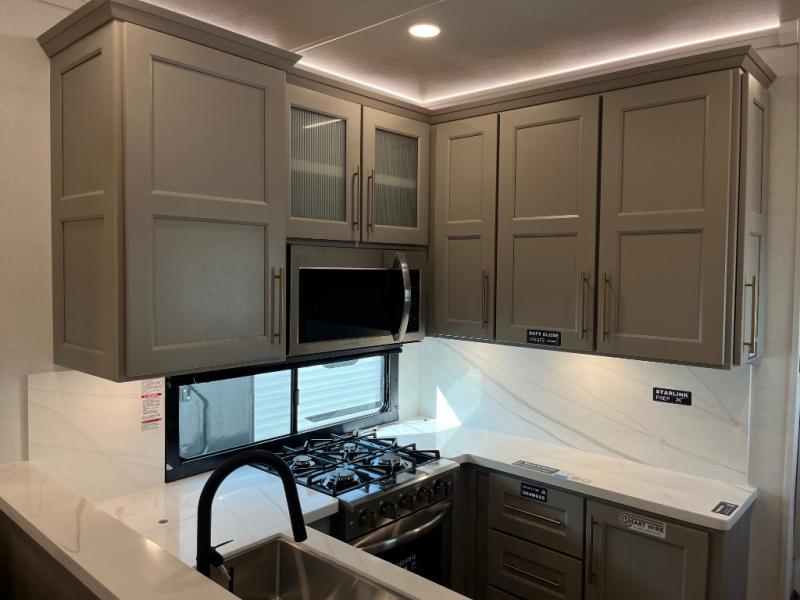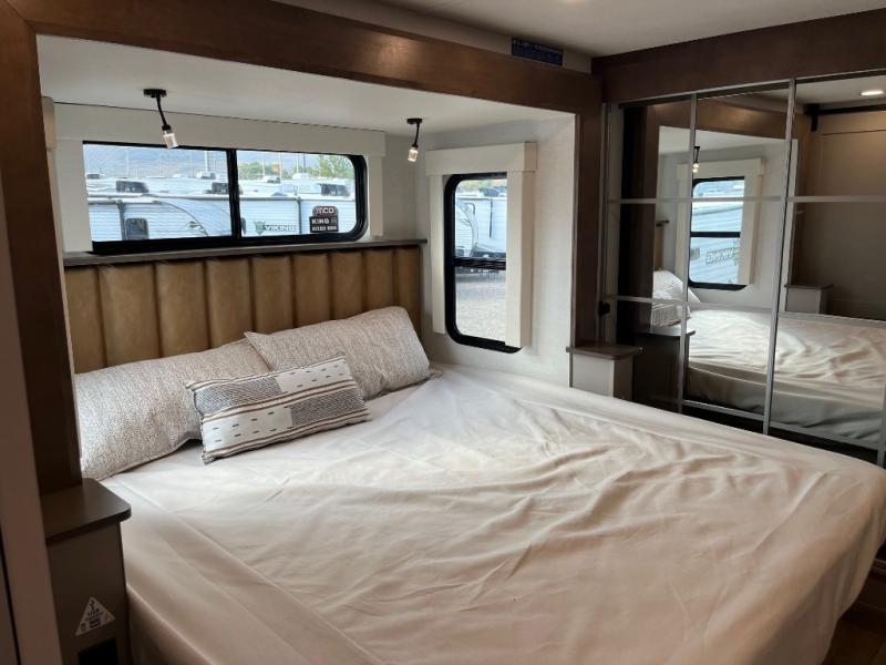 The Paradigm fifth wheels by Alliance RV are functional, high-quality, and luxurious for an unforgettable camping experience. There are three A/C units and a 40K BTU furnace to keep you comfortable year around, and you'll appreciate additional convenient amenities, like the all-in-one enclosed/heated utility center and the color coded and numbered wiring. A Helux Series coil spring pin box comes standard for hassle-free towing, along with Super-G 4,400 lb. rated tires and Dexter 7,000 lb. axles. You'll love the kitchen with its LG solid surface countertops and Lusso range, plus there is LED motion lighting in the pantry and a Maxx fan with a rain sensor to keep everything fresh when making dinner. Each model also includes an HD Smart TV in the living room and bedroom, plus a Winegard Air 360 antenna to keep you connected to the outside world. And of course there are a variety of options you can choose from to further customize your fifth wheel; dual pane windows, Super Solar Plus, slide out awning toppers, and generator prep or a generator to name a few!