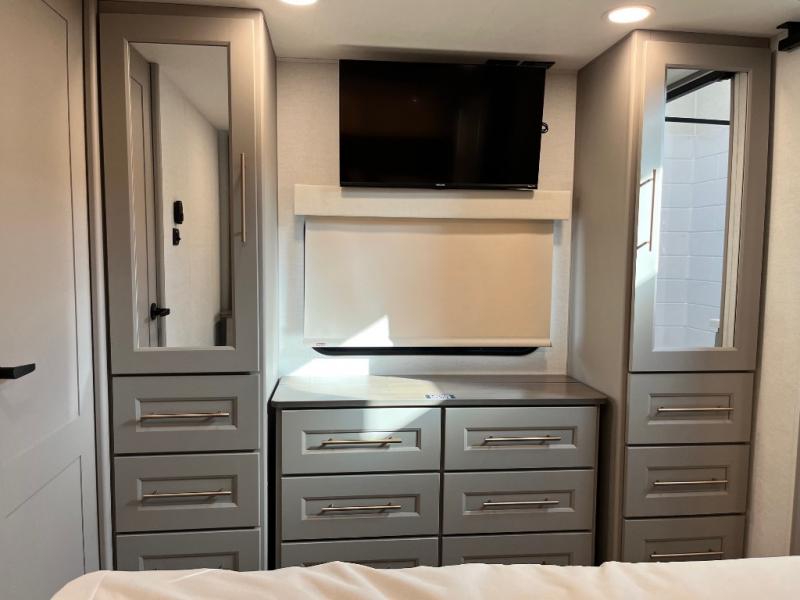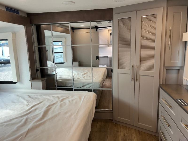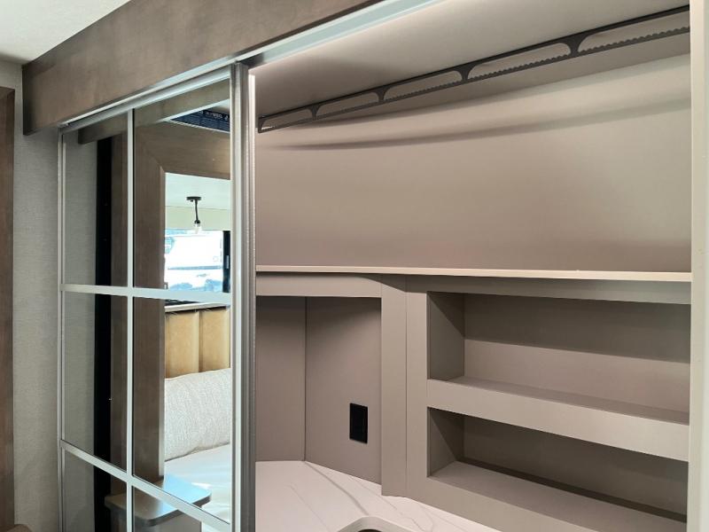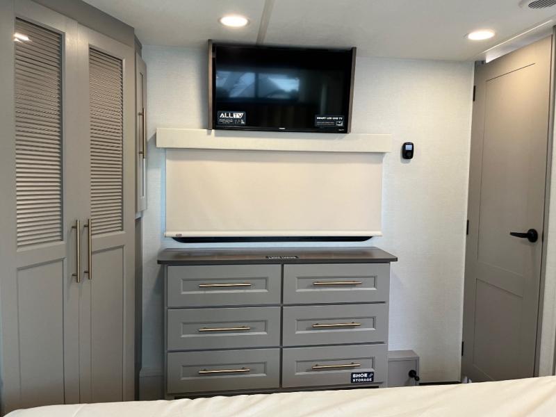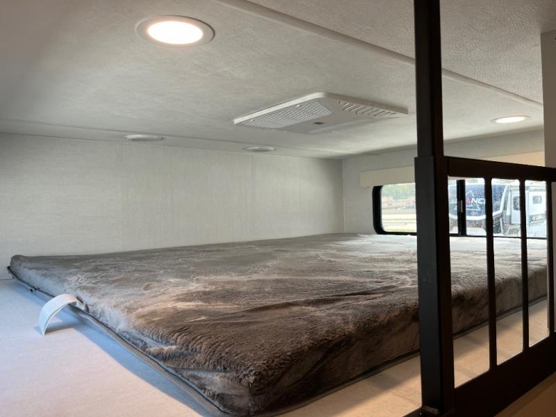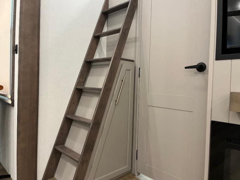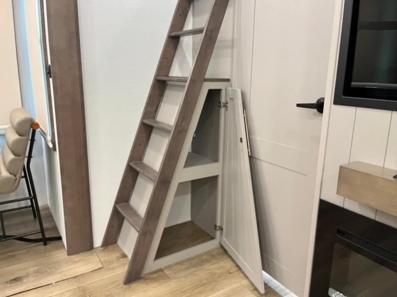 A spacious unit with sleeping for eight with plenty of choices to suit everyone! There is a front private bedroom with a king size bed that offers a large full front closet that has also been prepped for a washer and dryer if you choose that option. The front bath features a 40" x 30" shower and dual entry. Head down to the kitchen and living space at the bottom of the stairs to find a curbside slide that houses the 19 cu. ft. residential refrigerator, a pantry, and a swivel table and desk. As you continue on toward the rear of this coach, you will find a spacious living area along the roadside with a 50" Smart TV and a fireplace, a sofa sleeper slide, and a dual reclining loveseat. This makes a great gathering place for television watching, game playing, and even added sleeping space if needed at night. The rear private bedroom with its own private bath features a queen bed, two closets, and a Smart TV as well. The multipurpose loft area above can be accessed just before this rear bedroom entry by a ladder, and it is perfect for extra storage, or it can be used for added sleeping that the kiddos are sure to love.