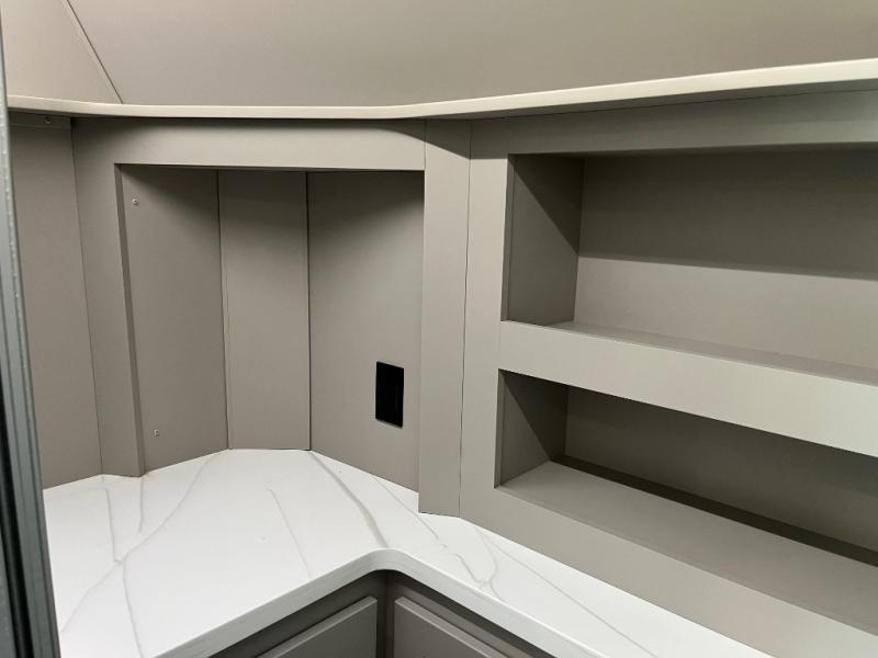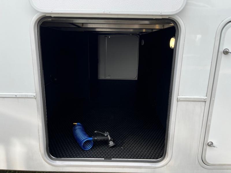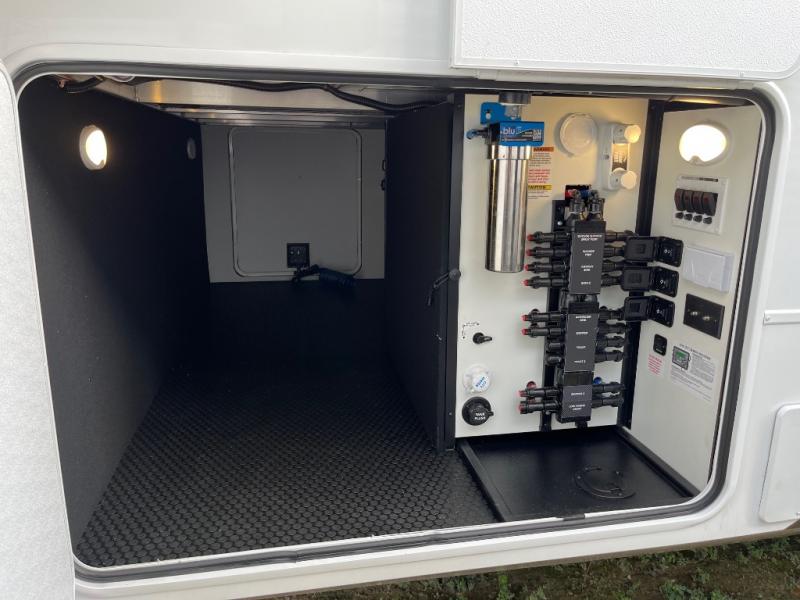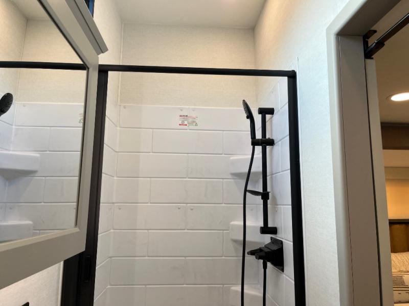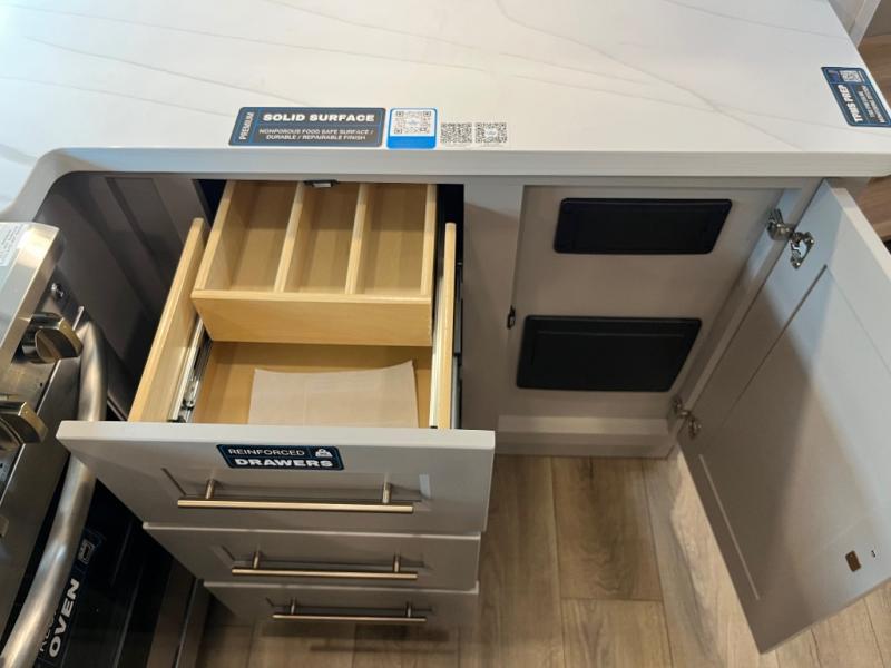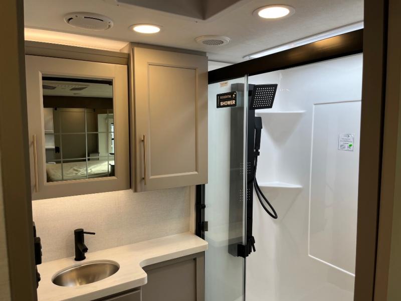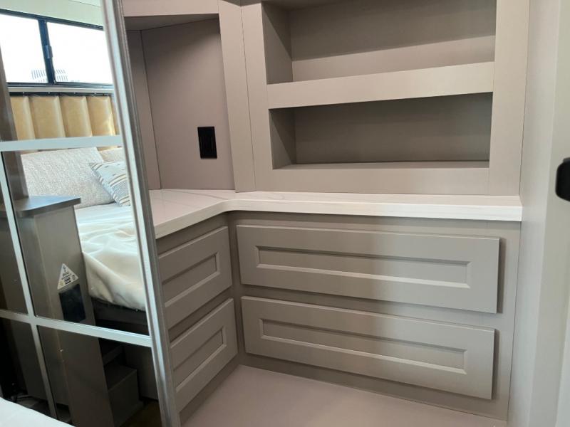 A spacious unit with sleeping for eight with plenty of choices to suit everyone! There is a front private bedroom with a king size bed that offers a large full front closet that has also been prepped for a washer and dryer if you choose that option. The front bath features a 40" x 30" shower and dual entry. Head down to the kitchen and living space at the bottom of the stairs to find a curbside slide that houses the 19 cu. ft. residential refrigerator, a pantry, and a swivel table and desk. As you continue on toward the rear of this coach, you will find a spacious living area along the roadside with a 50" Smart TV and a fireplace, a sofa sleeper slide, and a dual reclining loveseat. This makes a great gathering place for television watching, game playing, and even added sleeping space if needed at night. The rear private bedroom with its own private bath features a queen bed, two closets, and a Smart TV as well. The multipurpose loft area above can be accessed just before this rear bedroom entry by a ladder, and it is perfect for extra storage, or it can be used for added sleeping that the kiddos are sure to love.