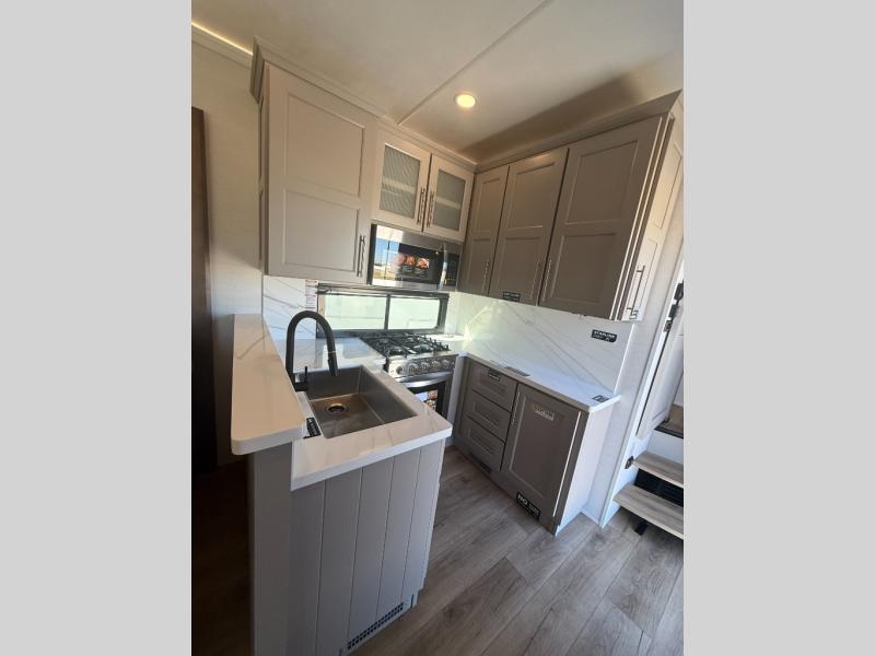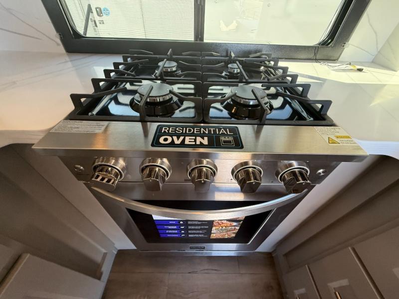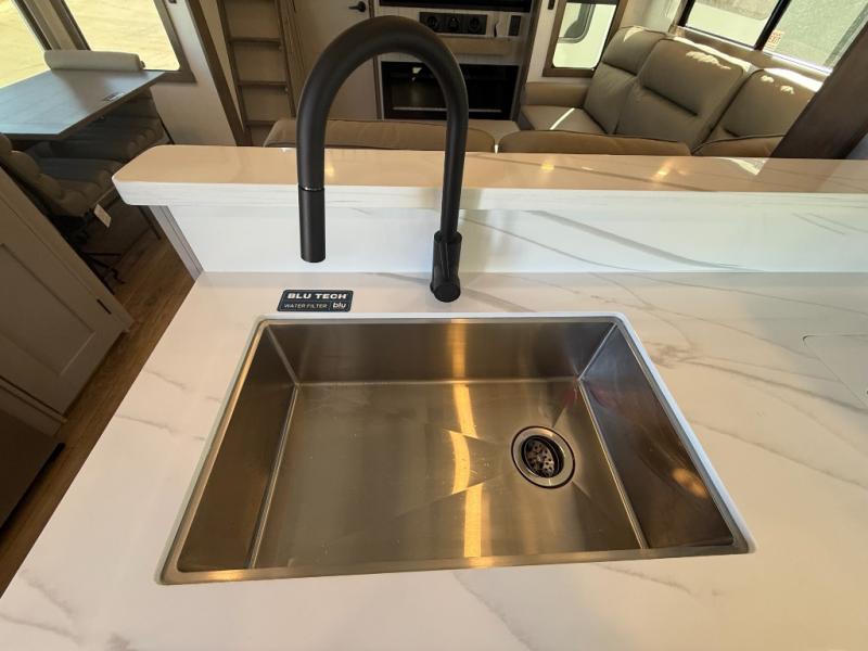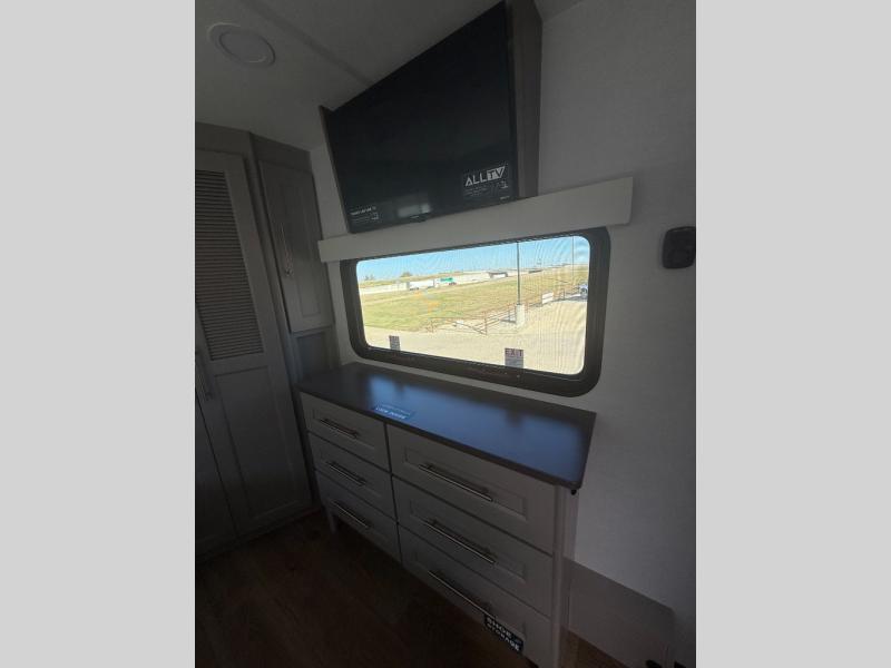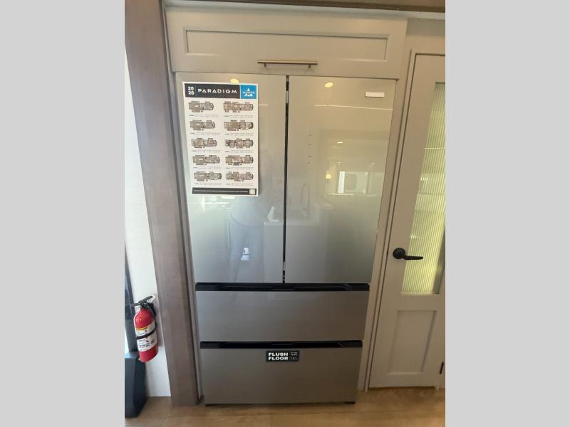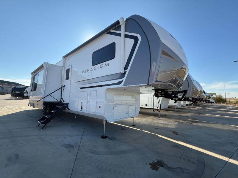 The Paradigm fifth wheels by Alliance RV are functional, high-quality, and luxurious for an unforgettable camping experience. There are three A/C units and a 40K BTU furnace to keep you comfortable year around, and you'll appreciate additional convenient amenities, like the all-in-one enclosed/heated utility center and the color coded and numbered wiring. A Helux Series coil spring pin box comes standard for hassle-free towing, along with Curt 8,000 lb. axles. You'll love the kitchen with its LG solid surface countertops and Lusso range, plus there is LED motion lighting in the pantry and a Maxx fan with a rain sensor to keep everything fresh when making dinner. Each model also includes an HD Smart TV in the living room and bedroom. And of course there are a variety of options you can choose from to further customize your fifth wheel; dual pane windows, Super Solar Plus, slide out awning toppers, and generator prep or a generator to name a few!