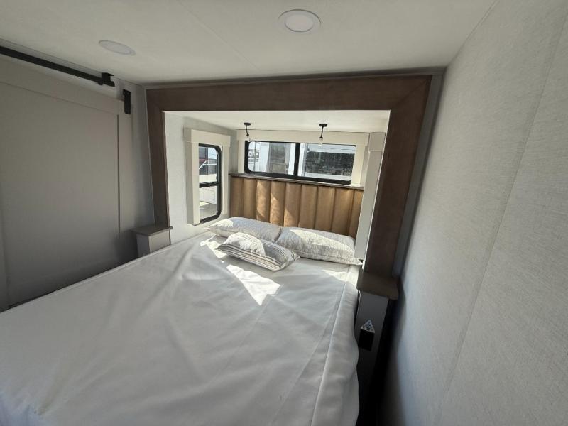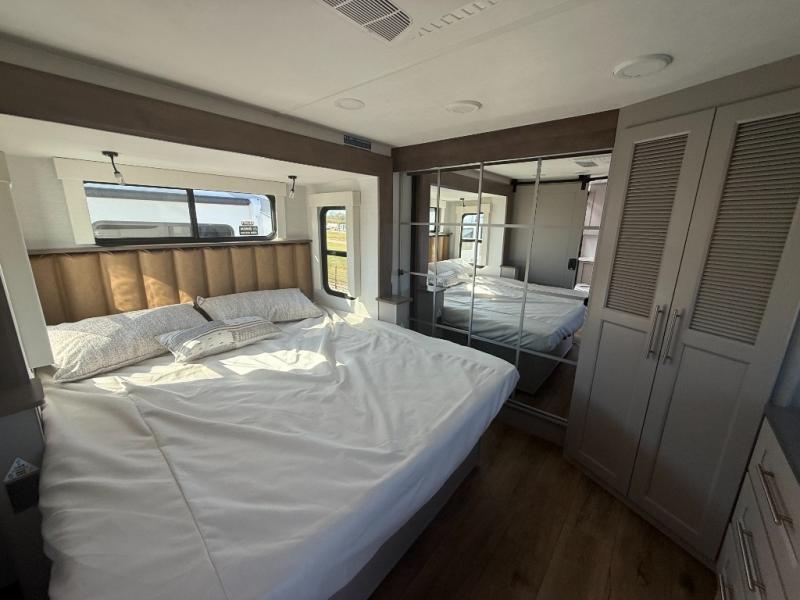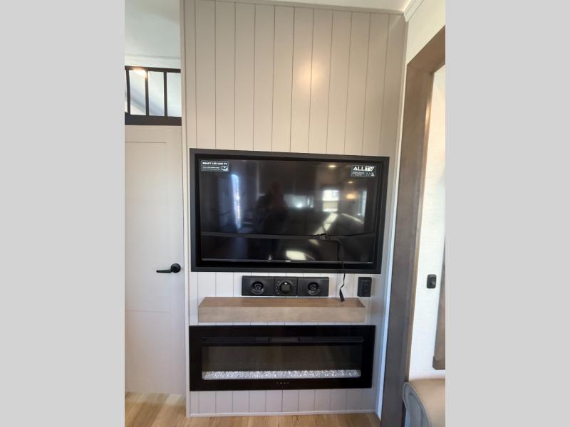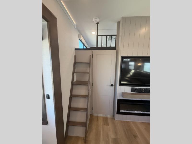 A spacious unit with sleeping for eight with plenty of choices to suit everyone! There is a front private bedroom with a king size bed that offers a large full front closet that has also been prepped for a washer and dryer if you choose that option. The front bath features a 40" x 30" shower and dual entry. Head down to the kitchen and living space at the bottom of the stairs to find a curbside slide that houses the 19 cu. ft. residential refrigerator, a pantry, and a swivel table and desk. As you continue on toward the rear of this coach, you will find a spacious living area along the roadside with a 50" Smart TV and a fireplace, a L-sofa sleeper slide, and a dual reclining loveseat. This makes a great gathering place for television watching, game playing, and even added sleeping space if needed at night. The rear private bedroom with its own private bath features a queen bed, two closets, and a Smart TV as well. The multipurpose loft area above can be accessed just before this rear bedroom entry by a ladder, and it is perfect for extra storage, or it can be used for added sleeping that the kiddos are sure to love.