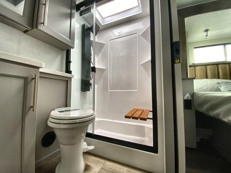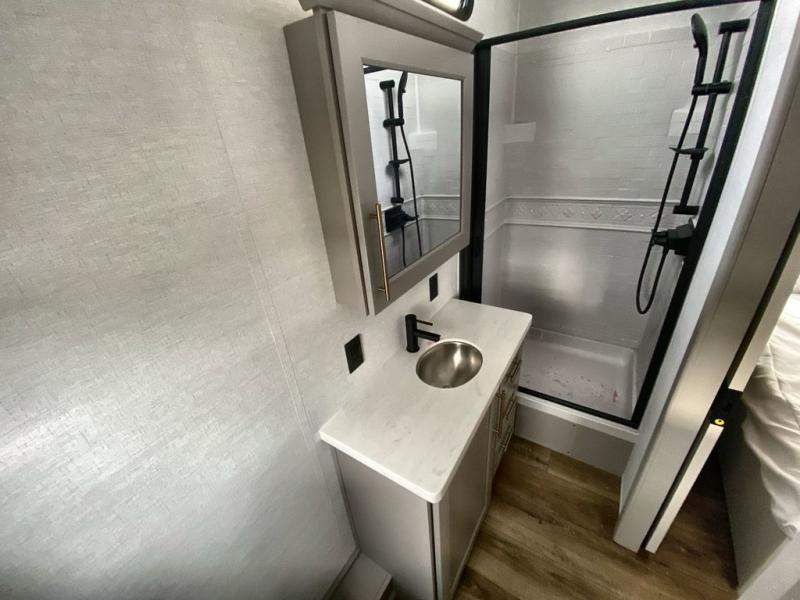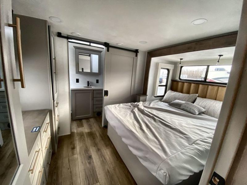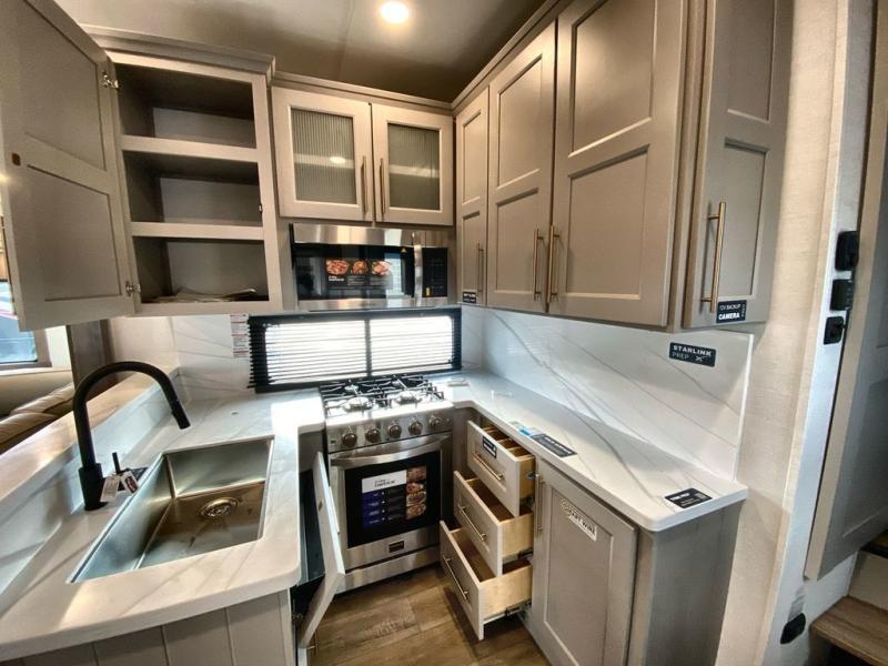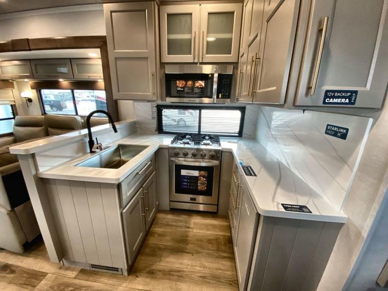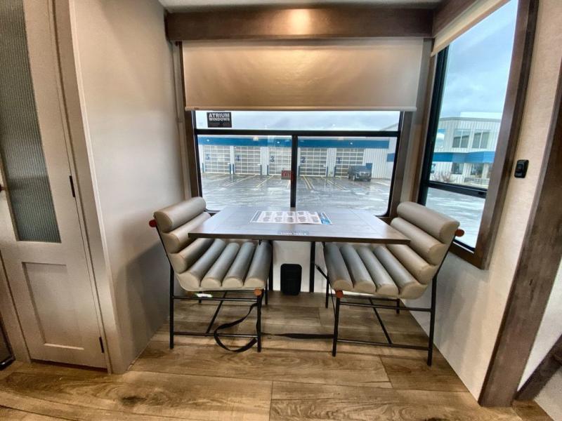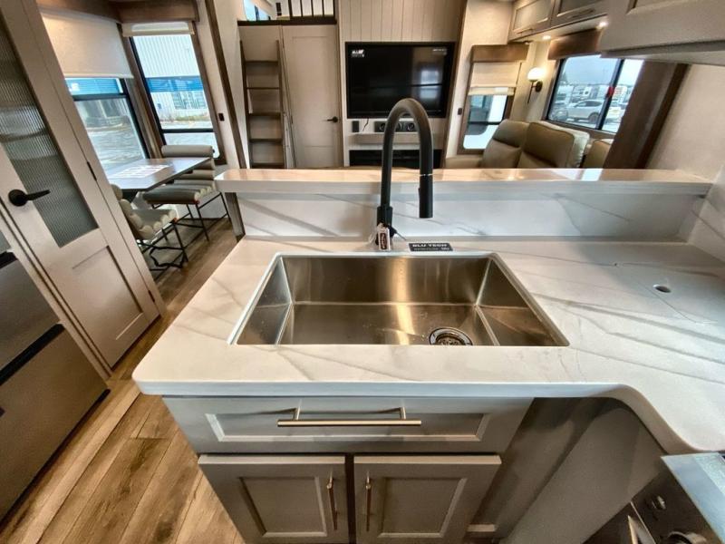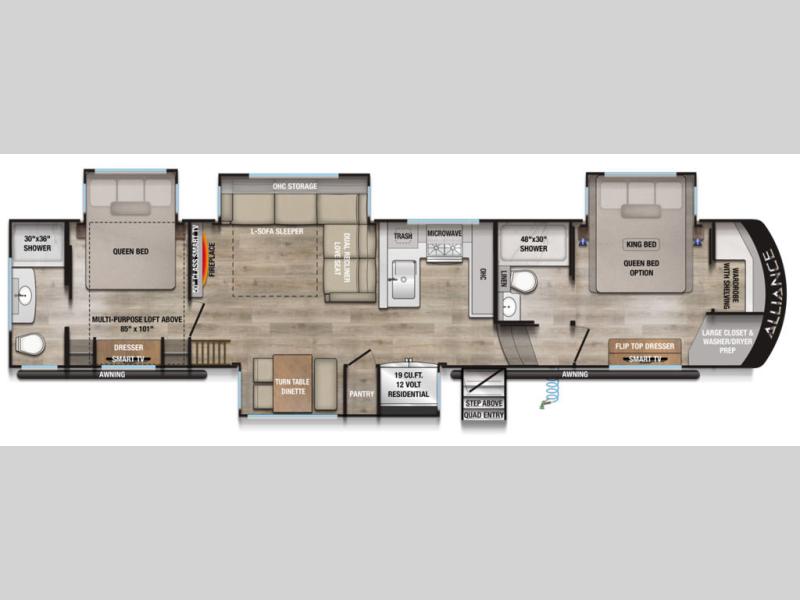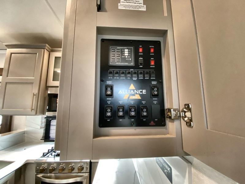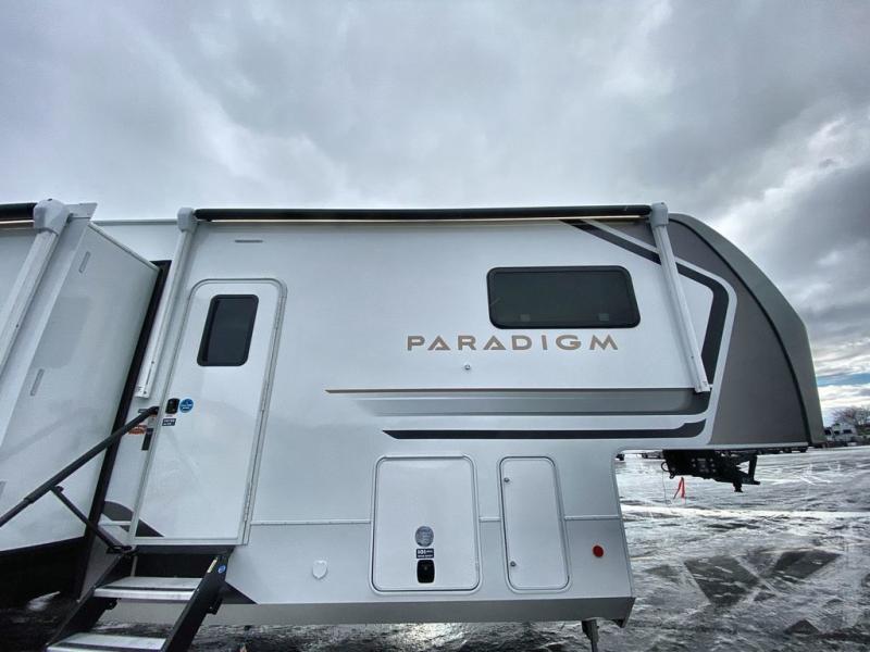 The Paradigm fifth wheels by Alliance RV are functional, high-quality, and luxurious for an unforgettable camping experience. There are three A/C units and a 40K BTU furnace to keep you comfortable year around, and you'll appreciate additional convenient amenities, like the all-in-one enclosed/heated utility center and the color coded and numbered wiring. A Helux Series coil spring pin box comes standard for hassle-free towing, along with Curt 8,000 lb. axles. You'll love the kitchen with its LG solid surface countertops and Lusso range, plus there is LED motion lighting in the pantry and a Maxx fan with a rain sensor to keep everything fresh when making dinner. Each model also includes an HD Smart TV in the living room and bedroom. And of course there are a variety of options you can choose from to further customize your fifth wheel; dual pane windows, Super Solar Plus, slide out awning toppers, and generator prep or a generator to name a few!