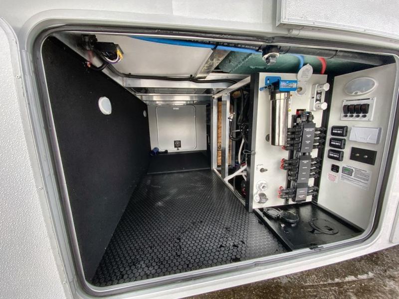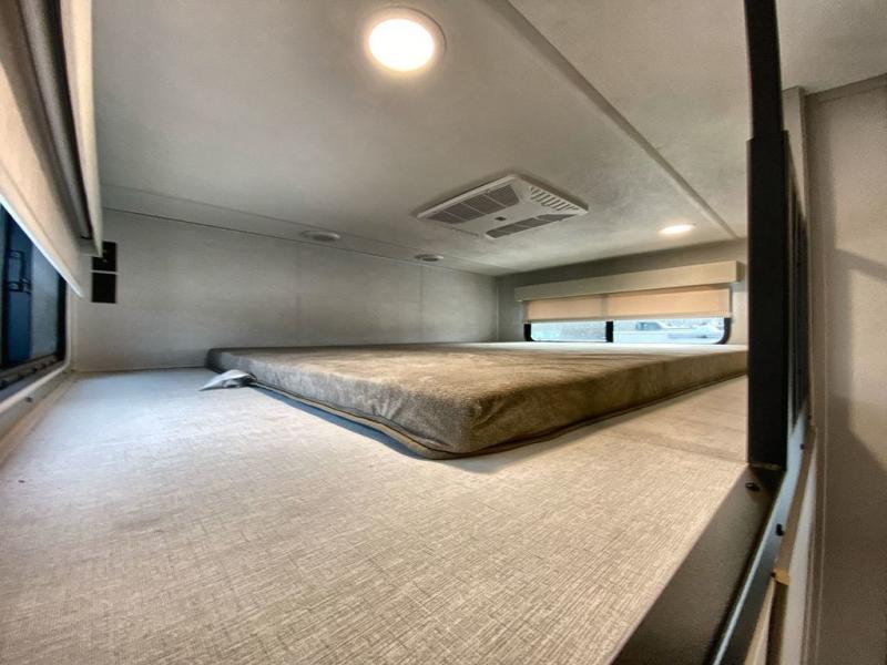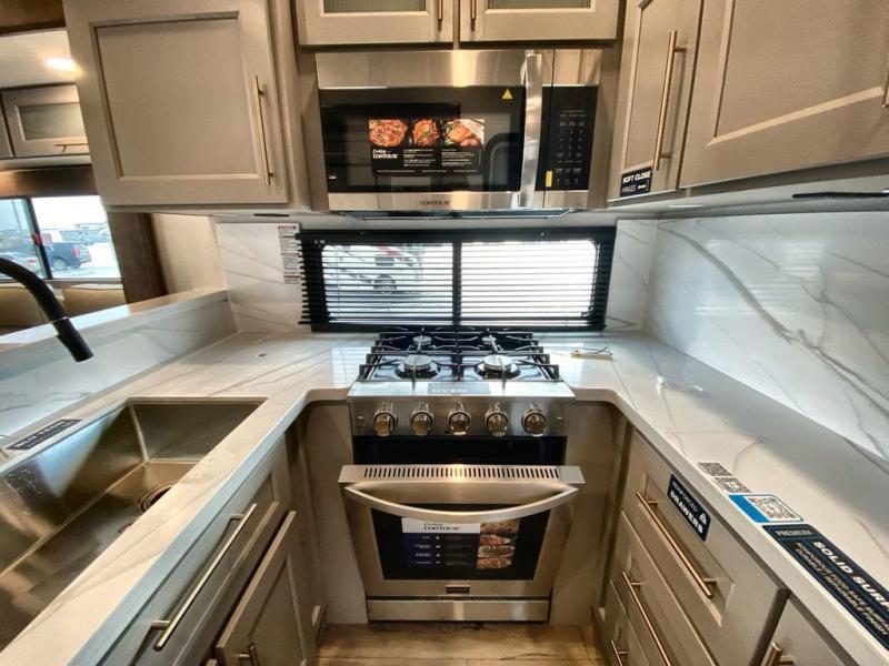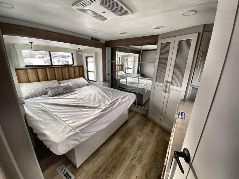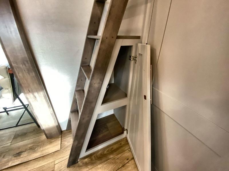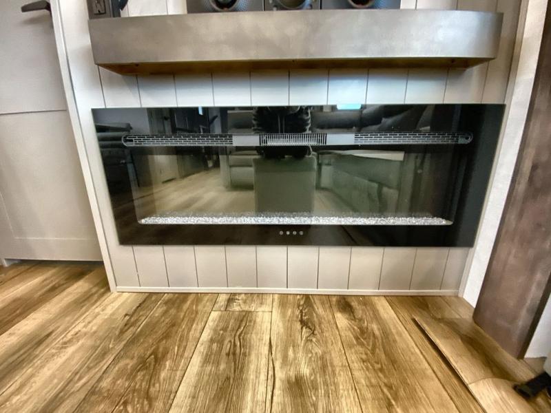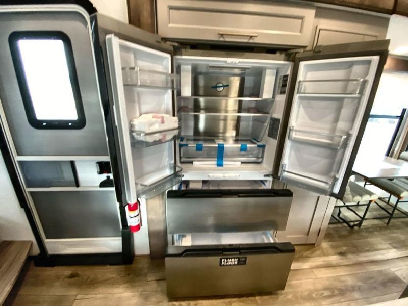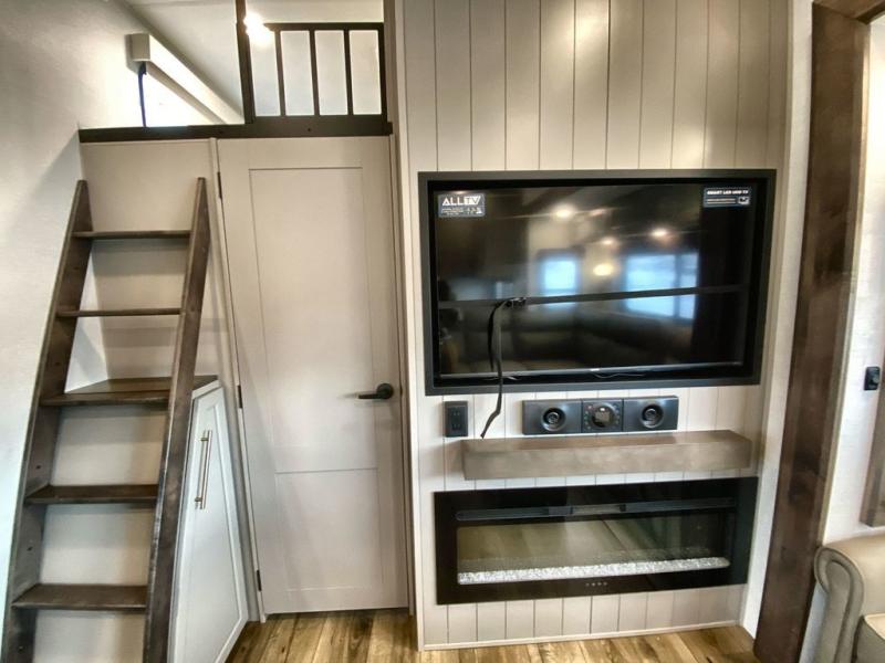 A spacious unit with sleeping for eight with plenty of choices to suit everyone! There is a front private bedroom with a king size bed that offers a large full front closet that has also been prepped for a washer and dryer if you choose that option. The front bath features a 40" x 30" shower and dual entry. Head down to the kitchen and living space at the bottom of the stairs to find a curbside slide that houses the 19 cu. ft. residential refrigerator, a pantry, and a swivel table and desk. As you continue on toward the rear of this coach, you will find a spacious living area along the roadside with a 50" Smart TV and a fireplace, a L-sofa sleeper slide, and a dual reclining loveseat. This makes a great gathering place for television watching, game playing, and even added sleeping space if needed at night. The rear private bedroom with its own private bath features a queen bed, two closets, and a Smart TV as well. The multipurpose loft area above can be accessed just before this rear bedroom entry by a ladder, and it is perfect for extra storage, or it can be used for added sleeping that the kiddos are sure to love.