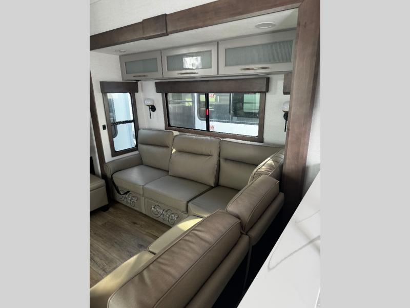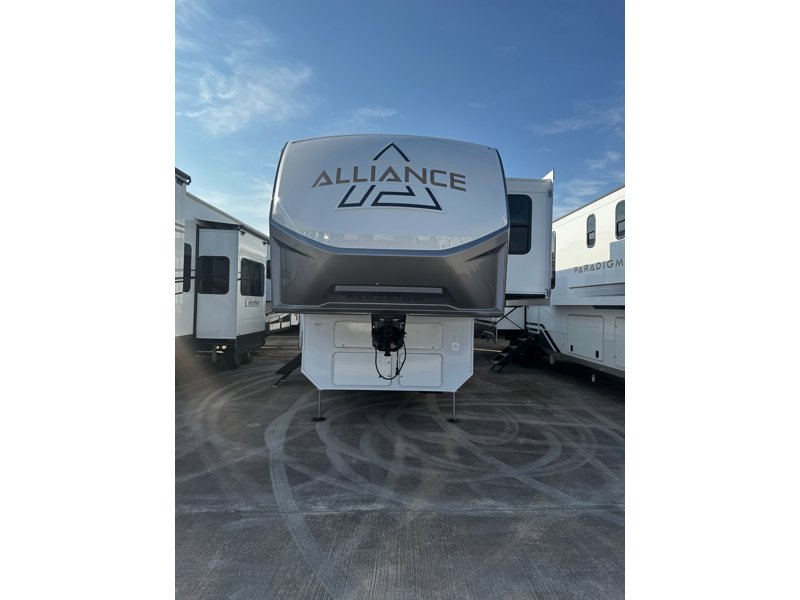 The Paradigm fifth wheels by Alliance RV are functional, high-quality, and luxurious for an unforgettable camping experience. There are three A/C units and a 40K BTU furnace to keep you comfortable year around, and you'll appreciate additional convenient amenities, like the all-in-one enclosed/heated utility center and the color coded and numbered wiring. A Helux Series coil spring pin box comes standard for hassle-free towing, along with Curt 8,000 lb. axles. You'll love the kitchen with its LG solid surface countertops and Lusso range, plus there is LED motion lighting in the pantry and a Maxx fan with a rain sensor to keep everything fresh when making dinner. Each model also includes an HD Smart TV in the living room and bedroom. And of course there are a variety of options you can choose from to further customize your fifth wheel; dual pane windows, Super Solar Plus, slide out awning toppers, and generator prep or a generator to name a few!
