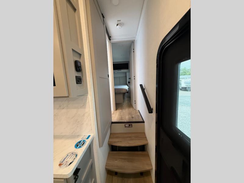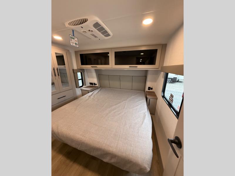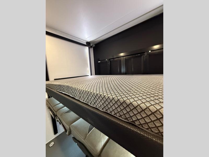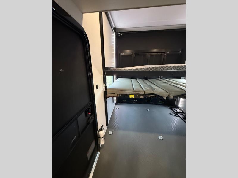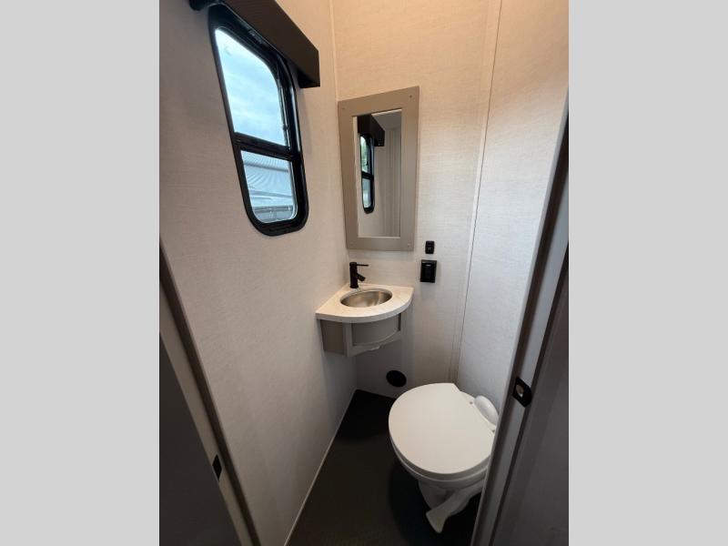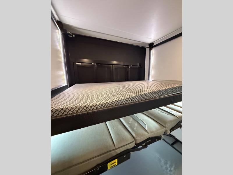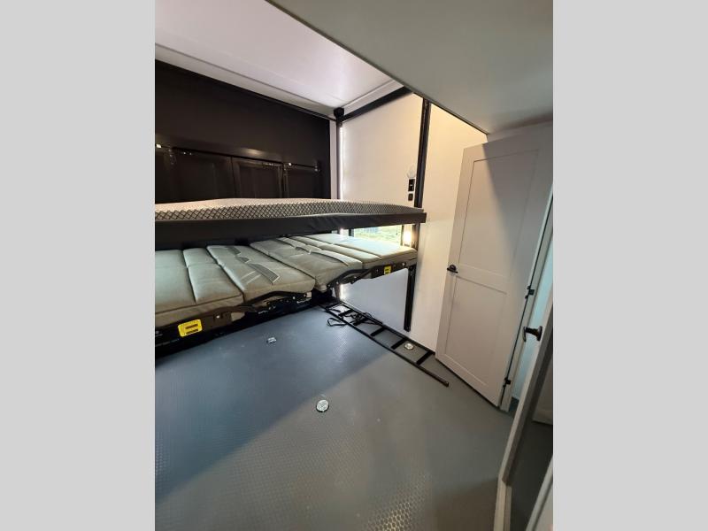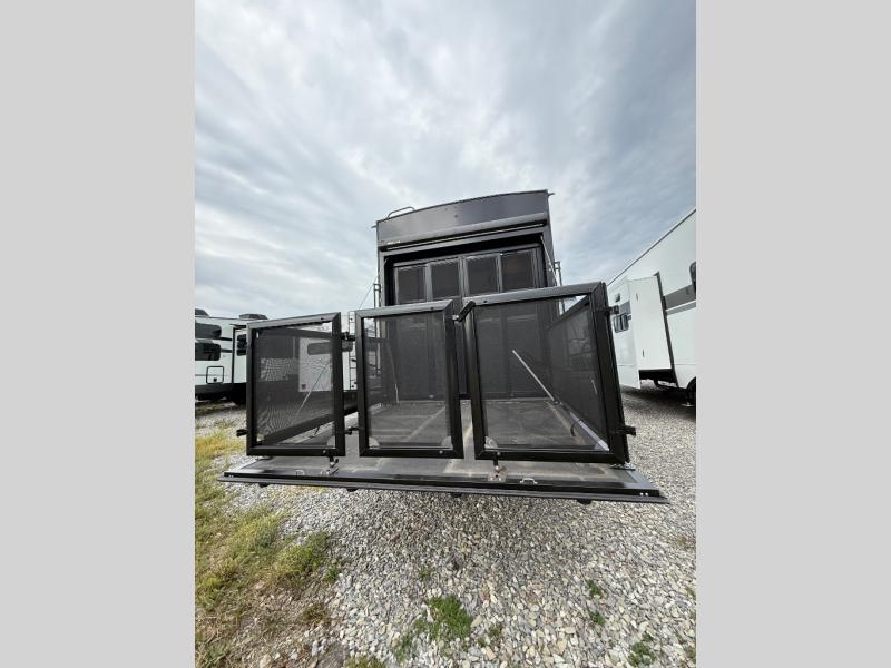 Load up the dirt bikes, pack your bags, and head to the campground in this spacious toy hauler. Once your toys are unloaded using the weather resistant ramp door, relax on the HappiJac roll-over sofas with a folding table in between, and this area can become your guests' bedroom at night since there is a drop-down queen bed, a half bath, plus an additional 30" x 72" bunk/loft bed. You will have the front bedroom all to yourselves that includes a king bed with an optional queen bed plus a wardrobe slide out to keep your space tidy. Everyone can meet in the main living area/kitchen for movie night with the HDTV and sofa slide out, while the chef of makes dinner on the three burner cooktop. There is also a hutch and pantry for storage and a kitchen island for more counter space!