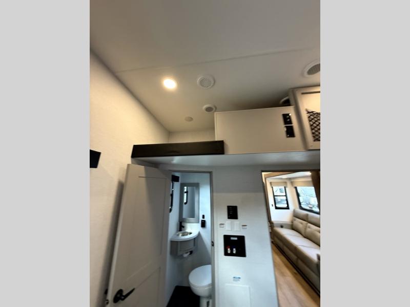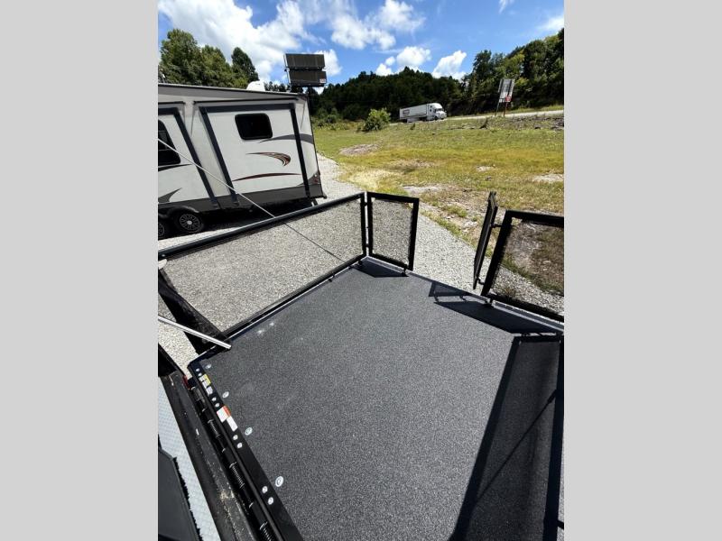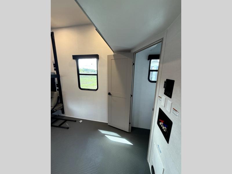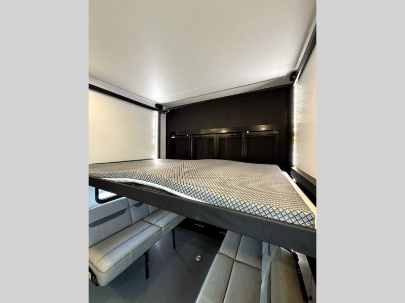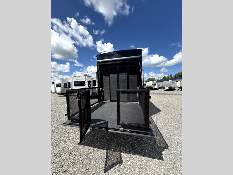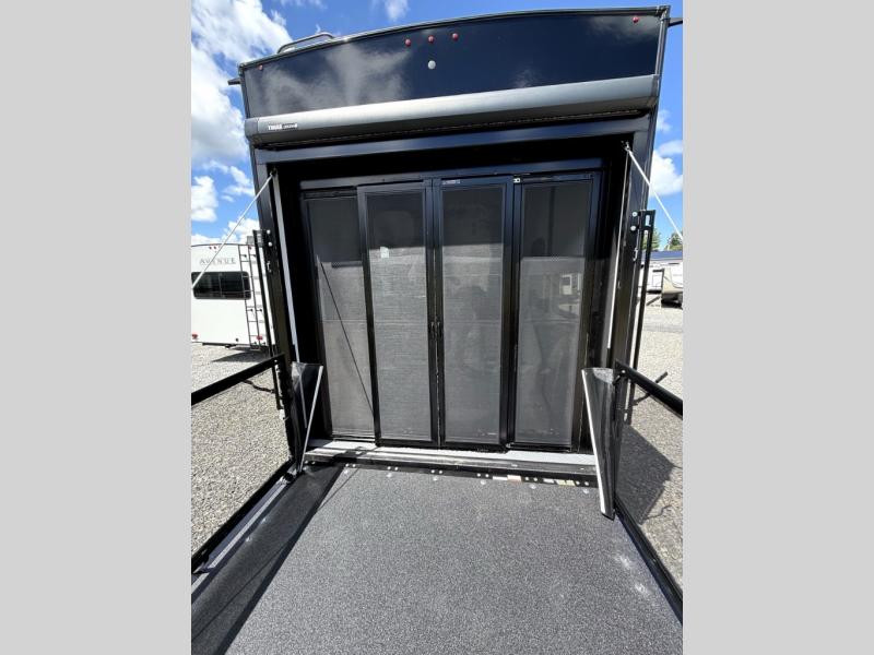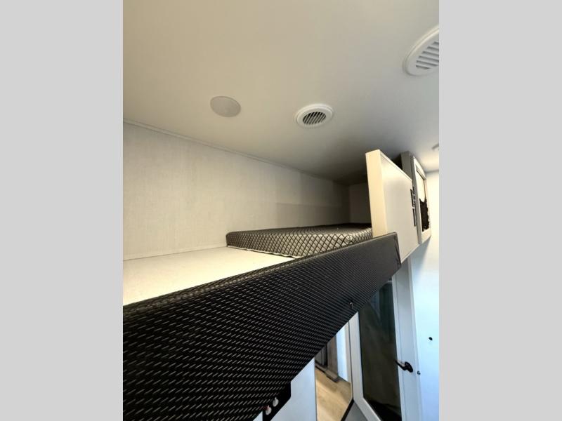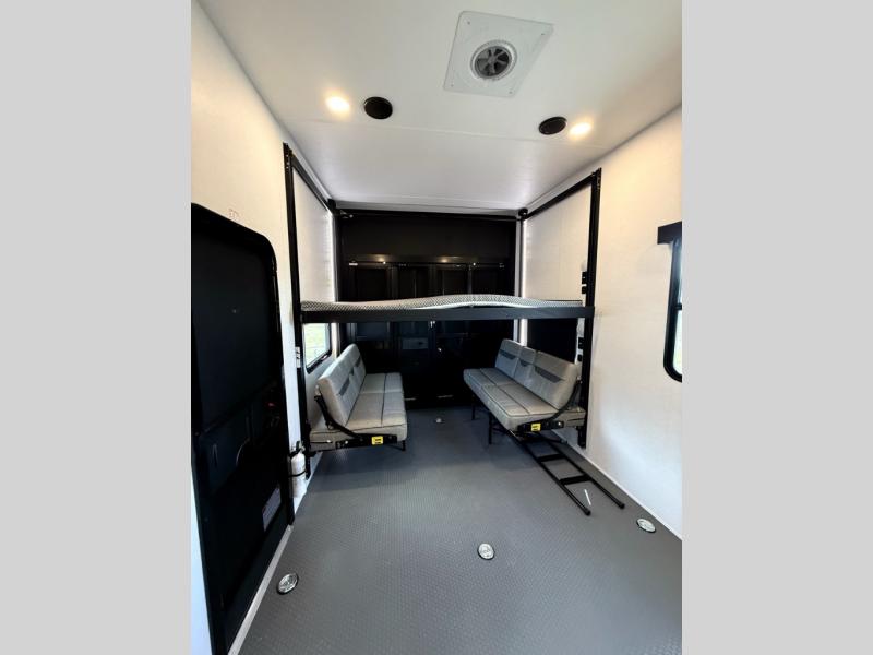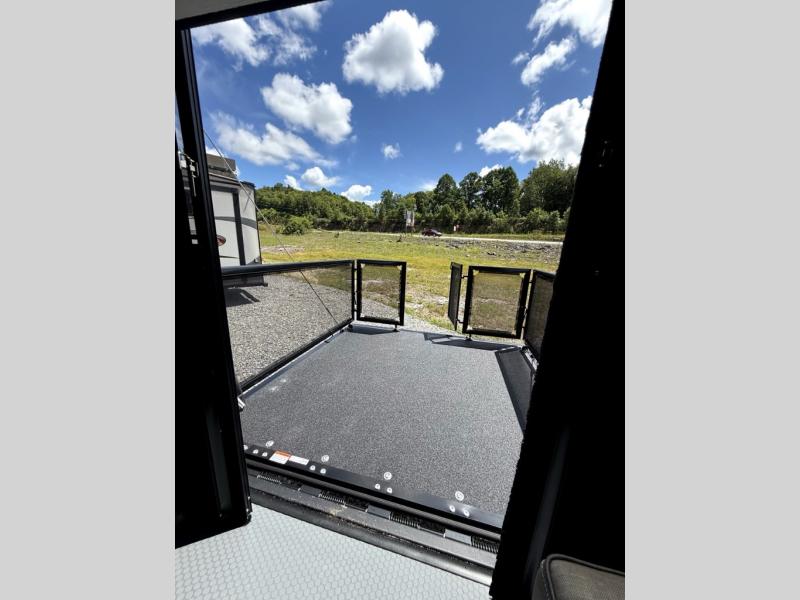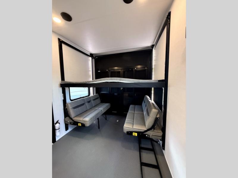 If you're needing more space for your toys, this toy hauler will meet your needs with a 14' separate garage! Once your toys are unloaded using the weather resistant ramp door, relax on the HappiJac roll-over sofas with a folding table in between, and this area can become your guests' bedroom at night since there is a drop-down queen bed, a half bath, plus an additional 30" x 72" bunk/loft bed. You will have the front bedroom all to yourselves that includes a king bed with an optional queen bed plus a wardrobe slide out to keep your space tidy. Everyone can meet in the main living area/kitchen for movie night with the HDTV and sofa slide out, while the chef of makes dinner on the three burner cooktop. There is also a hutch and pantry for storage and a kitchen island for more counter space!