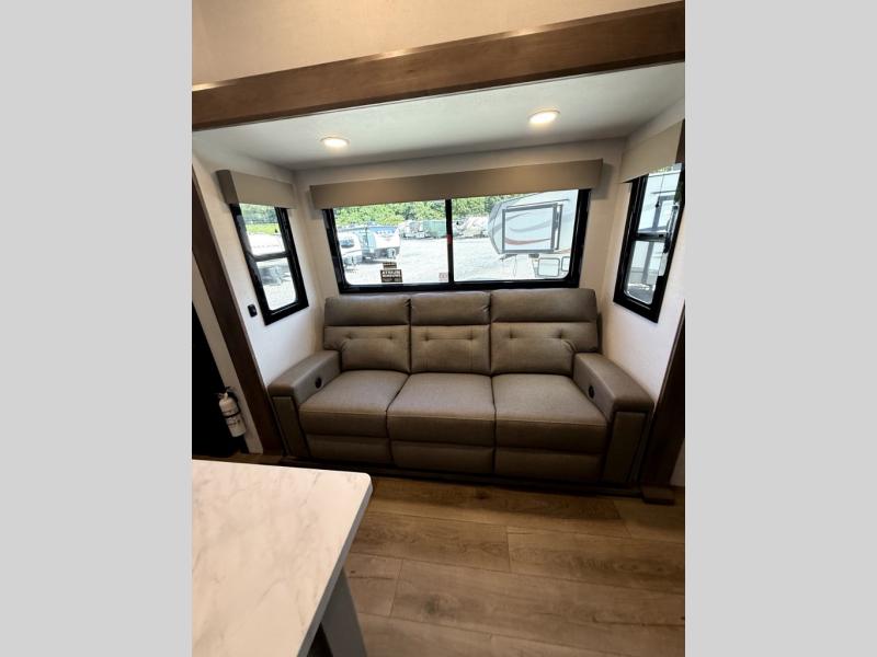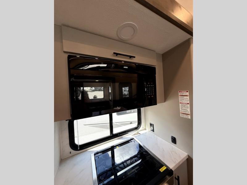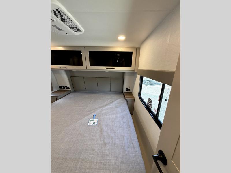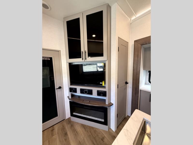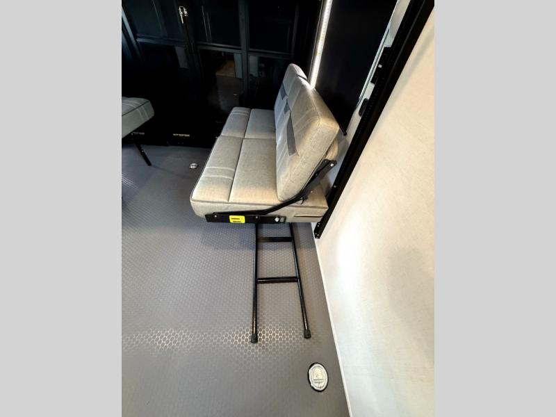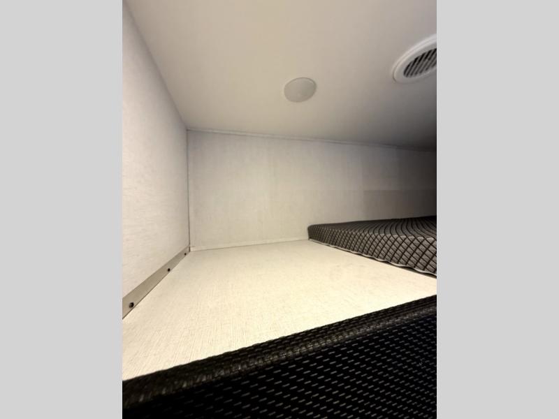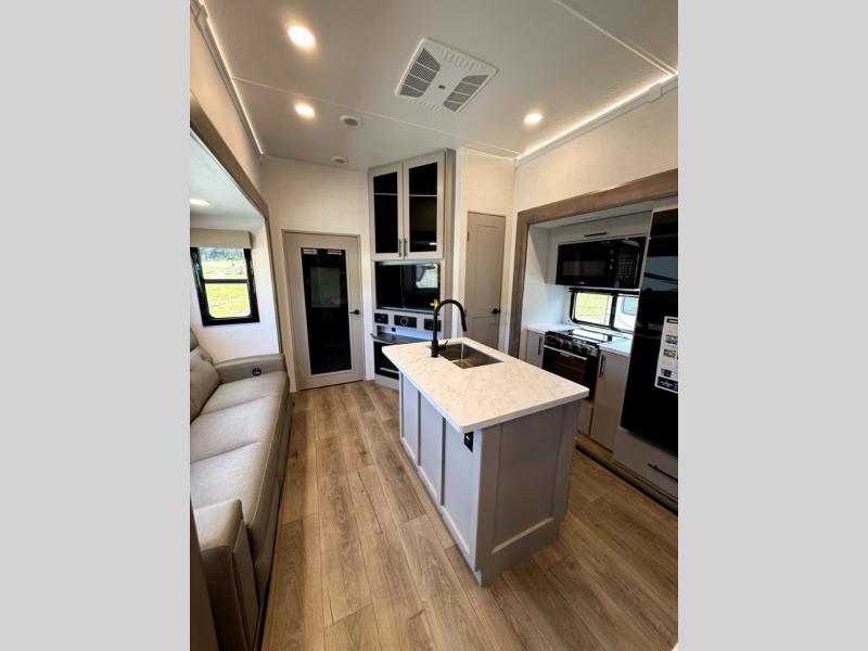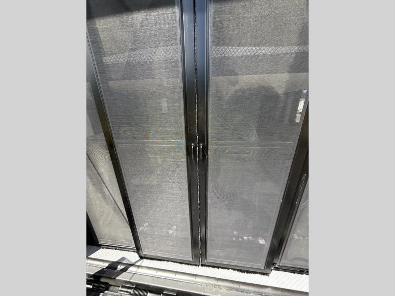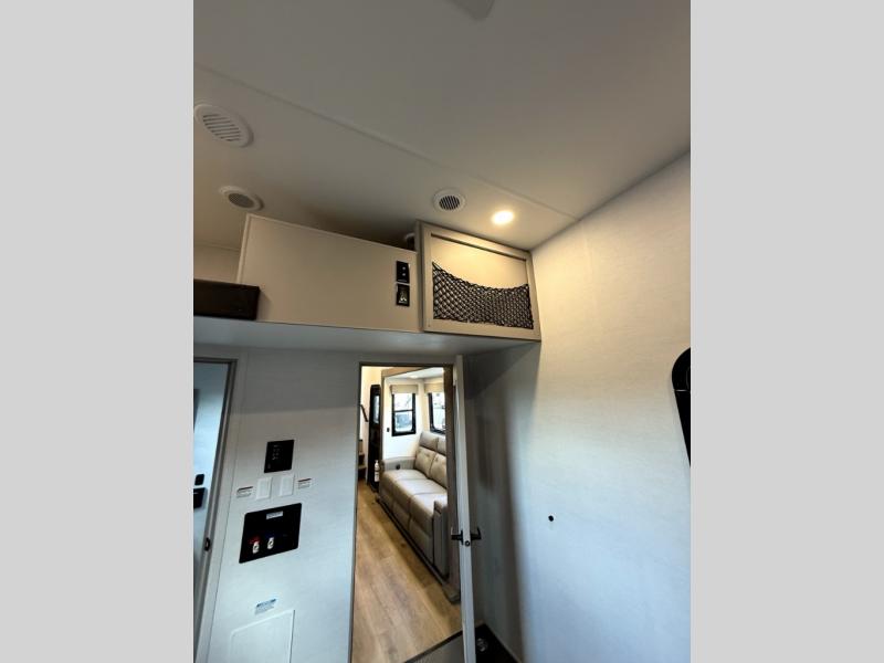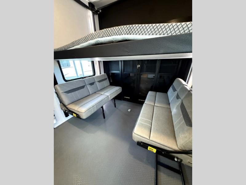 If you're needing more space for your toys, this toy hauler will meet your needs with a 14' separate garage! Once your toys are unloaded using the weather resistant ramp door, relax on the HappiJac roll-over sofas with a folding table in between, and this area can become your guests' bedroom at night since there is a drop-down queen bed, a half bath, plus an additional 30" x 72" bunk/loft bed. You will have the front bedroom all to yourselves that includes a king bed with an optional queen bed plus a wardrobe slide out to keep your space tidy. Everyone can meet in the main living area/kitchen for movie night with the HDTV and sofa slide out, while the chef of makes dinner on the three burner cooktop. There is also a hutch and pantry for storage and a kitchen island for more counter space!