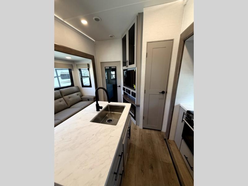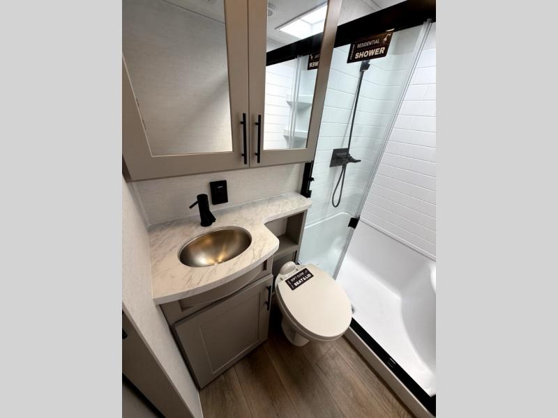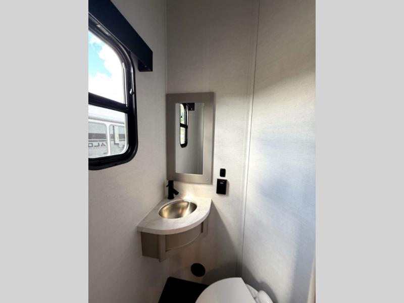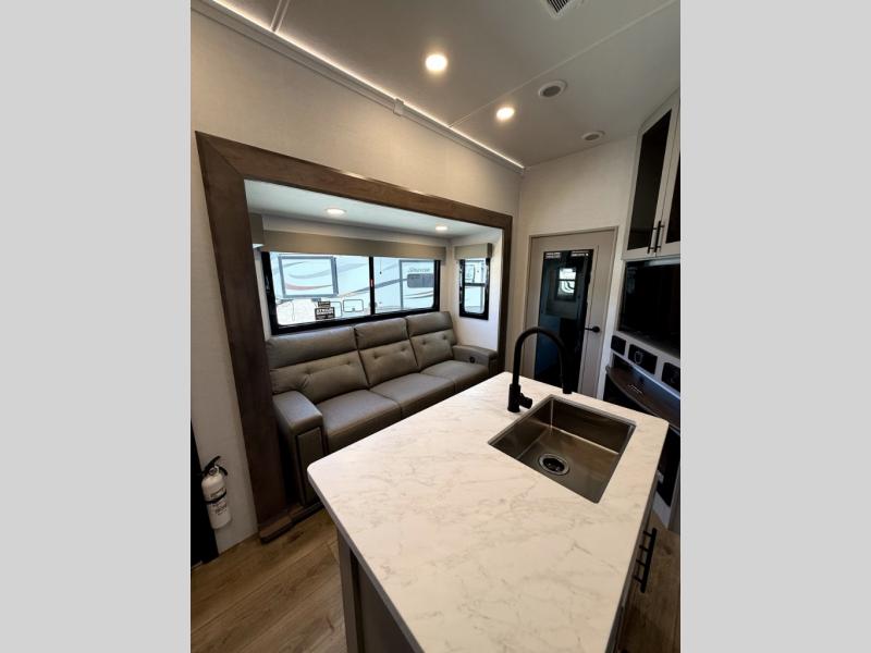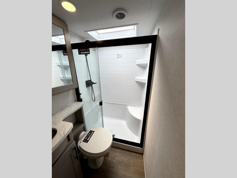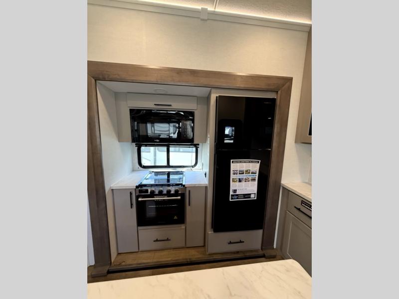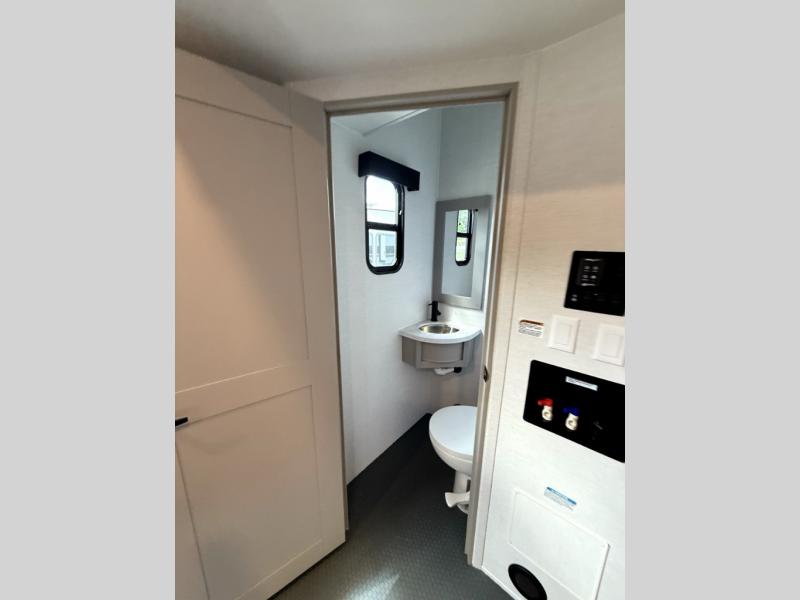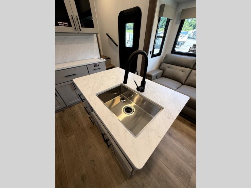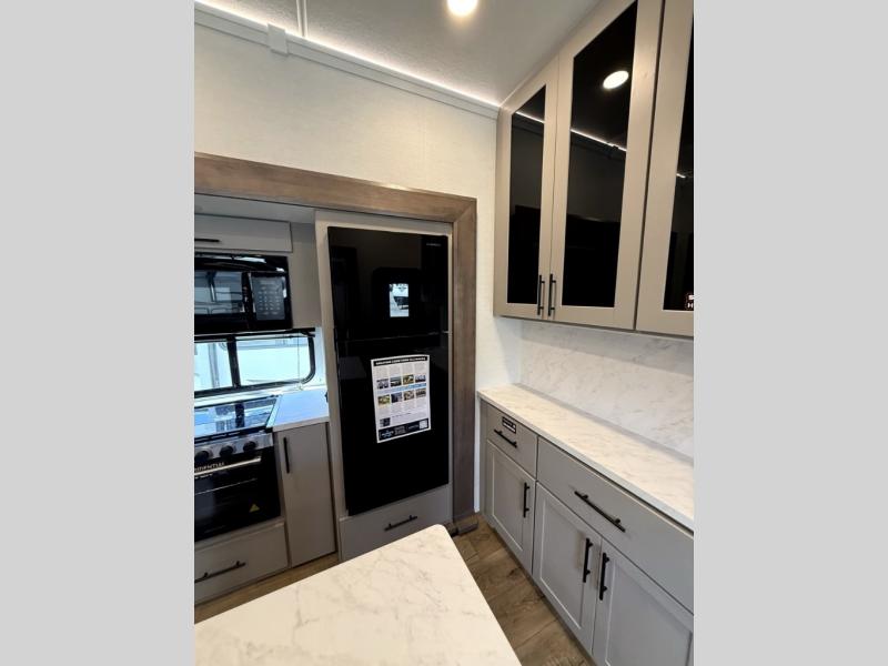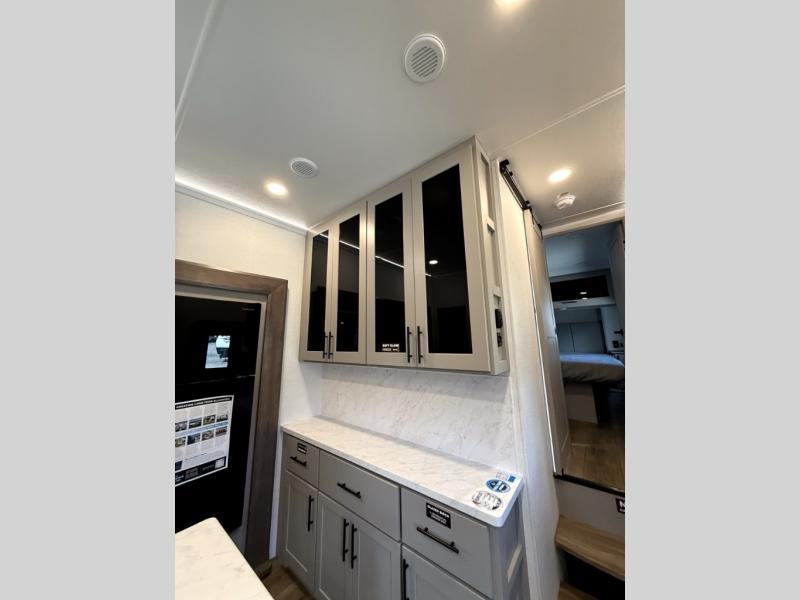 If you're needing more space for your toys, this toy hauler will meet your needs with a 14' separate garage! Once your toys are unloaded using the weather resistant ramp door, relax on the HappiJac roll-over sofas with a folding table in between, and this area can become your guests' bedroom at night since there is a drop-down queen bed, a half bath, plus an additional 30" x 72" bunk/loft bed. You will have the front bedroom all to yourselves that includes a king bed with an optional queen bed plus a wardrobe slide out to keep your space tidy. Everyone can meet in the main living area/kitchen for movie night with the HDTV and sofa slide out, while the chef of makes dinner on the three burner cooktop. There is also a hutch and pantry for storage and a kitchen island for more counter space!