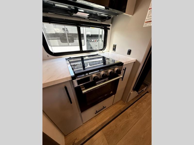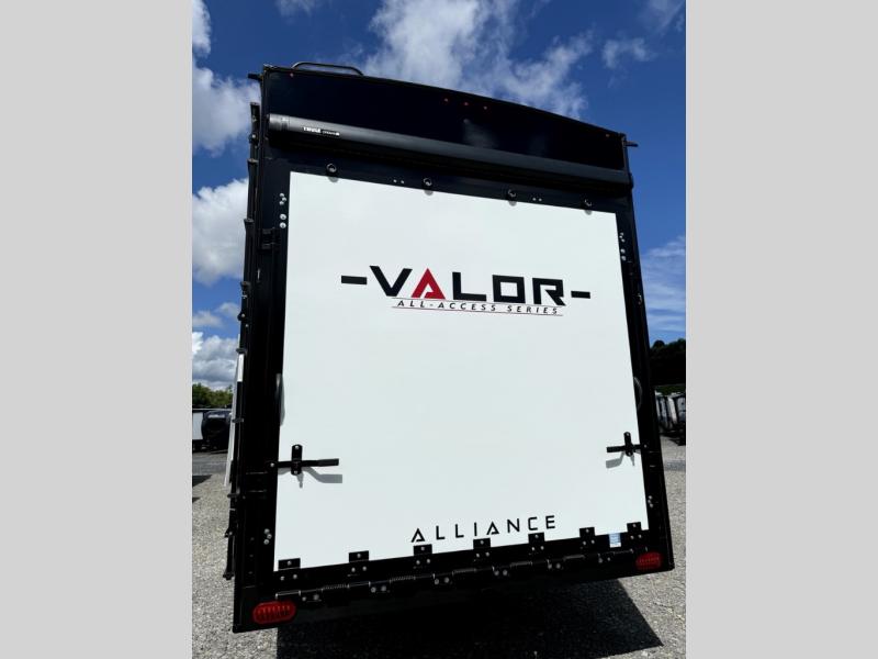 With any Valor All-Access toy hauler by Alliance RV you will be getting a travel trailer or fifth wheel with exceptional features at a great value! There is a painted fiberglass front cap, Mylar reinforced exterior seals, Azdel-backed fiberglass sidewalls, and a walk-on roof with a seamless PVC roof covering for added strength and durability. The 101" wide-body Benchmark chassis means you can bring along your larger toys, and the multipoint tie-down system will keep your toys safe and secure on the way to the campground. All of your power needs will be met with the Masters of 12 Volt Package that includes a 12V JBL sound system and USB charging stations throughout, plus the Off The Grid Pack comes with a 400 watt solar panel, 40 amp charge controller, and generator prep to keep you going all week long. Some of the interior comforts you'll enjoy are commercial grade vinyl flooring with no carpet so you can easily clean up, black cabinetry hardware, residential LED recessed ceiling lights, and so much more!