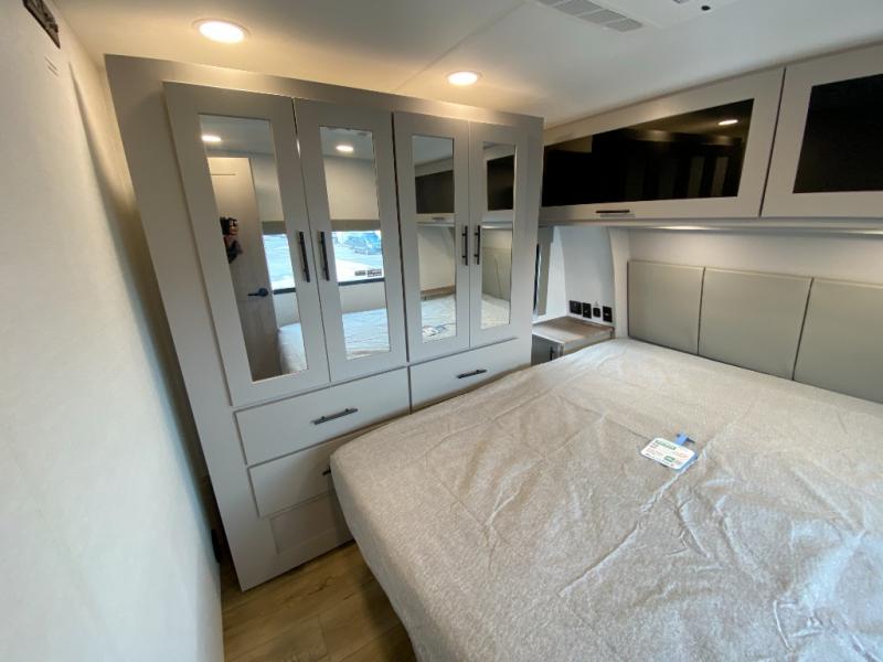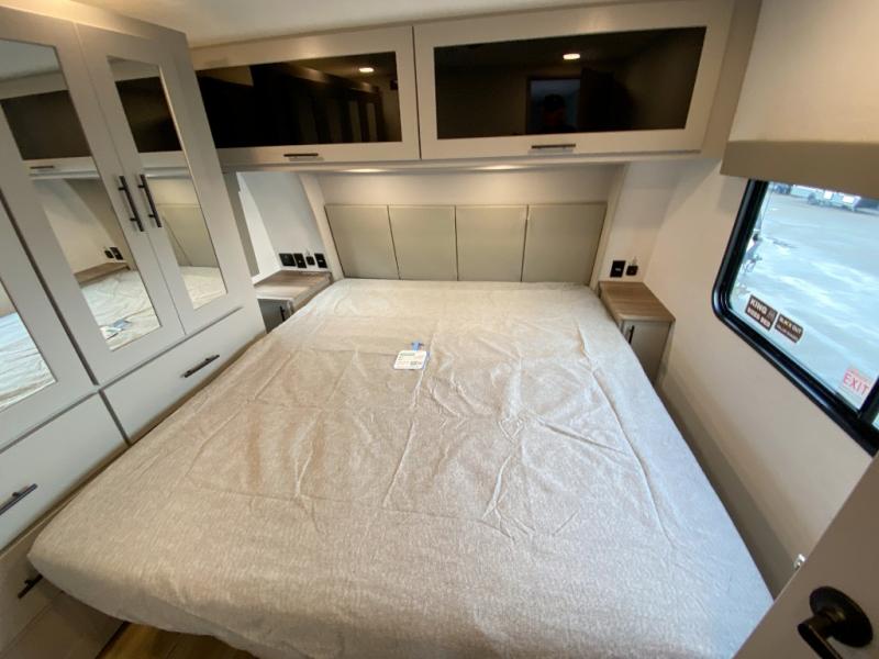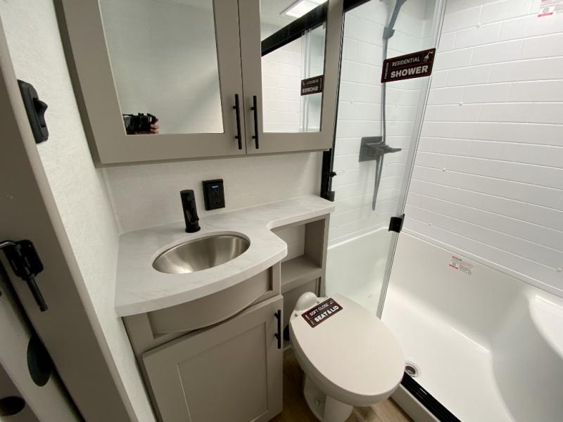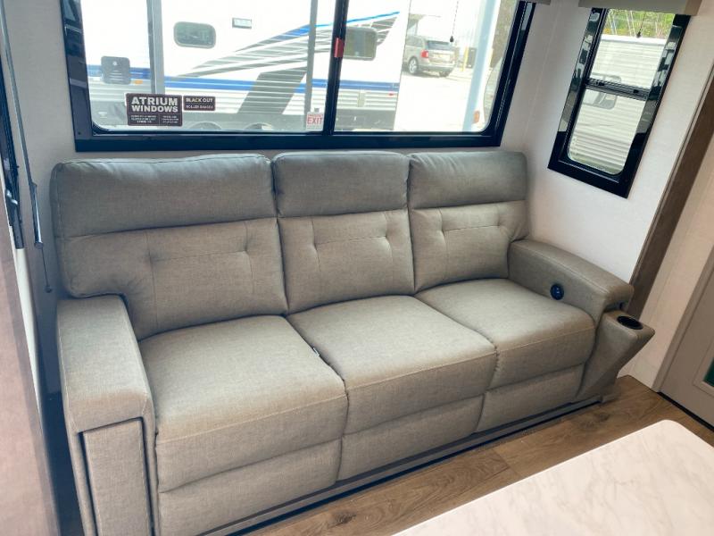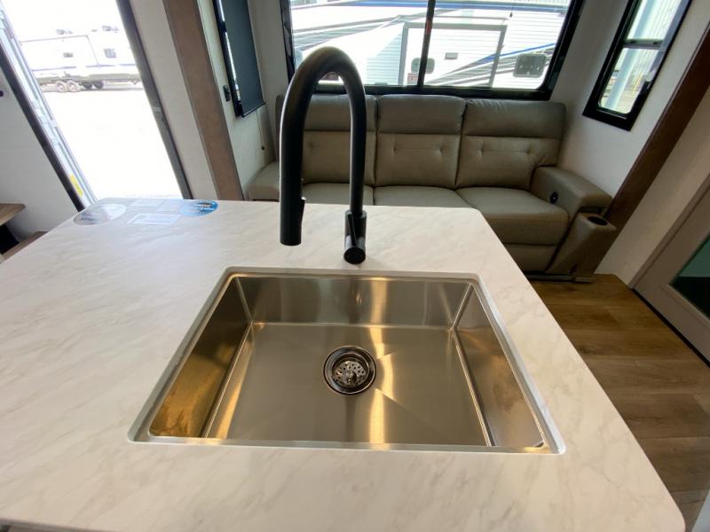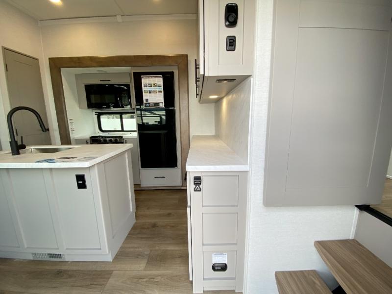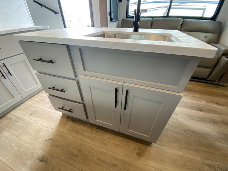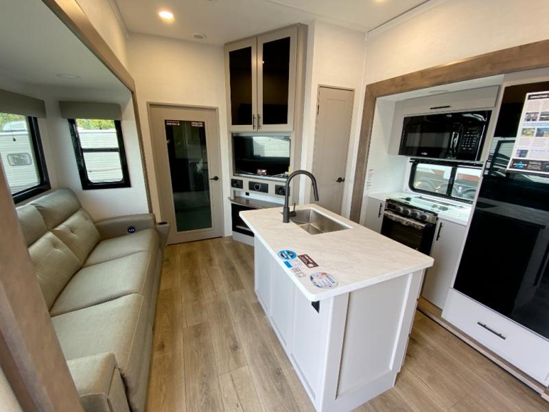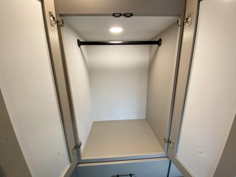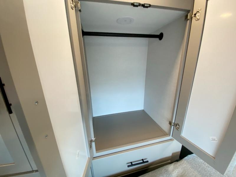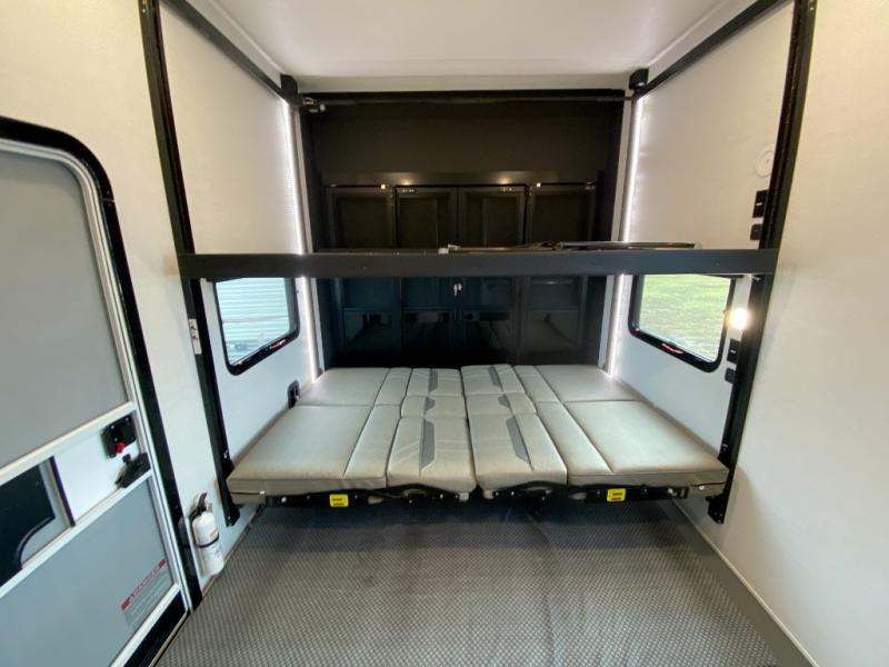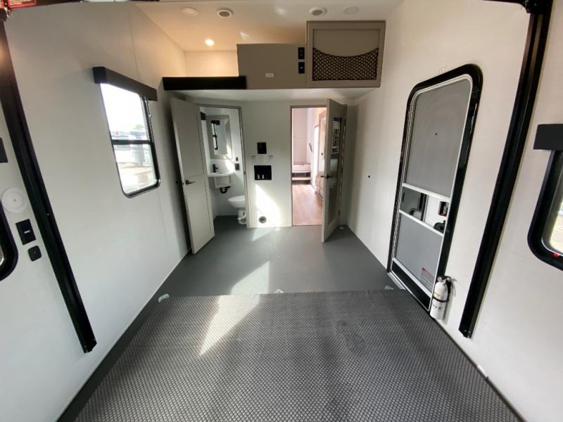 If you're needing more space for your toys, this toy hauler will meet your needs with a 14' separate garage! Once your toys are unloaded using the weather resistant ramp door, relax on the HappiJac roll-over sofas with a folding table in between, and this area can become your guests' bedroom at night since there is a drop-down queen bed, a half bath, plus an additional 30" x 72" bunk/loft bed. You will have the front bedroom all to yourselves that includes a king bed with an optional queen bed plus a wardrobe slide out to keep your space tidy. Everyone can meet in the main living area/kitchen for movie night with the HDTV and sofa slide out, while the chef of makes dinner on the three-burner cooktop. There is also a hutch and pantry for storage and a kitchen island for more counter space!