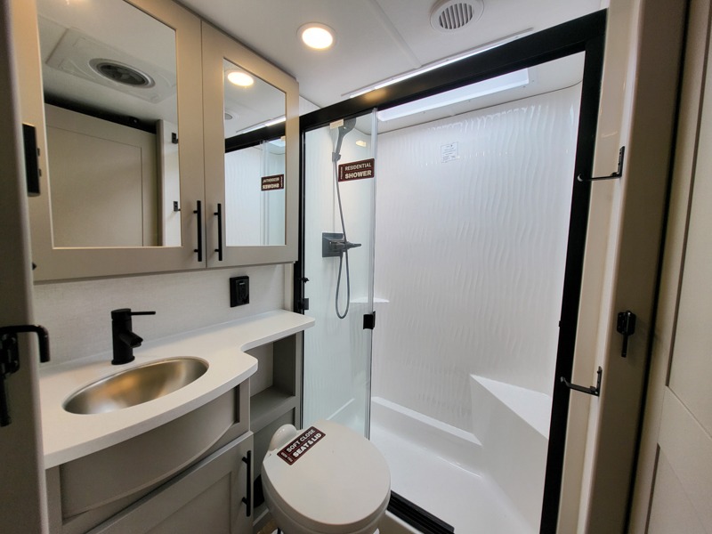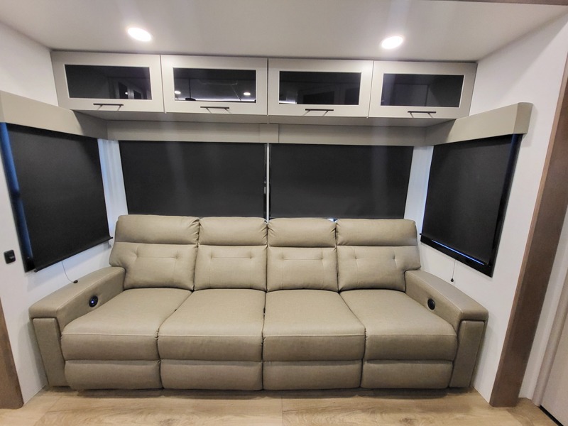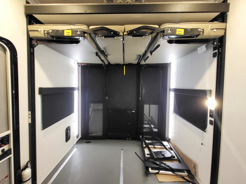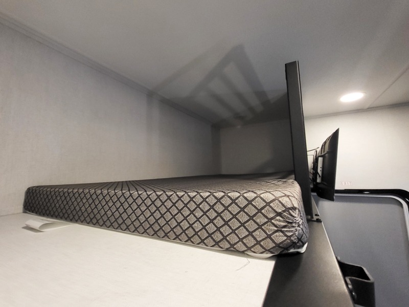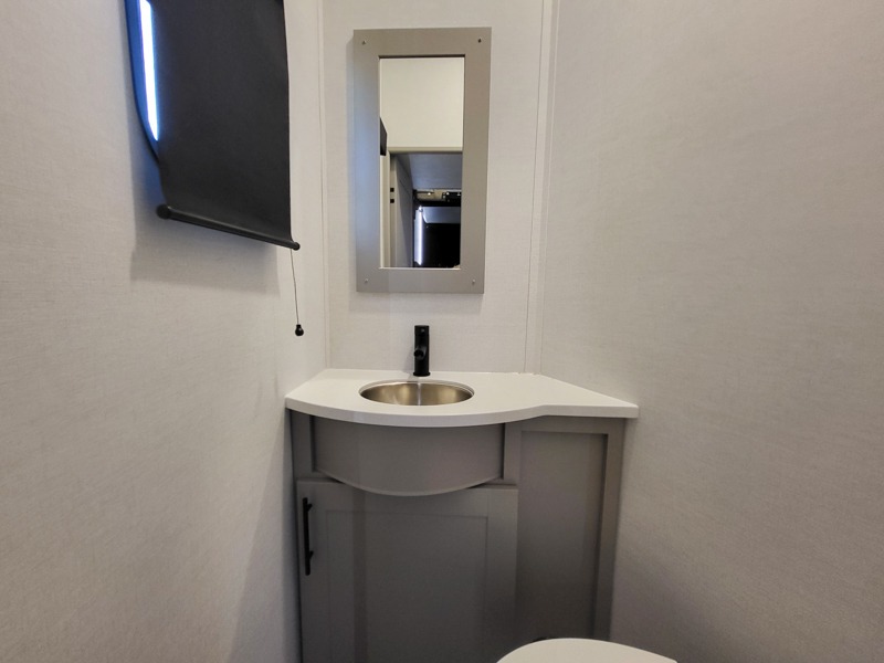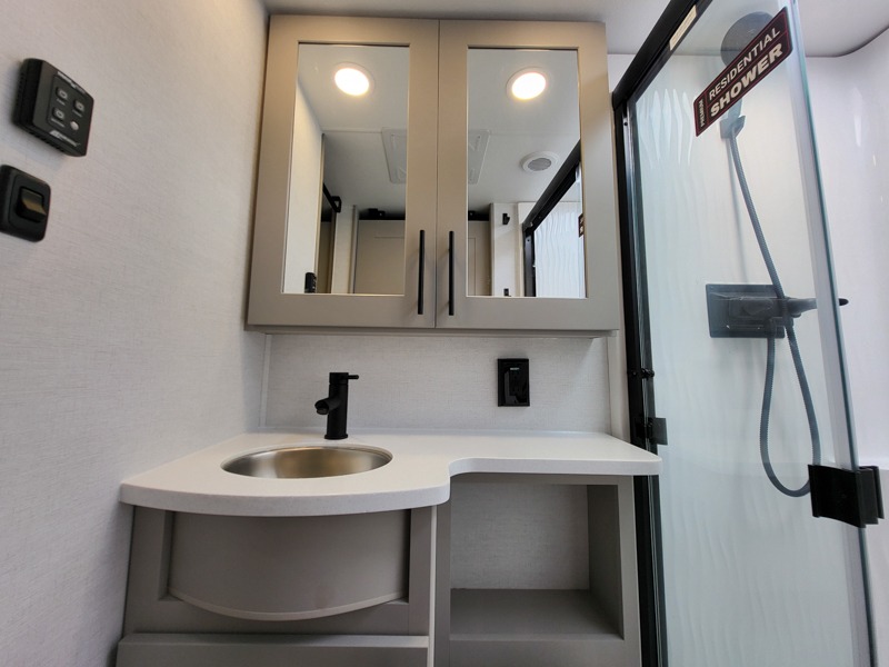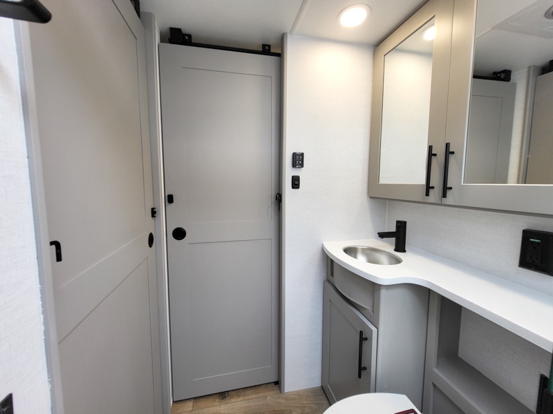 Once you've unloaded your toys, the garage area easily transforms into a spacious living area. The opposing HappiJac sofas provide ample seating, and the drop-down queen mattress offers extra sleeping space when needed. Above the living area, a loft opens to the living room, perfect for additional storage or a cozy sleeping nook. The half bathroom adds convenience for your guests.