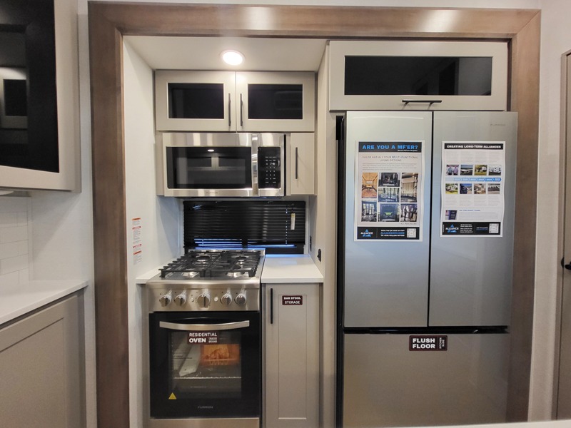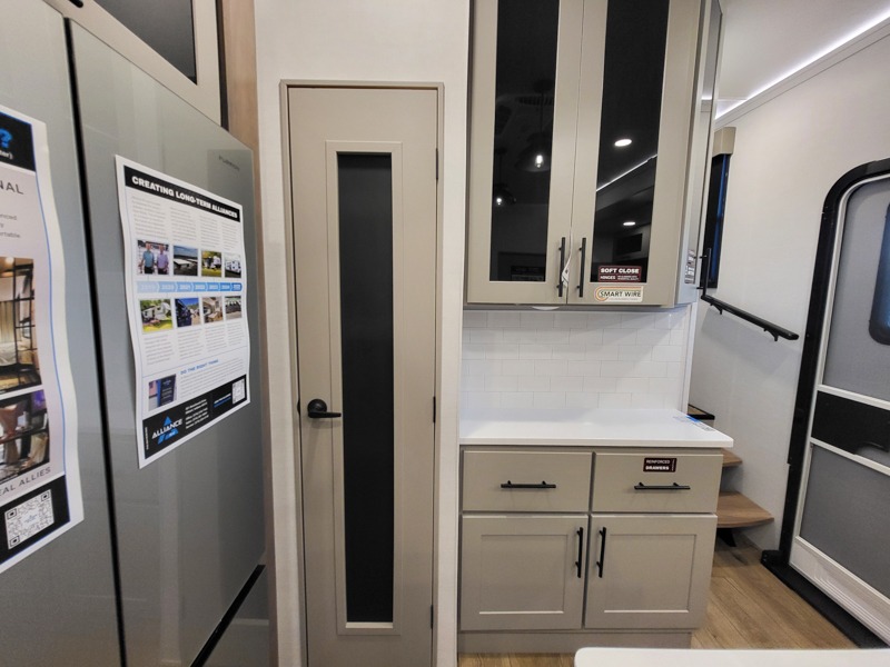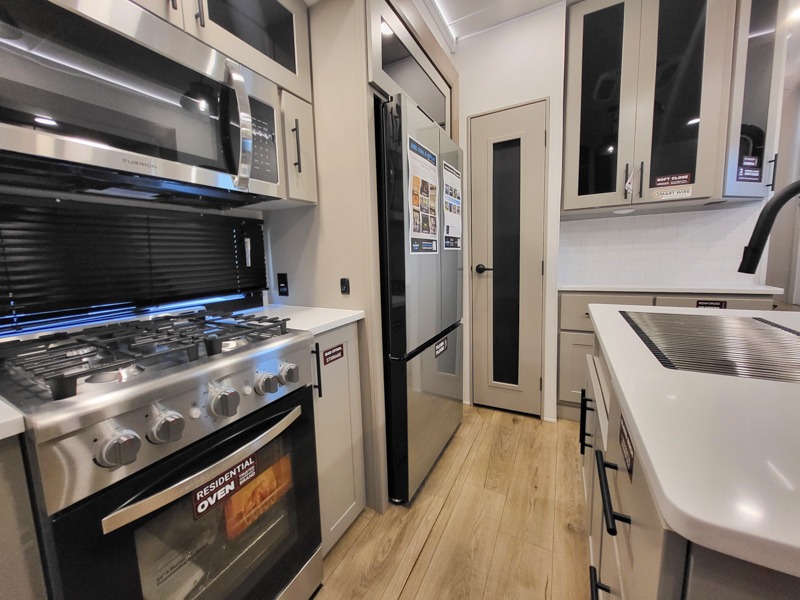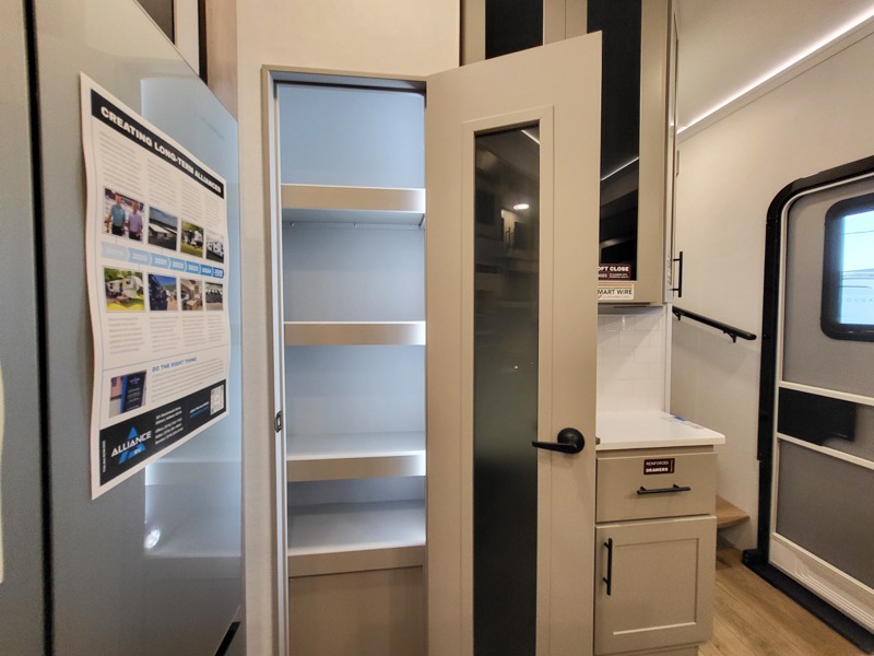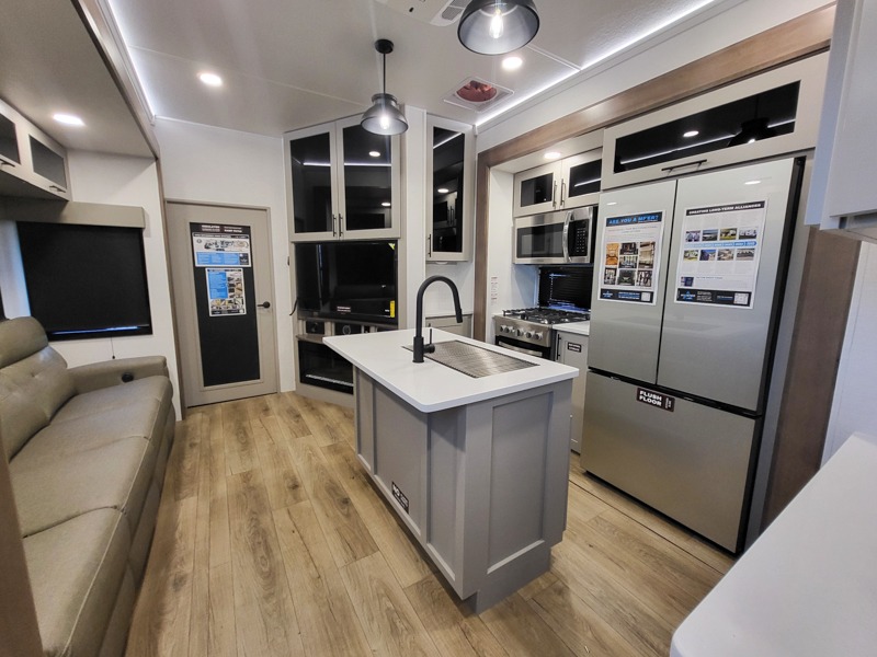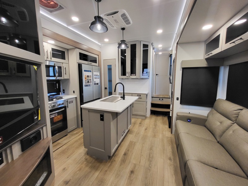 The kitchen is fully equipped to prepare your best meals with two hutches, three pantries, and a kitchen island with two bar stools for a casual dining experience. The dual-entry bathroom includes a 48" x 30" shower and provides direct access to the private front bedroom, ensuring your comfort and privacy. Inside the bedroom, the king bed slide-out gives you extra floor space, while a flip-top dresser and a large front wardrobe (prepped for an optional washer/dryer) provide ample storage.