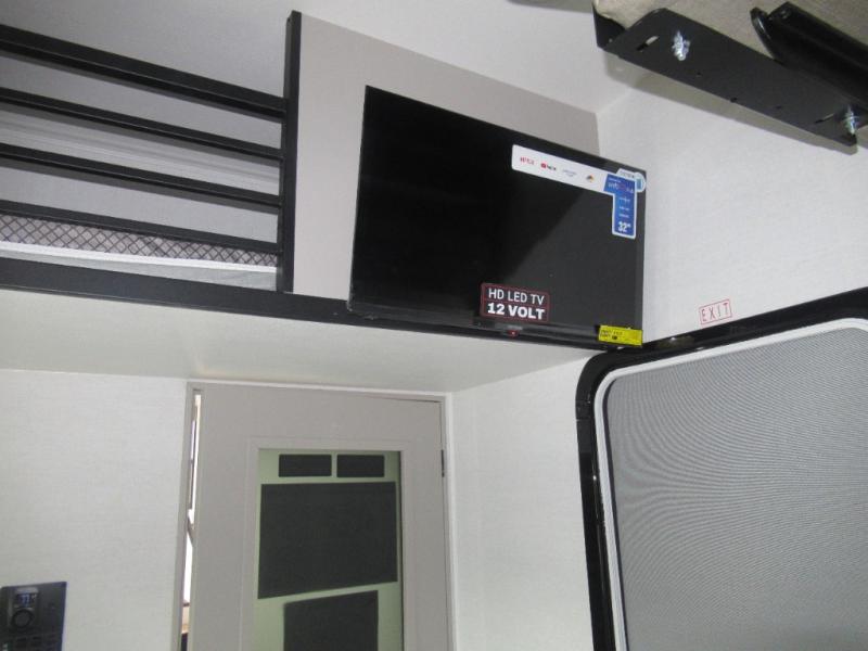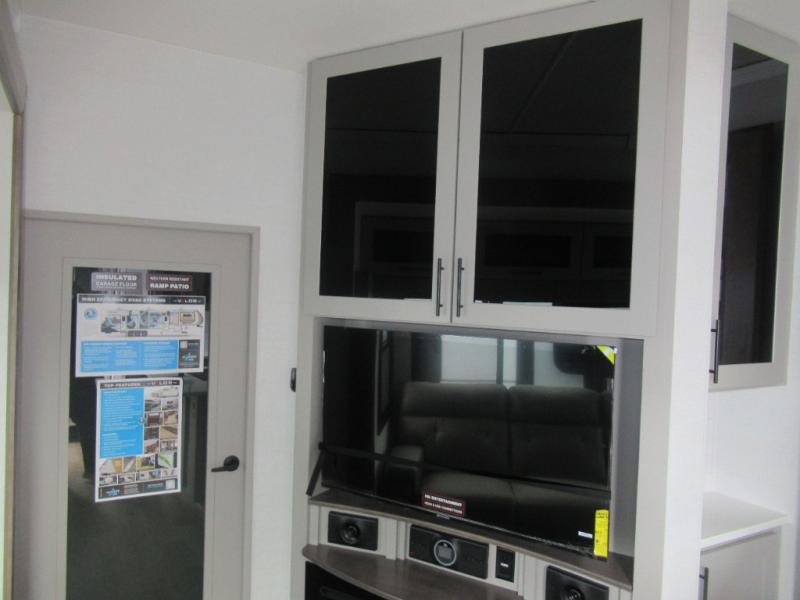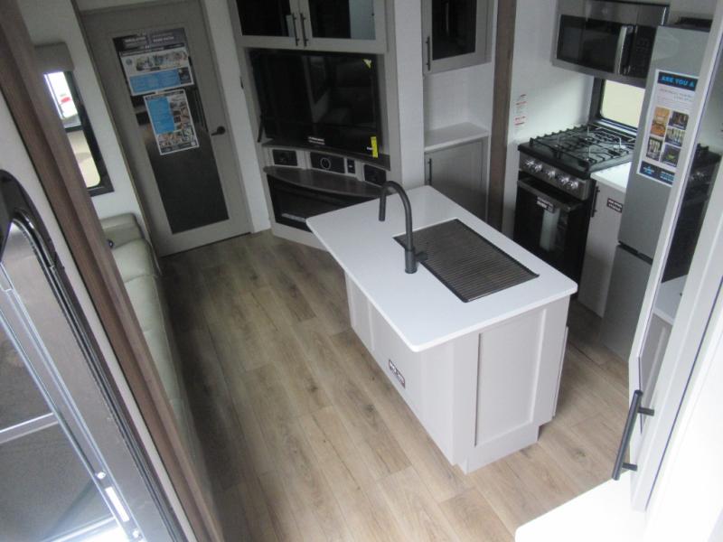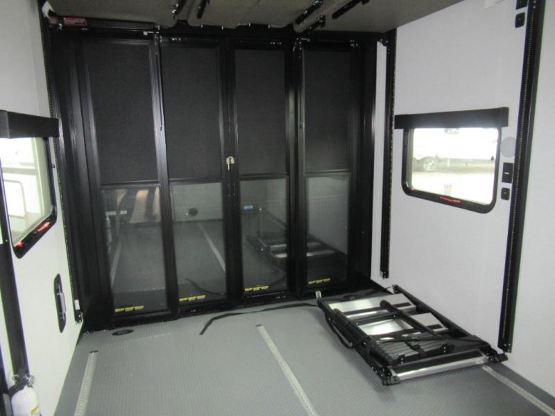 The whole family will have a fun time camping in this toy hauler! You can easily load up your toys into the 11' garage area with the 8' weather resistant ramp door and keep them filled with the dual 30 gallon fuel tanks. Once you unload your toys from the garage area, you can set up the opposing HappiJac sofas with a queen mattress above them, the loft that opens to the living room, and the half bathroom. The kitchen has everything you need to prepare your best meals including two hutches, three pantries, and a kitchen island with two bar stools to enjoy your morning coffee and eggs. The dual entry bathroom has a 48" x 30" shower and leads directly into the front private bedroom. Inside the bedroom is a king bed slide for more floor space, a flip top dresser, and a front wardrobe with washer and dryer prep!