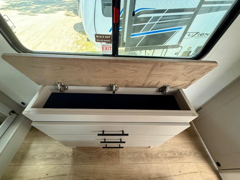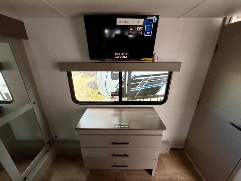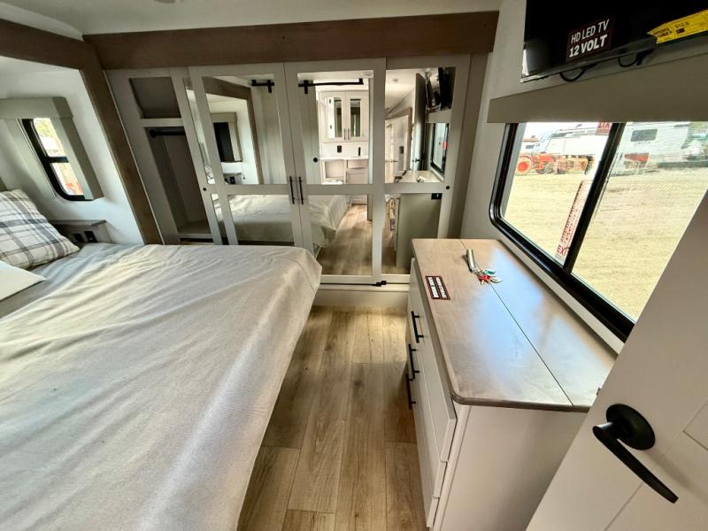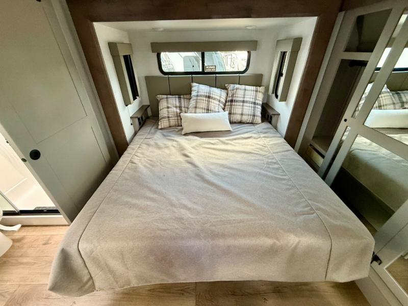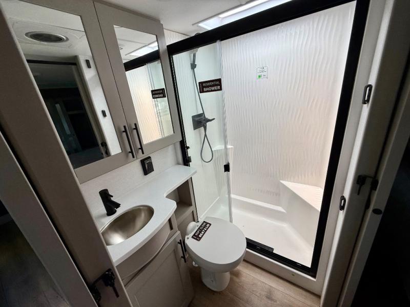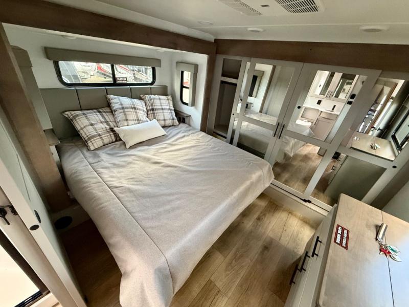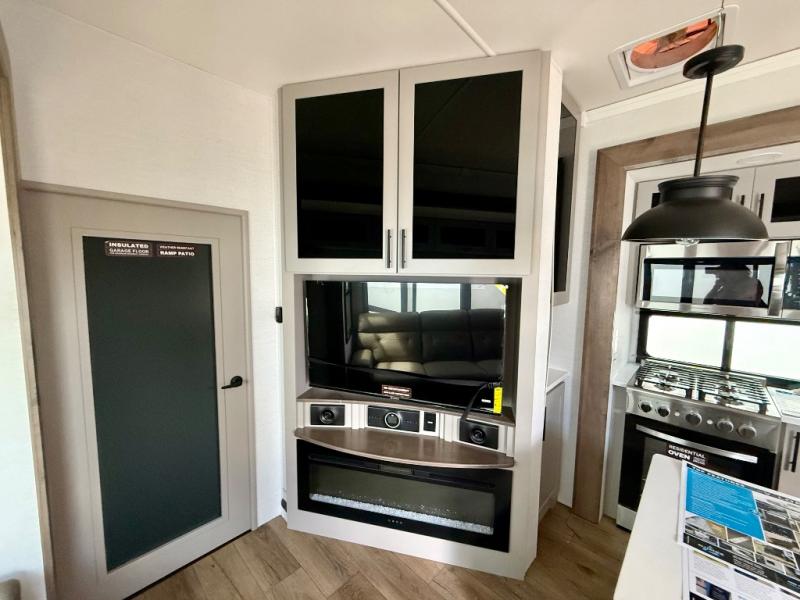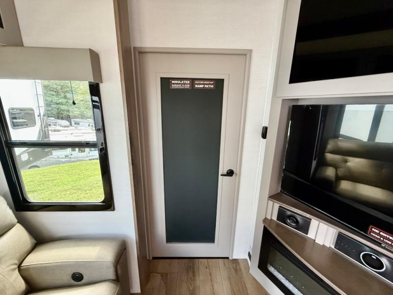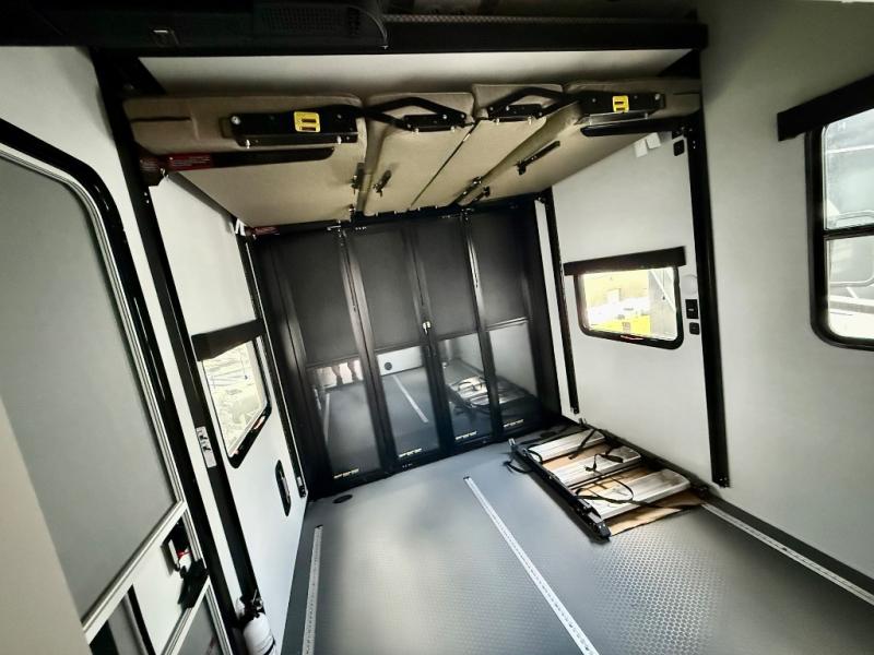 You can bring your toys with you wherever you go with any one of these Alliance RV Valor toy hauler fifth wheels! They are adventure-ready with a quality build from the walk on roof with seamless PVC roof covering to the commercial grade vinyl flooring and MorRyde CRE3000 suspension system. The Performance Running Gear package comes with a 101" wide-body benchmark chassis platform, 7,000 lb. Dexter axles, and a space enhancing drop frame storage compartment to pack in all your riding gear. You can even go off-gridding thanks to the Off the Grid Pack that has two 400 watt solar panels, generator prep, a 40 amp charge controller, and a 100 amp hour lithium iron phosphate battery. Some of the interior comforts you will enjoy are the hardwood cabinet doors and drawers, solid surface kitchen countertops, and commercial grade vinyl flooring with no carpet to make clean up a breeze. The Valor toy haulers are also the Masters of 12 Volt with USB charging station throughout, a stainless steel refrigerator, and more 12 volt features to make camping hassle-free!