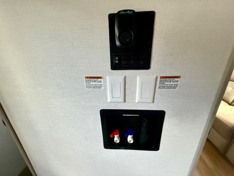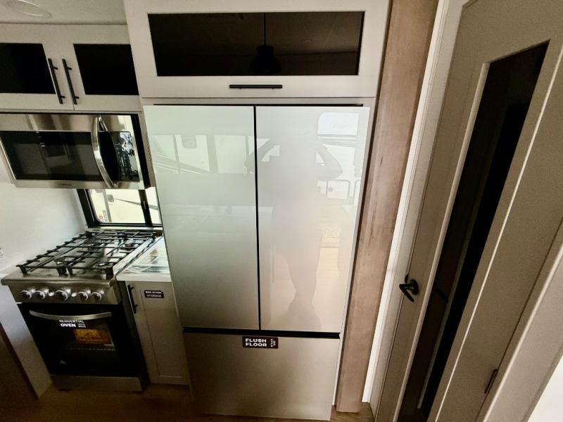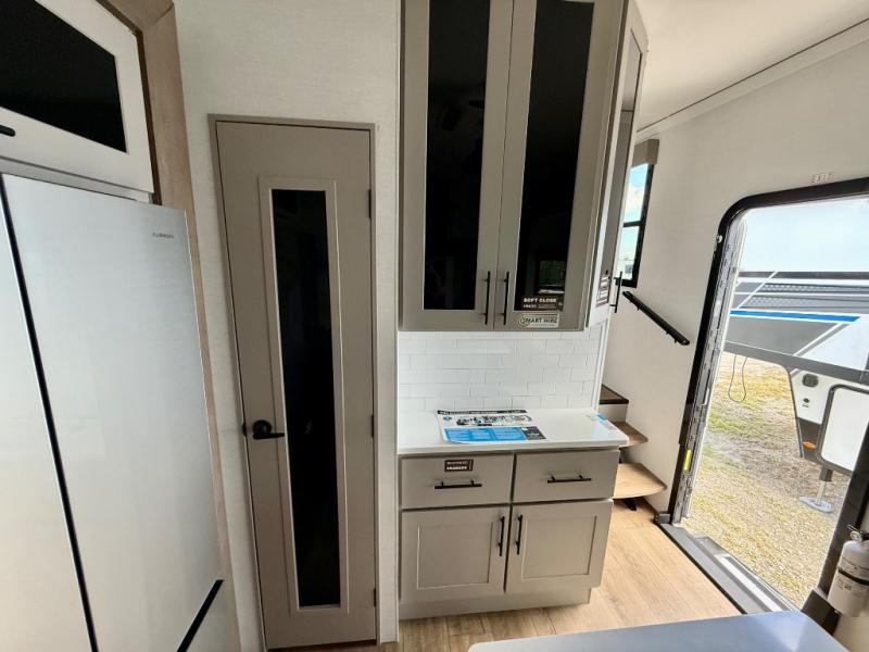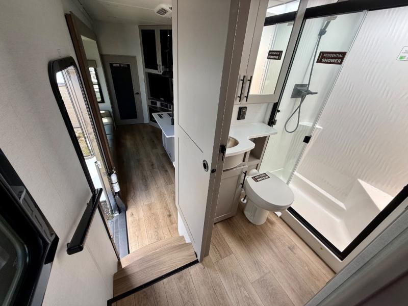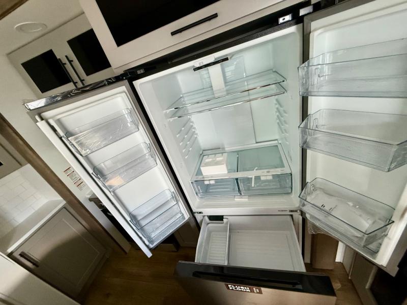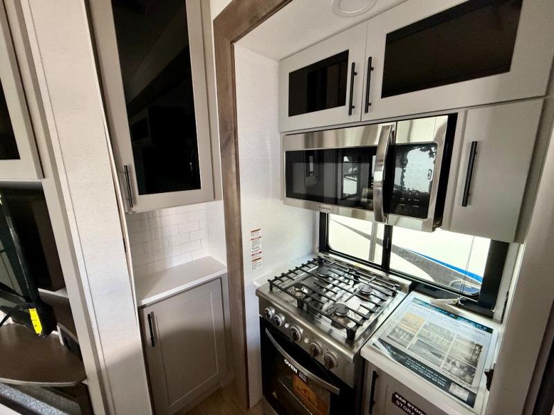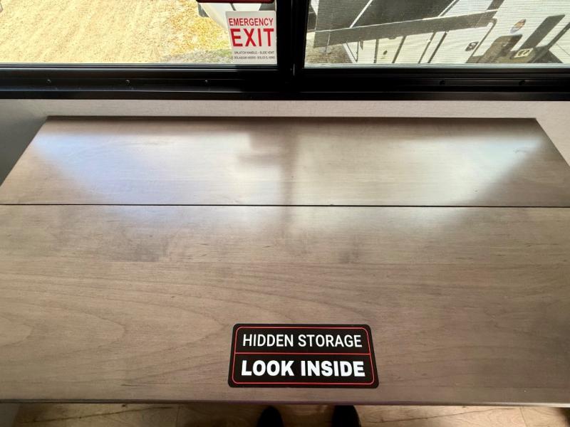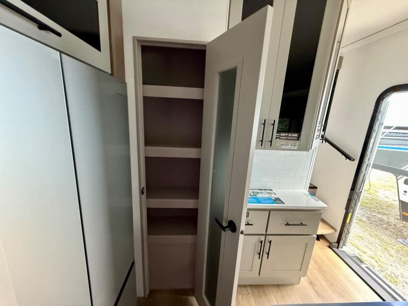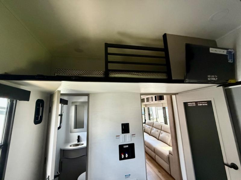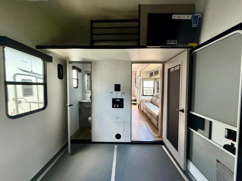 The whole family will have a fun time camping in this toy hauler! You can easily load up your toys into the 11' garage area with the 8' weather resistant ramp door and keep them filled with the dual 30 gallon fuel tanks. Once you unload your toys from the garage area, you can set up the opposing HappiJac sofas with a queen mattress above them, the loft that opens to the living room, and the half bathroom. The kitchen has everything you need to prepare your best meals including two hutches, three pantries, and a kitchen island with two bar stools to enjoy your morning coffee and eggs. The dual entry bathroom has a 48" x 30" shower and leads directly into the front private bedroom. Inside the bedroom is a king bed slide for more floor space, a flip top dresser, and a front wardrobe with washer and dryer prep!