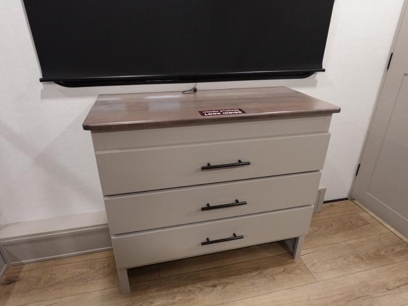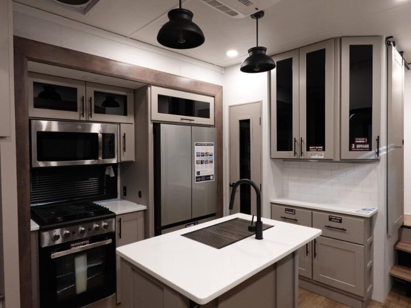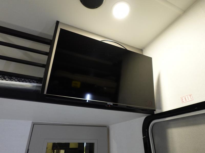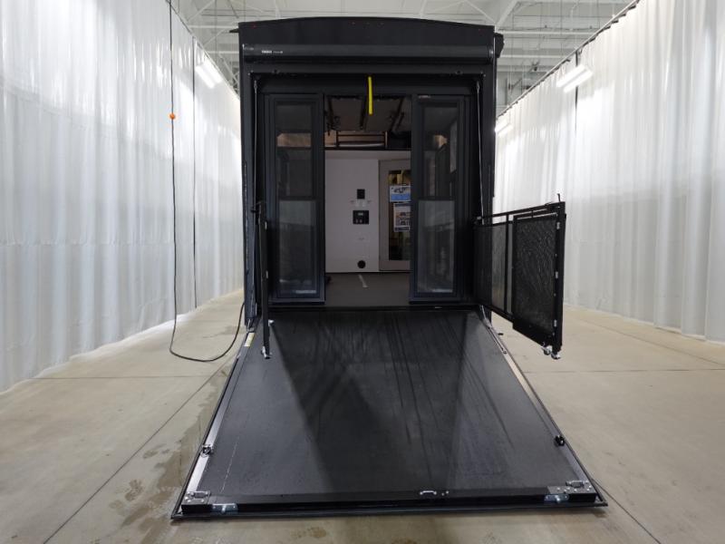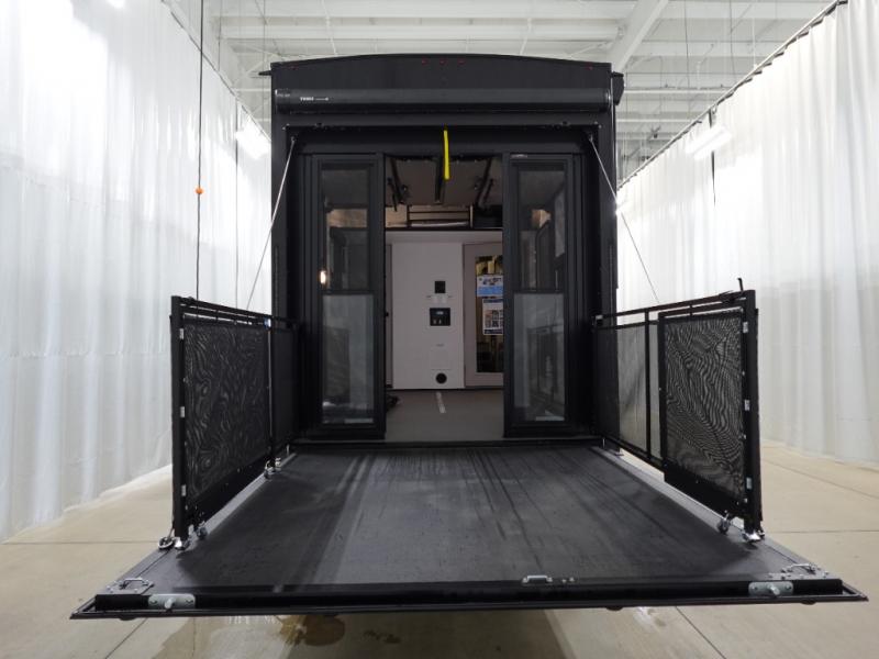 The whole family will have a fun time camping in this toy hauler! You can easily load up your toys into the 11' garage area with the 8' weather resistant ramp door and keep them filled with the dual 30 gallon fuel tanks. Once you unload your toys from the garage area, you can set up the opposing HappiJac sofas with a queen mattress above them, the loft that opens to the living room, and the half bathroom. The kitchen has everything you need to prepare your best meals including two hutches, three pantries, and a kitchen island with two bar stools to enjoy your morning coffee and eggs. The dual entry bathroom has a 48" x 30" shower and leads directly into the front private bedroom. Inside the bedroom is a king bed slide for more floor space, a flip top dresser, and a front wardrobe with washer and dryer prep!