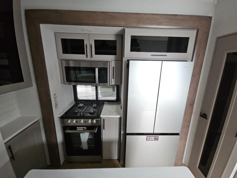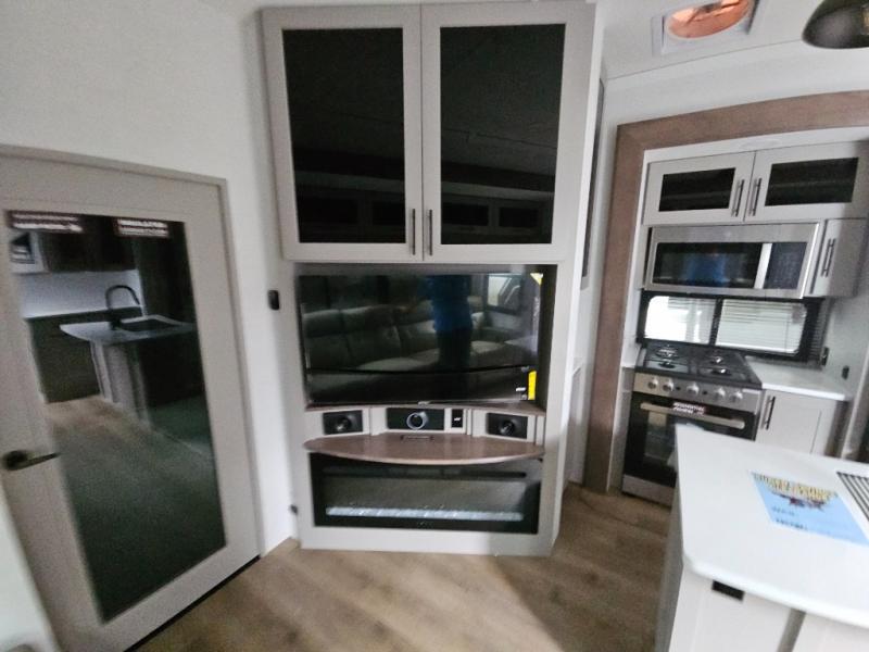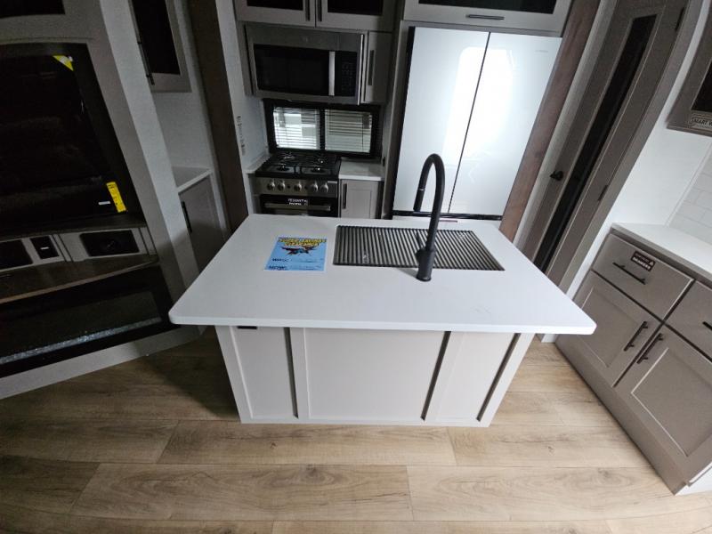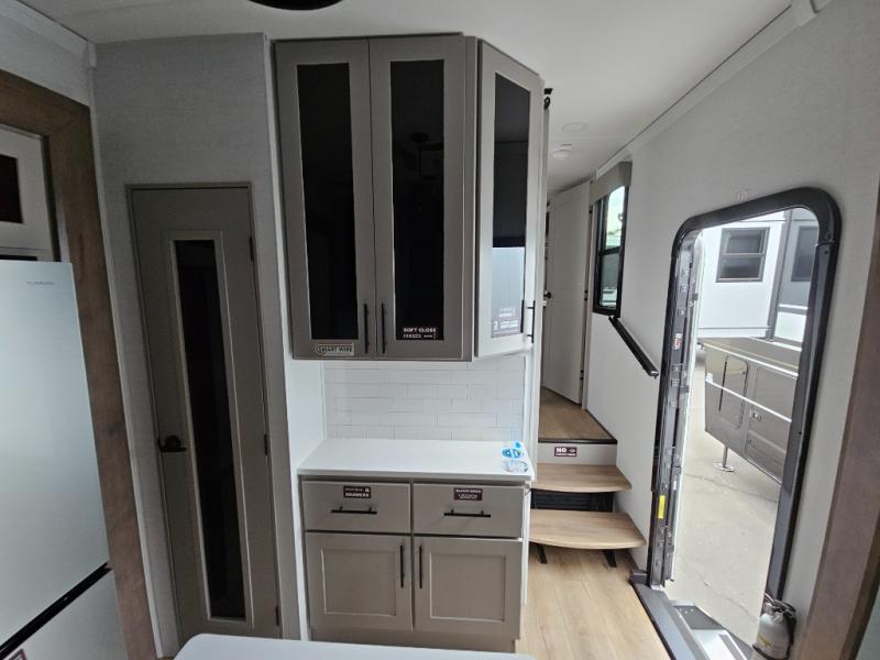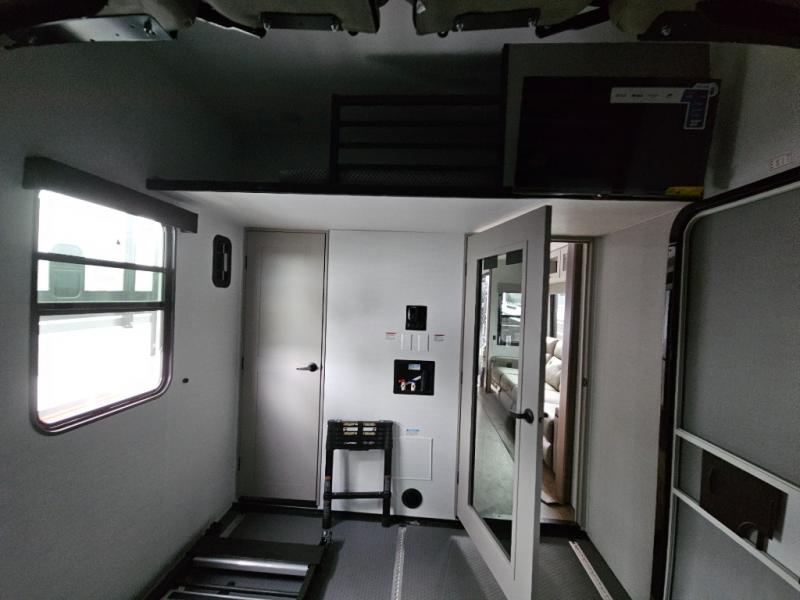 The whole family will have a fun time camping in this toy hauler! You can easily load up your toys into the 11' garage area with the 8' weather resistant ramp door and keep them filled with the dual 30 gallon fuel tanks. Once you unload your toys from the garage area, you can set up the opposing HappiJac sofas with a queen mattress above them, the loft that opens to the living room, and the half bathroom. The kitchen has everything you need to prepare your best meals including two hutches, three pantries, and a kitchen island with two bar stools to enjoy your morning coffee and eggs. The dual entry bathroom has a 48" x 30" shower and leads directly into the front private bedroom. Inside the bedroom is a king bed slide for more floor space, a flip top dresser, and a front wardrobe with washer and dryer prep!