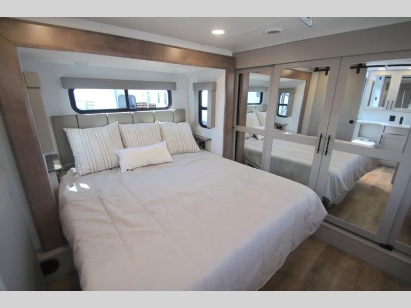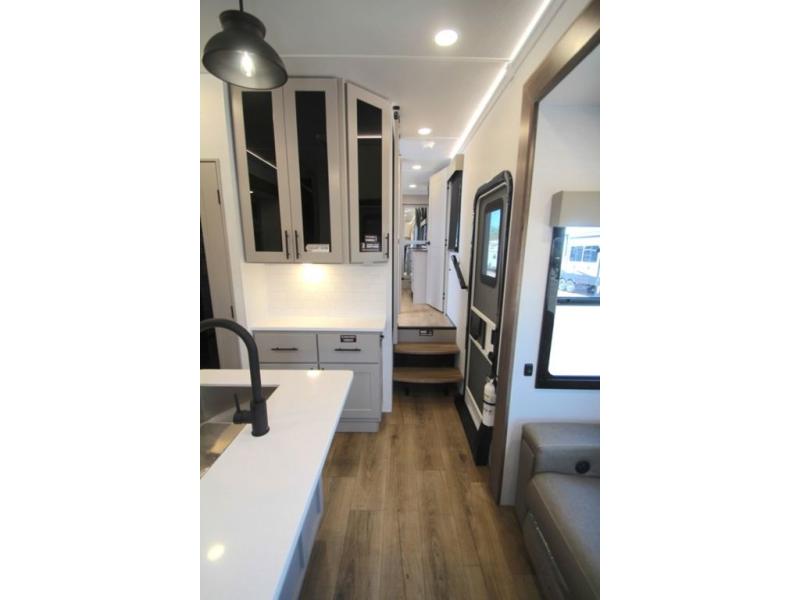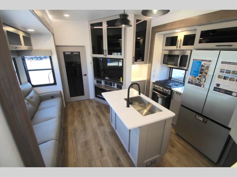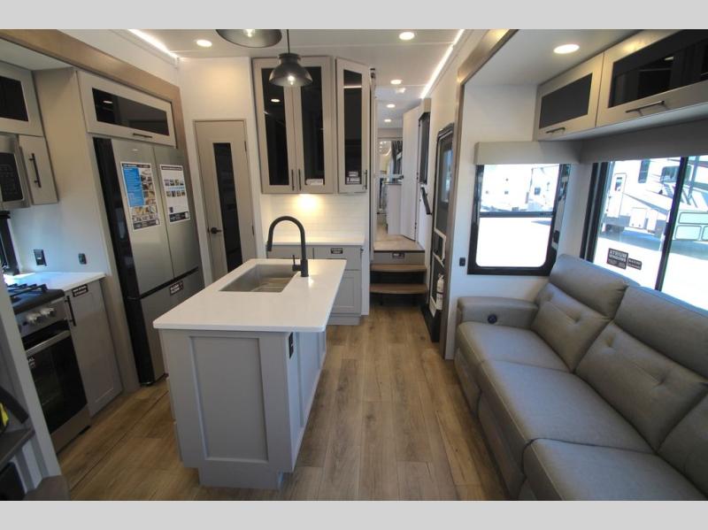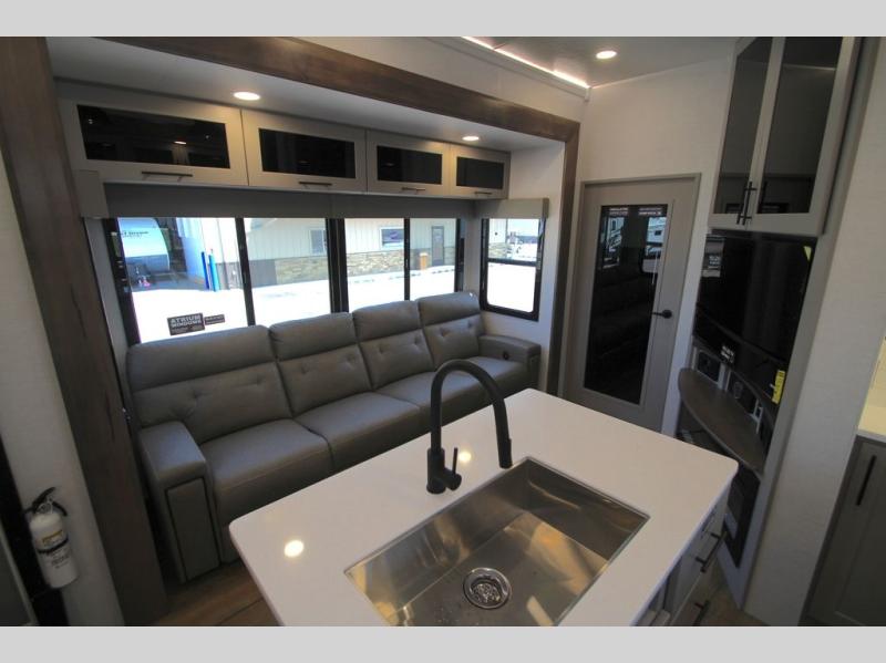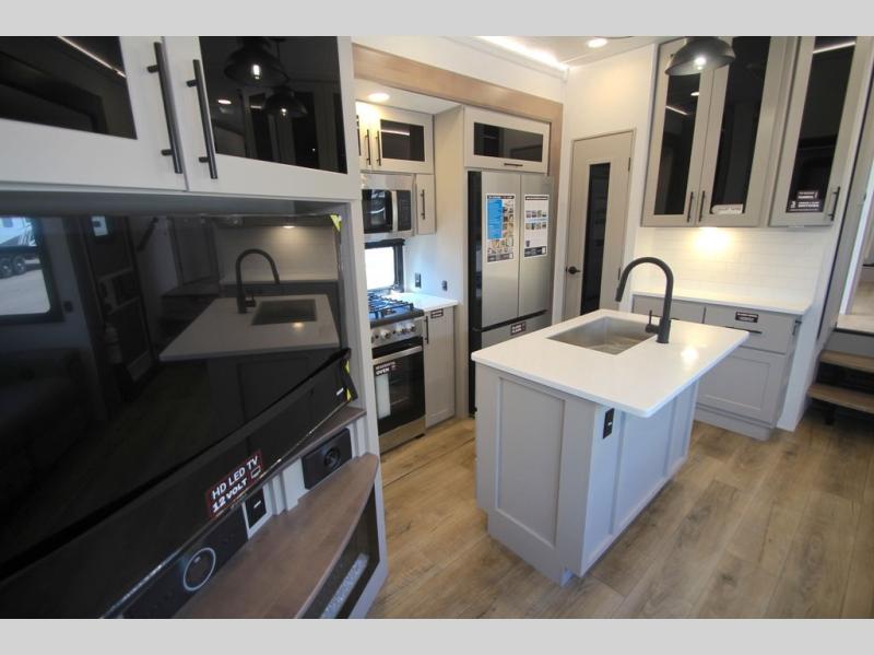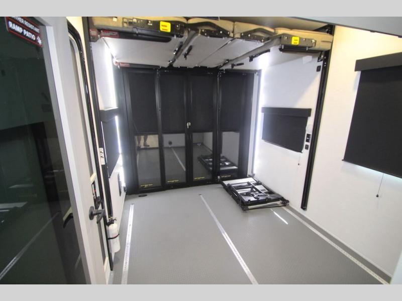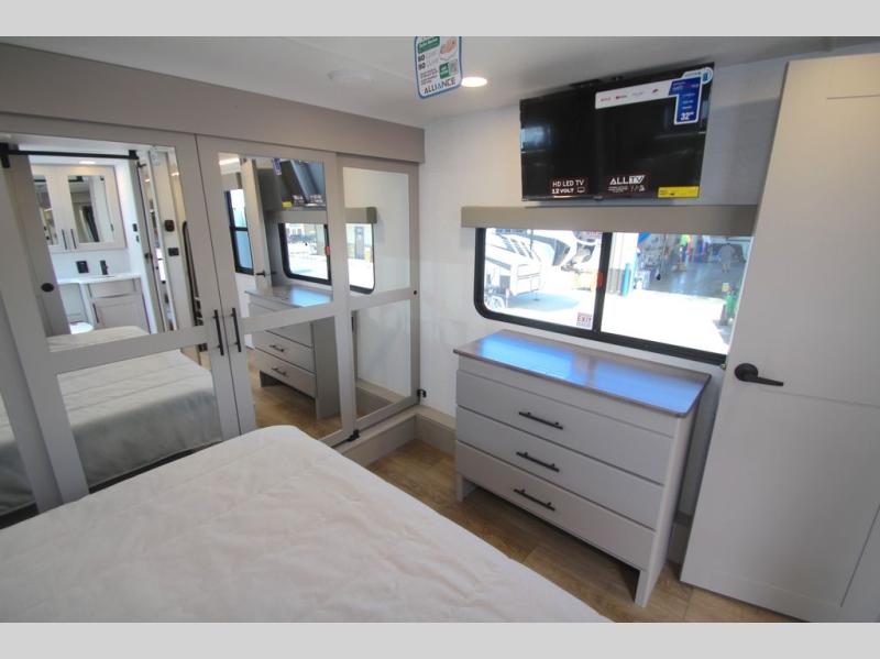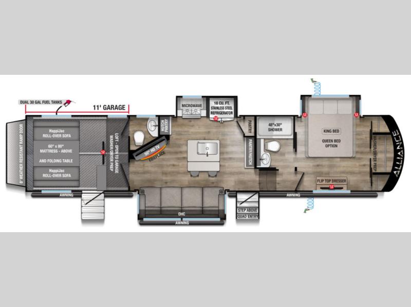 You can bring your toys with you wherever you go with any one of these Alliance RV Valor toy hauler fifth wheels! They are adventure-ready with a quality build from the walk on roof with seamless PVC roof covering to the commercial grade vinyl flooring and MorRyde CRE3000 suspension system. The Performance Running Gear package comes with a 101" wide-body benchmark chassis platform, Dexter axles, and a space enhancing drop frame storage compartment to pack in all your riding gear. You can even go off-gridding thanks to the Off the Grid Pack that has two 400-watt solar panels, generator prep, a 60-amp charge controller, and a 100-amp hour lithium iron phosphate battery. Some of the interior comforts you will enjoy are the hardwood cabinet doors and drawers, solid surface kitchen countertops, and commercial grade vinyl flooring with no carpet to make clean up a breeze. The Valor toy haulers are also the Masters of 12 Volt with USB charging station throughout, a 12V refrigerator, and more 12-volt features to make camping hassle-free!