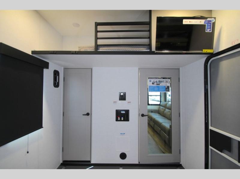 The whole family will have a fun time camping in this toy hauler! You can easily load up your toys into the 11' garage area with the 8' weather resistant ramp door and keep them filled with the dual 30-gallon fuel tanks. Once you unload your toys from the garage area, you can set up the opposing HappiJac sofas with a queen mattress above them, the loft that opens to the living room, and the half bathroom. The kitchen has everything you need to prepare your best meals including two hutches, three pantries, and a kitchen island with two bar stools to enjoy your morning coffee and eggs. The dual entry bathroom has a 48" x 30" shower and leads directly into the front private bedroom. Inside the bedroom is a king bed slide for more floor space, a flip top dresser, and a front wardrobe with washer and dryer prep!
