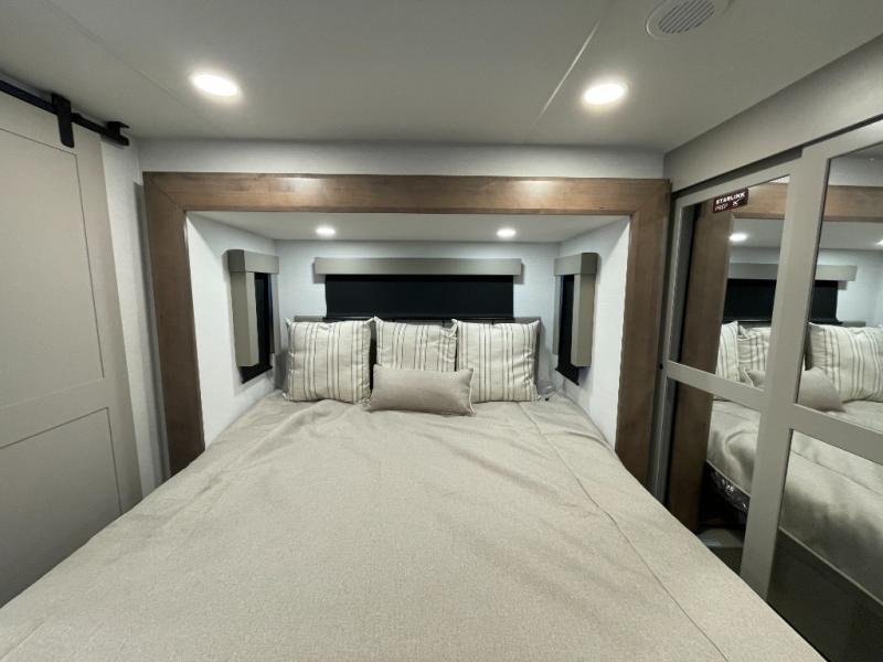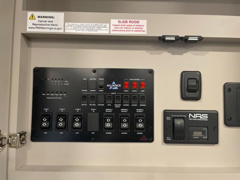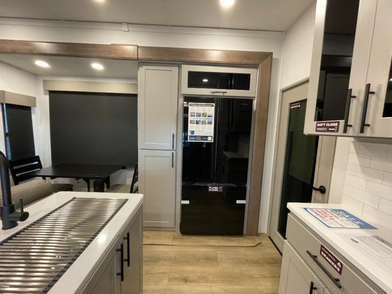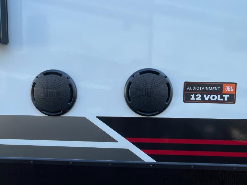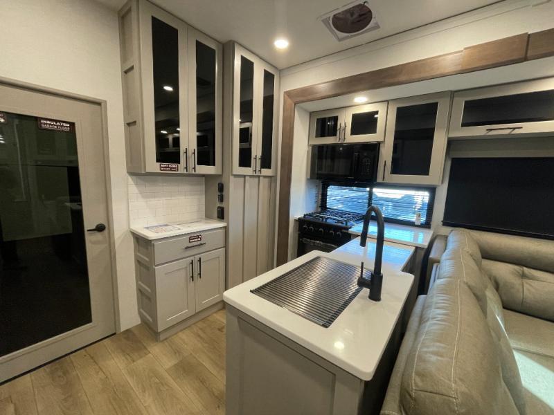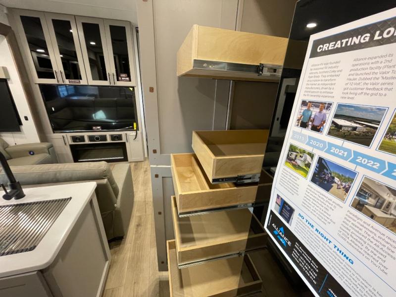You can bring your toys with you wherever you go with any one of these Alliance RV Valor toy hauler fifth wheels! They are adventure-ready with a quality build from the walk on roof with seamless PVC roof covering to the commercial grade vinyl flooring and MorRyde CRE3000 suspension system. The Performance Running Gear package comes with a 101" wide-body benchmark chassis platform, Dexter axles, and a space enhancing drop frame storage compartment to pack in all your riding gear. You can even go off-gridding thanks to the Off the Grid Pack that has two 400-watt solar panels, generator prep, a 60-amp charge controller, and a 100-amp hour lithium iron phosphate battery. Some of the interior comforts you will enjoy are the hardwood cabinet doors and drawers, solid surface kitchen countertops, and commercial grade vinyl flooring with no carpet to make clean up a breeze. The Valor toy haulers are also the Masters of 12 Volt with USB charging station throughout, a 12V refrigerator, and more 12-volt features to make camping hassle-free!