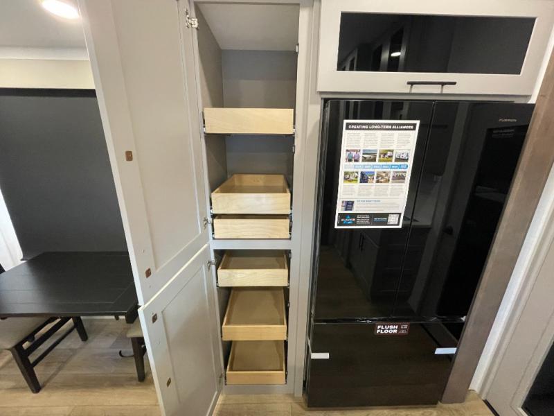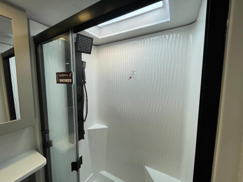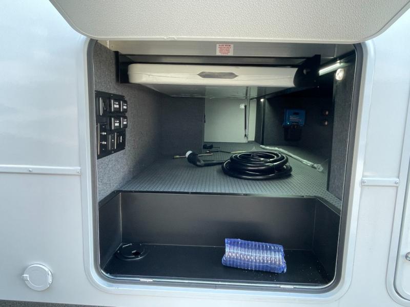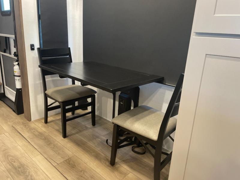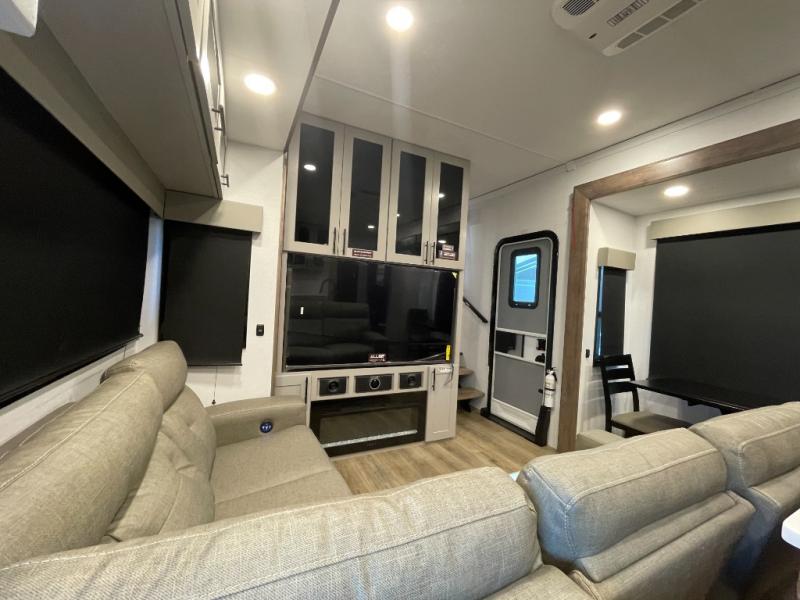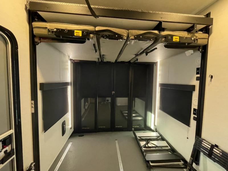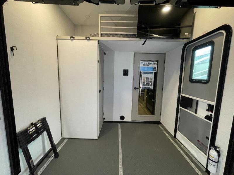 This spacious toy hauler will be perfect for weekend trips to the lake or woods! Once you've unloaded your toys from the 11' separate garage, you can relax on the 60" dual opposing sofas or set up the HappiJac bed for guests if it's getting late. There is also a 30" x 72" bunk/loft bed above the garage, a 40" garage TV, and a half bath for added convenience. As you head into the kitchen area, you'll find ample counter space to prep meals, along with a buffet, a spacious pantry and a 12V refrigerator for perishables. You can dine together at the dinette with chairs, then head to the L-shaped sofa across from the fireplace and 65" TV for movie night. The full bath includes an entrance from the hallway and into the front master bedroom. Here, you'll enjoy a king bed slide out, a flip-up dresser with a 32" TV, plus a front wardrobe with washer and dryer prep if you plan to go full-time!