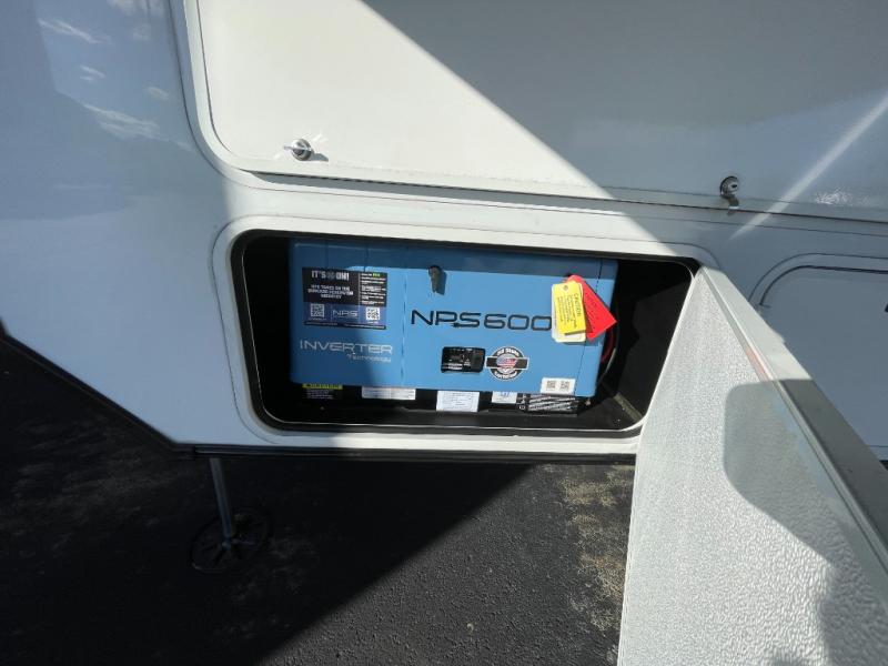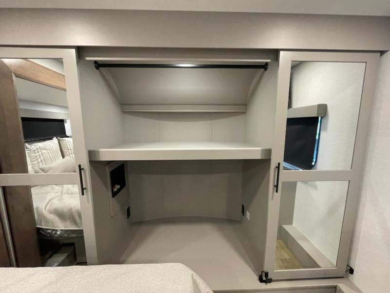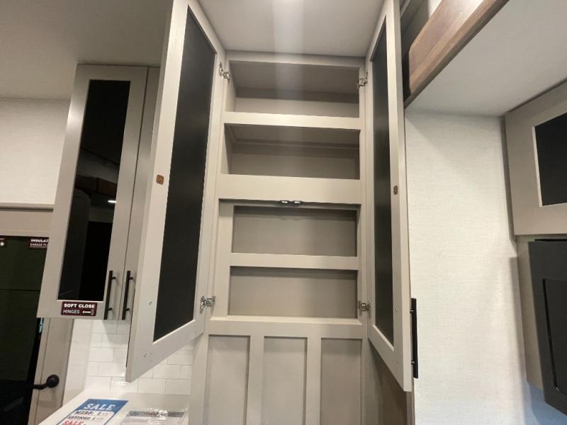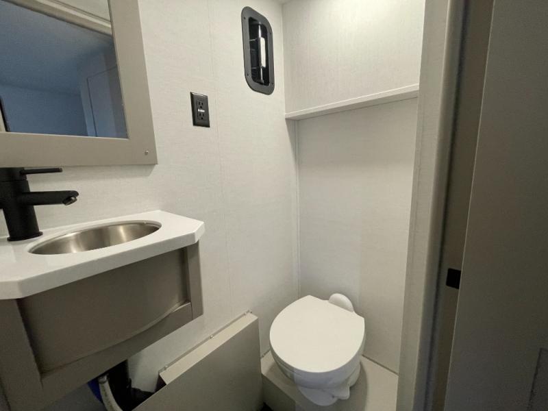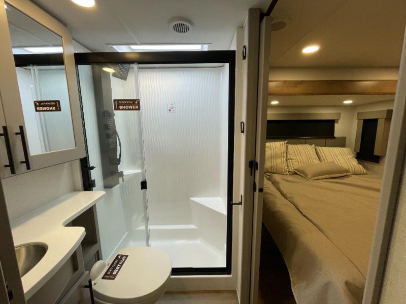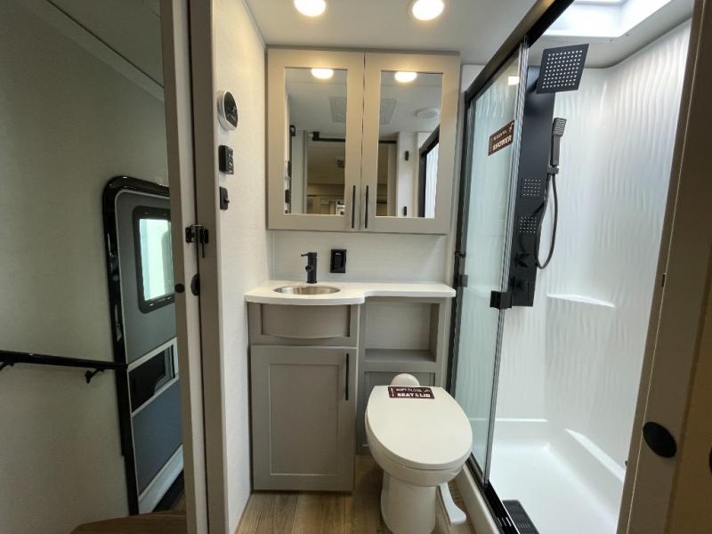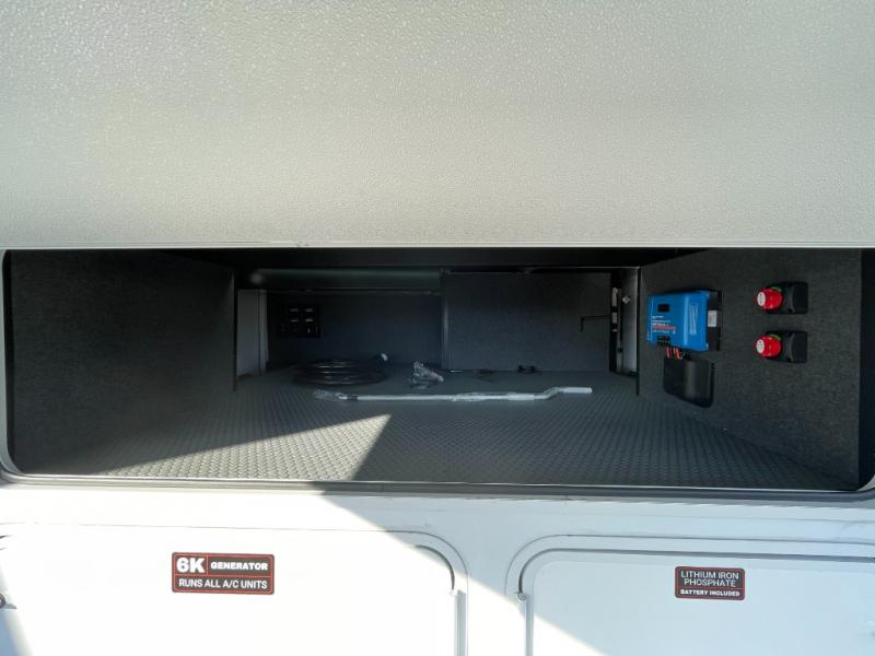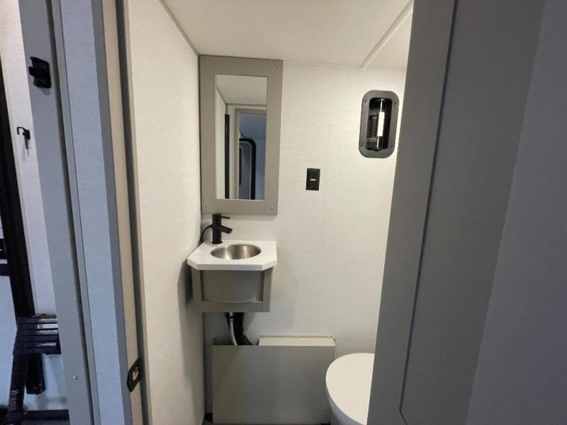 This spacious toy hauler will be perfect for weekend trips to the lake or woods! Once you've unloaded your toys from the 11' separate garage, you can relax on the 60" dual opposing sofas or set up the HappiJac bed for guests if it's getting late. There is also a 30" x 72" bunk/loft bed above the garage, a 40" garage TV, and a half bath for added convenience. As you head into the kitchen area, you'll find ample counter space to prep meals, along with a buffet, a spacious pantry and a 12V refrigerator for perishables. You can dine together at the dinette with chairs, then head to the L-shaped sofa across from the fireplace and 65" TV for movie night. The full bath includes an entrance from the hallway and into the front master bedroom. Here, you'll enjoy a king bed slide out, a flip-up dresser with a 32" TV, plus a front wardrobe with washer and dryer prep if you plan to go full-time!