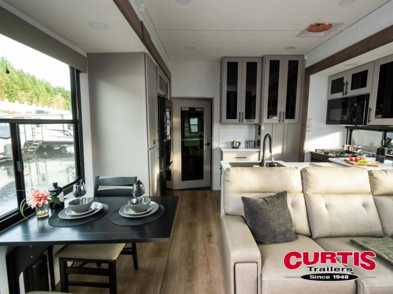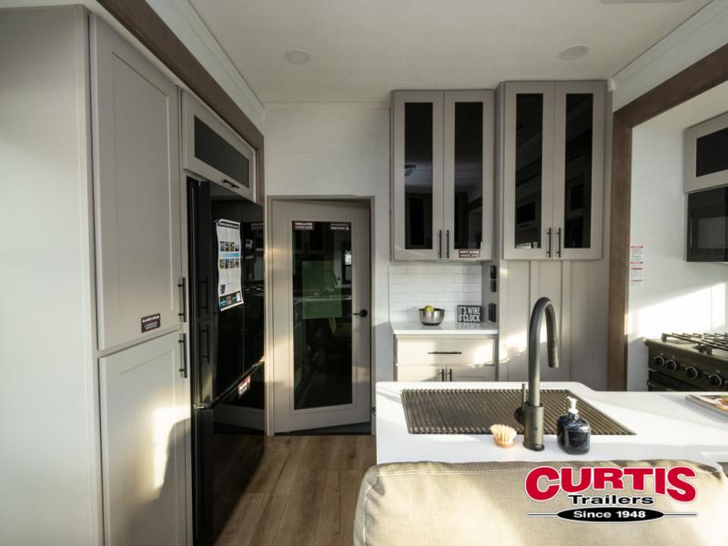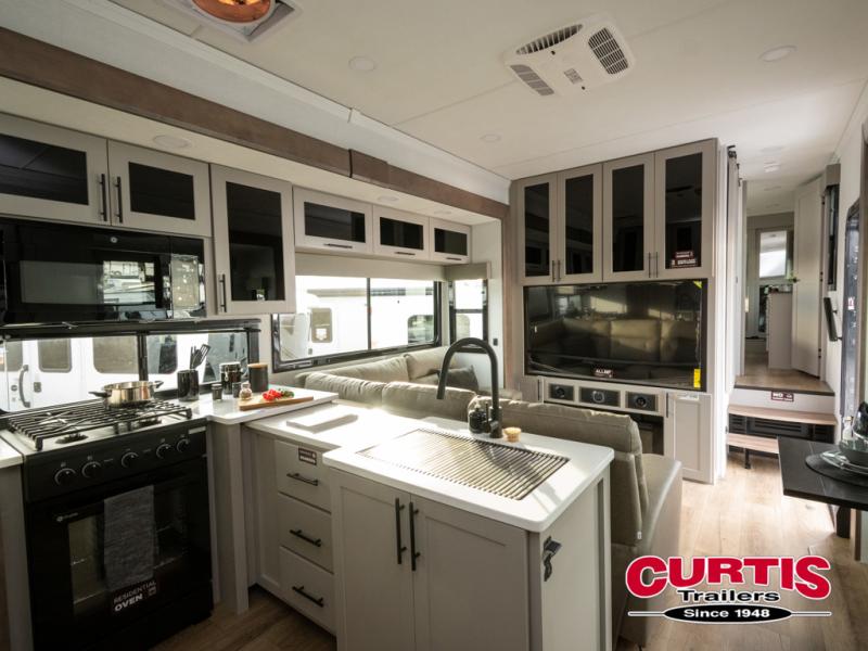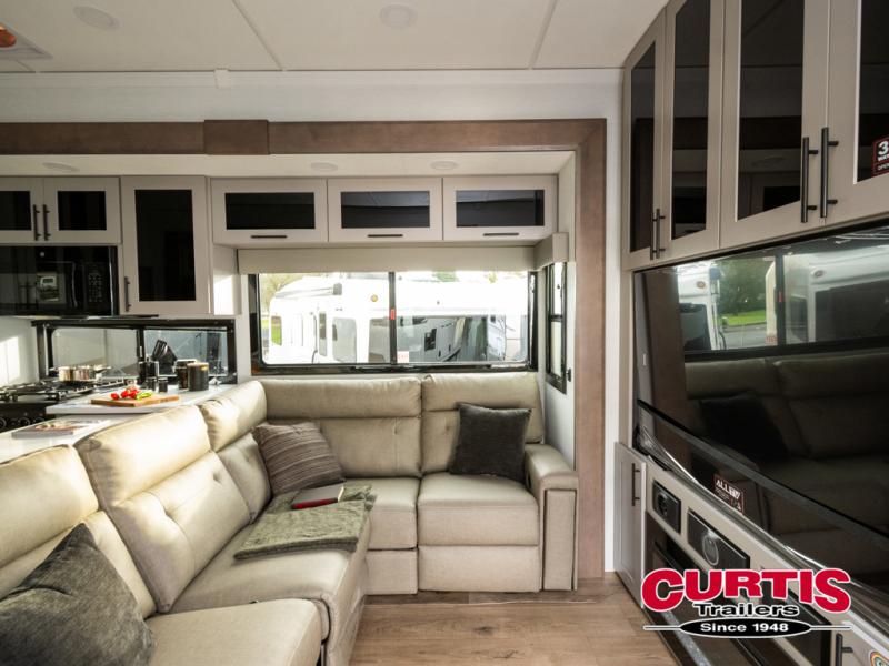 You can bring your toys with you wherever you go with any one of these Alliance RV Valor toy hauler fifth wheels! They are adventure-ready with a quality build from the walk on roof with seamless PVC roof covering to the commercial grade vinyl flooring and MorRyde CRE3000 suspension system. The Performance Running Gear package comes with a 101" wide-body benchmark chassis platform, Dexter axles, and a space enhancing drop frame storage compartment to pack in all your riding gear. You can even go off-gridding thanks to the Off the Grid Pack that has two 400-watt solar panels, generator prep, a 60-amp charge controller, and a 100-amp hour lithium iron phosphate battery. Some of the interior comforts you will enjoy are the hardwood cabinet doors and drawers, solid surface kitchen countertops, and commercial grade vinyl flooring with no carpet to make clean up a breeze. The Valor toy haulers are also the Masters of 12 Volt with USB charging station throughout, a 12V refrigerator, and more 12-volt features to make camping hassle-free!