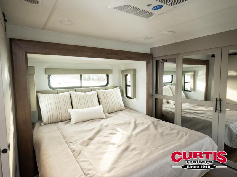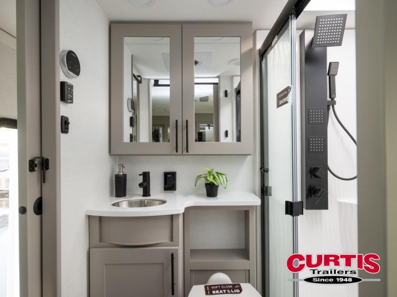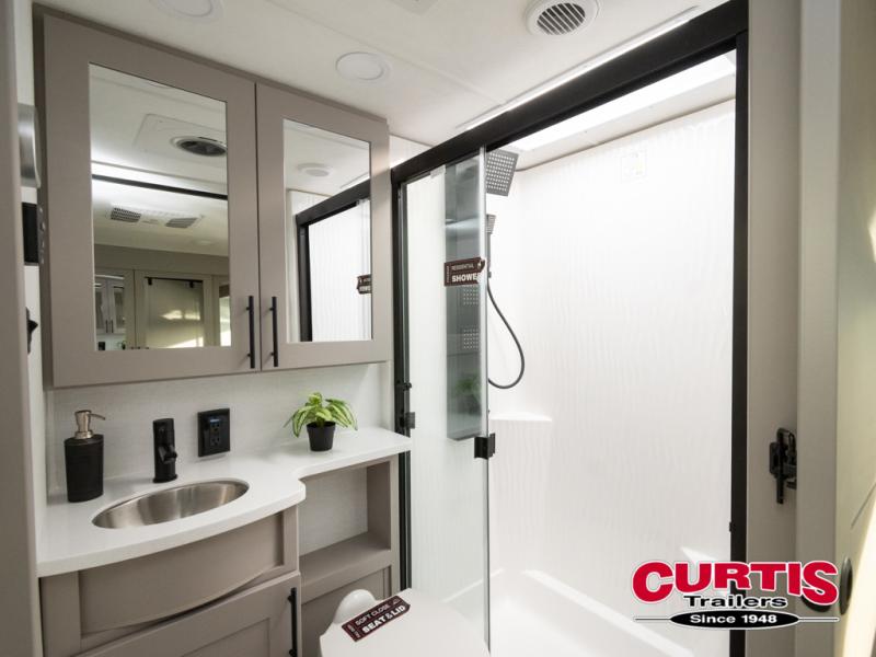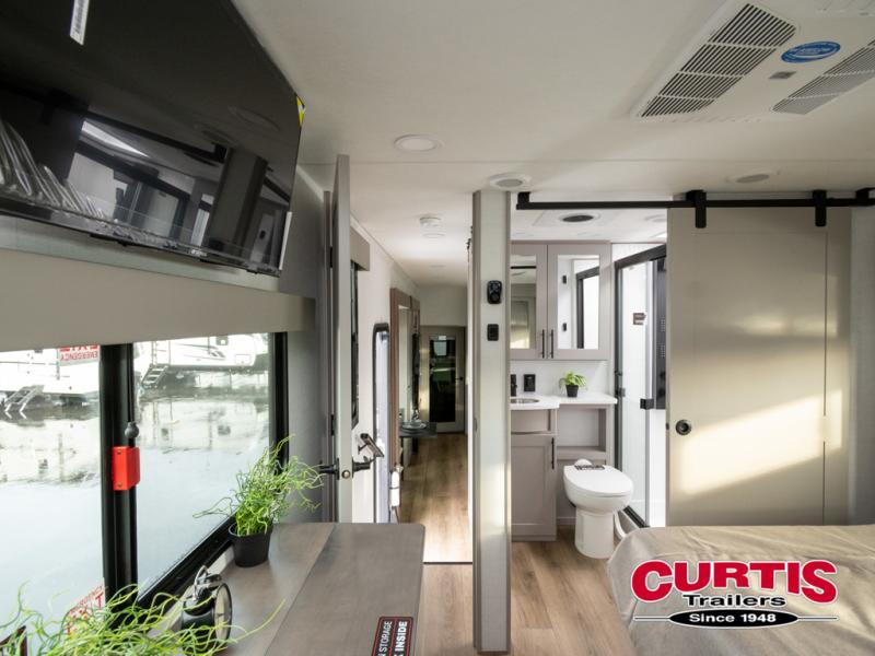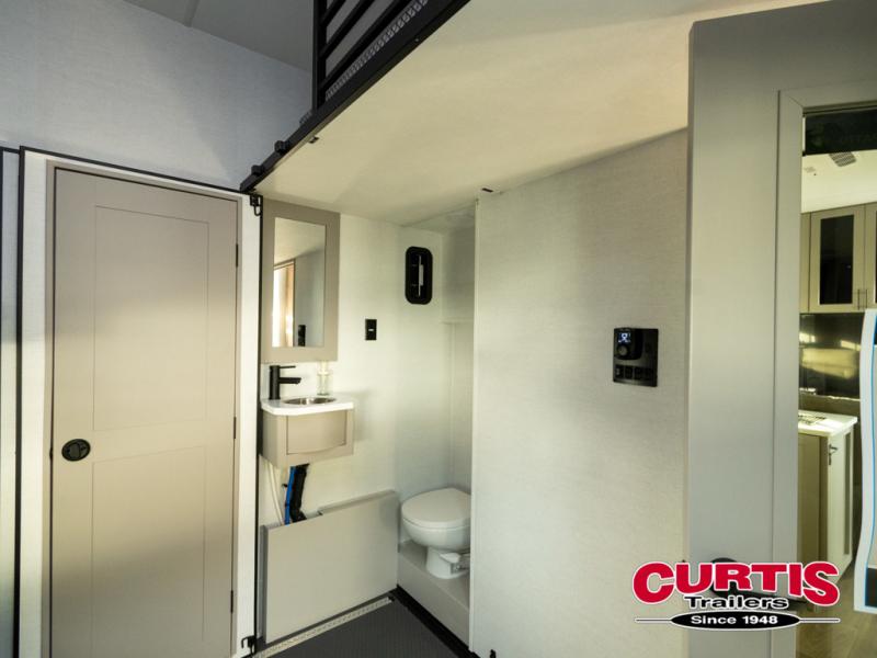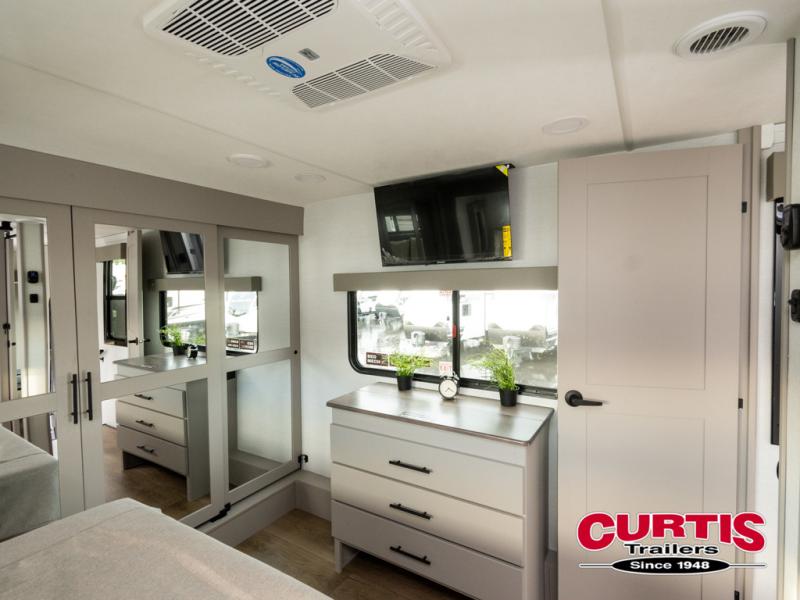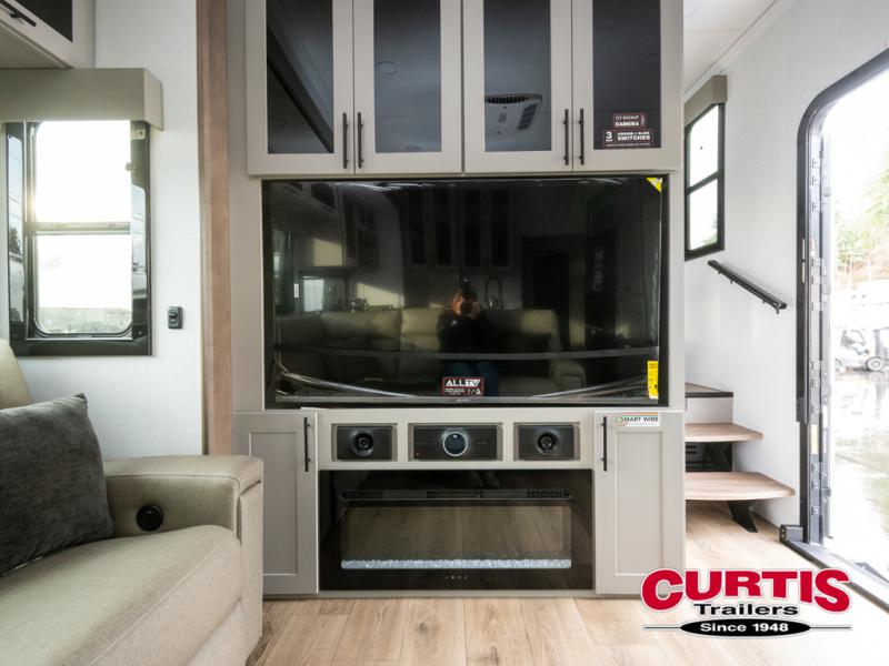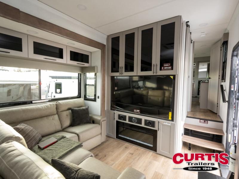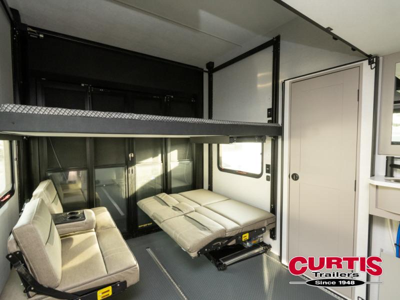 This spacious toy hauler will be perfect for weekend trips to the lake or woods! Once you've unloaded your toys from the 11' separate garage, you can relax on the 60" dual opposing sofas or set up the HappiJac bed for guests if it's getting late. There is also a 30" x 72" bunk/loft bed above the garage, a 40" garage TV, and a half bath for added convenience. As you head into the kitchen area, you'll find ample counter space to prep meals, along with a buffet, a spacious pantry and a 12V refrigerator for perishables. You can dine together at the dinette with chairs, then head to the L-shaped sofa across from the fireplace and 65" TV for movie night. The full bath includes an entrance from the hallway and into the front master bedroom. Here, you'll enjoy a king bed slide out, a flip-up dresser with a 32" TV, plus a front wardrobe with washer and dryer prep if you plan to go full-time!