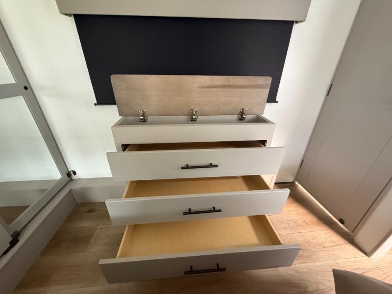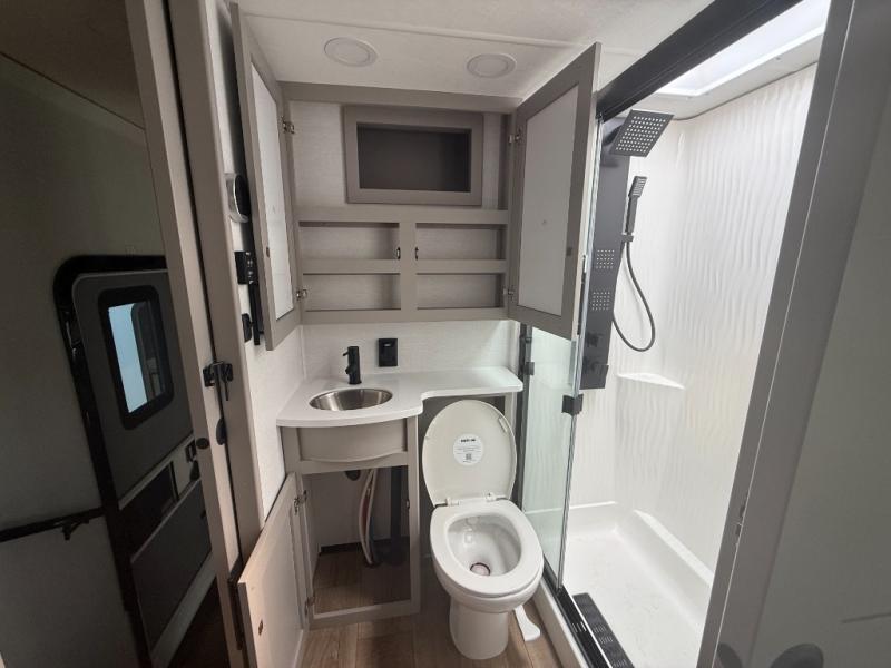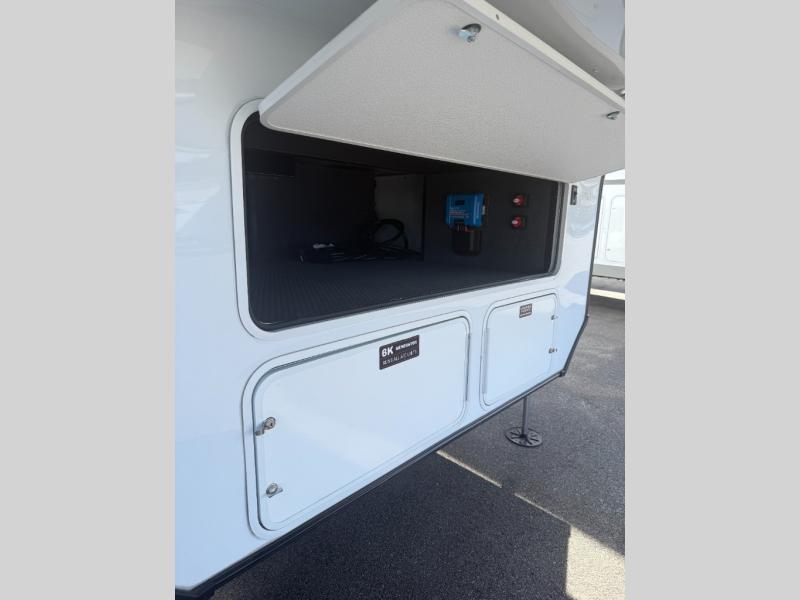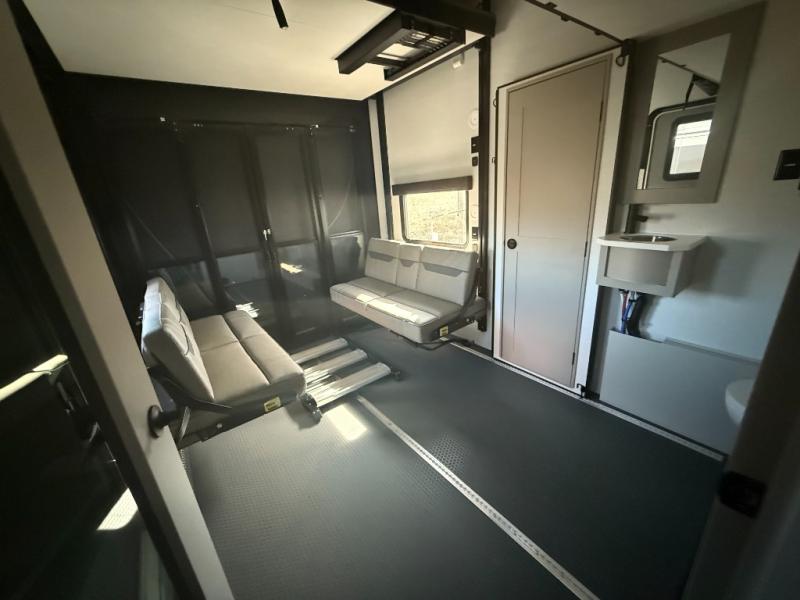 This spacious toy hauler will be perfect for weekend trips to the lake or woods! Once you've unloaded your toys from the 11' separate garage, you can relax on the 60" dual opposing sofas or set up the HappiJac bed for guests if it's getting late. There is also a 30" x 72" bunk/loft bed above the garage, a 40" garage TV, and a half bath for added convenience. As you head into the kitchen area, you'll find ample counter space to prep meals, along with a buffet, a spacious pantry and a 12V refrigerator for perishables. You can dine together at the dinette with chairs, then head to the L-shaped sofa across from the fireplace and 65" TV for movie night. The full bath includes an entrance from the hallway and into the front master bedroom. Here, you'll enjoy a king bed slide out, a flip-up dresser with a 32" TV, plus a front wardrobe with washer and dryer prep if you plan to go full-time!