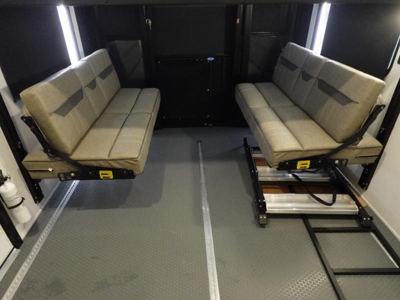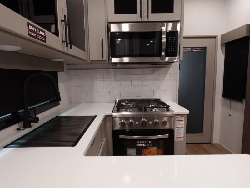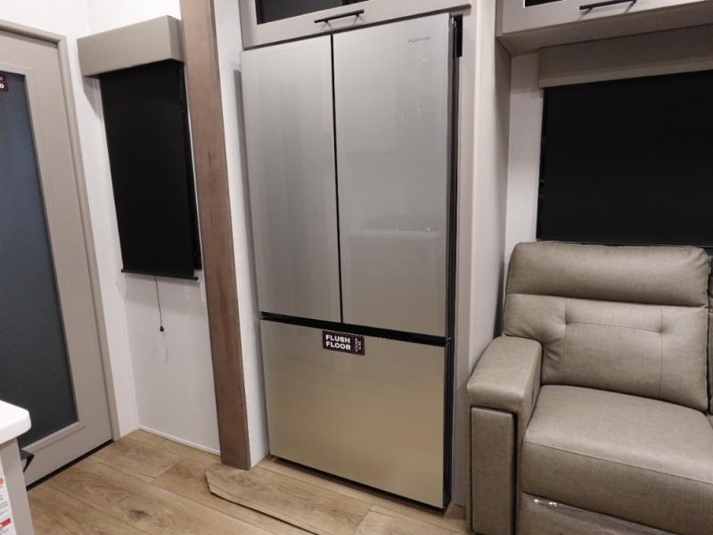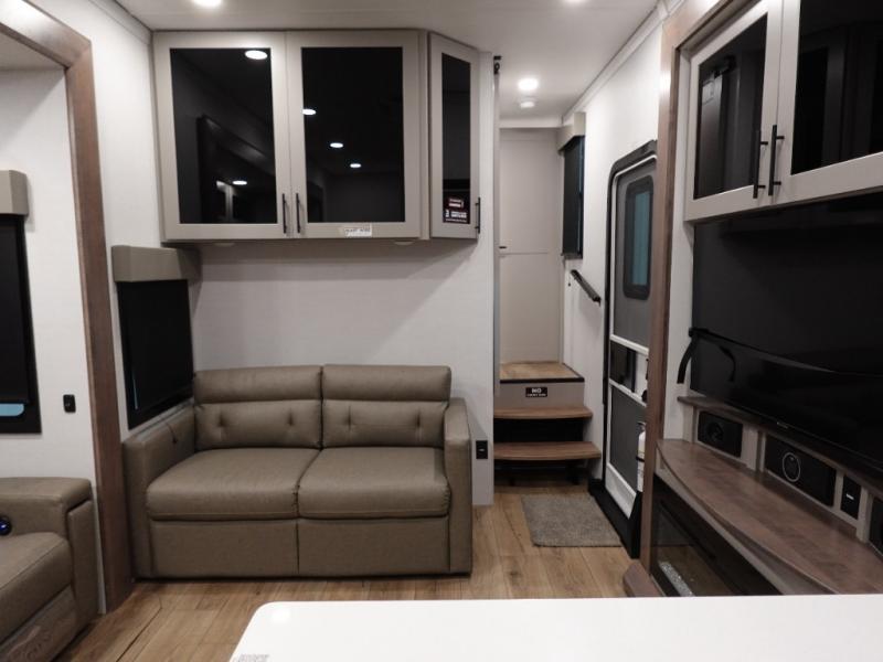 You can bring your toys with you wherever you go with any one of these Alliance RV Valor toy hauler fifth wheels! They are adventure-ready with a quality build from the walk on roof with seamless PVC roof covering to the commercial grade vinyl flooring and MorRyde CRE3000 suspension system. The Performance Running Gear package comes with a 101" wide-body benchmark chassis platform, 7,000 lb. Dexter axles, and a space enhancing drop frame storage compartment to pack in all your riding gear. You can even go off-gridding thanks to the Off the Grid Pack that has two 400 watt solar panels, generator prep, a 40 amp charge controller, and a 100 amp hour lithium iron phosphate battery. Some of the interior comforts you will enjoy are the hardwood cabinet doors and drawers, solid surface kitchen countertops, and commercial grade vinyl flooring with no carpet to make clean up a breeze. The Valor toy haulers are also the Masters of 12 Volt with USB charging station throughout, a stainless steel refrigerator, and more 12 volt features to make camping hassle-free!