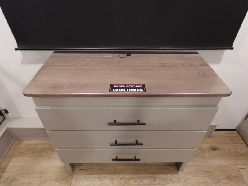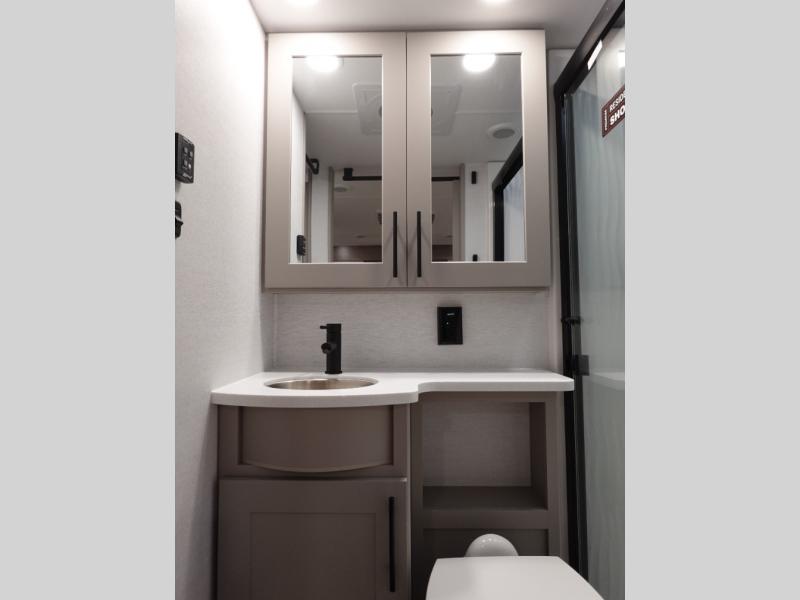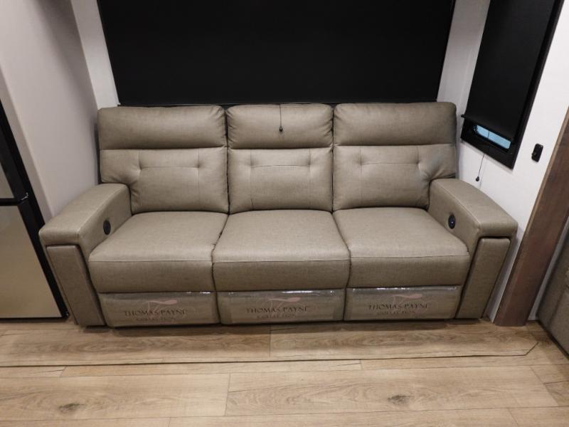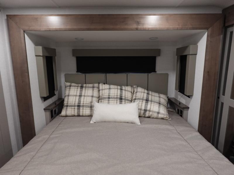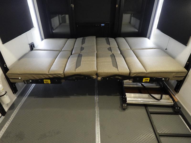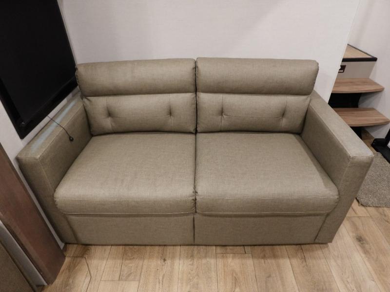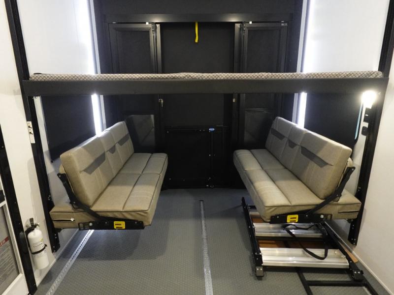 There is room for your off-road toys and the whole family in this toy hauler! The bath and a half makes life more convenient and the dual entry doors create a smooth flow of traffic in and out of the unit. Aside from 13' of garage space and an entrance/exit door, there are also opposing HappiJac sofas with a queen bed above them, a loft that opens to the garage, and a half bathroom. The chef can prepare their best meals with the four burner cooktop while two others sit at the flip up counter with two bar stools. After a fun day on the trails, wash up in the full bathroom with the 48" x 30" shower, grab your pajamas from the front wardrobe or flip top dresser in the front private bedroom then relax on one of the two sofas by the fireplace and 50" HDTV!