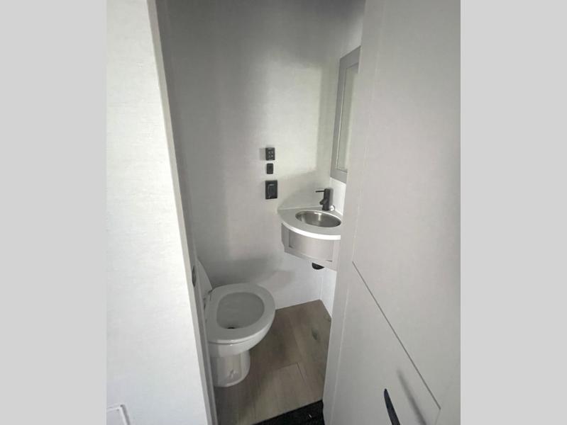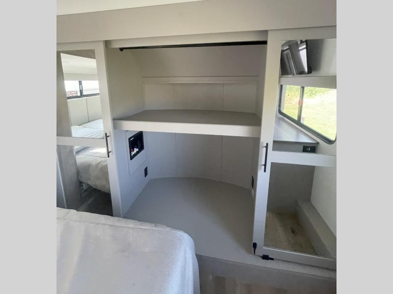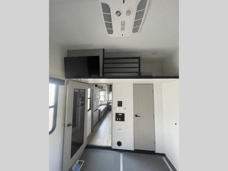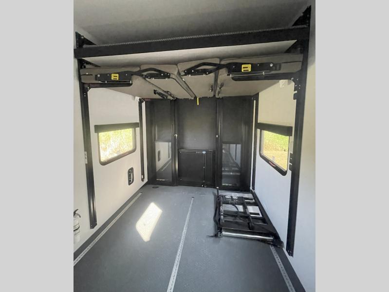 There is room for your off-road toys and the whole family in this toy hauler! The bath and a half makes life more convenient and the dual entry doors create a smooth flow of traffic in and out of the unit. Aside from 13' of garage space and an entrance/exit door, there are also opposing HappiJac sofas with a queen bed above them, a loft that opens to the garage, and a half bathroom. The chef can prepare their best meals with the four burner cooktop while two others sit at the flip up counter with two bar stools. After a fun day on the trails, wash up in the full bathroom with the 48" x 30" shower, grab your pajamas from the front wardrobe or flip top dresser in the front private bedroom then relax on one of the two sofas by the fireplace and 50" HDTV!