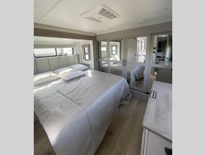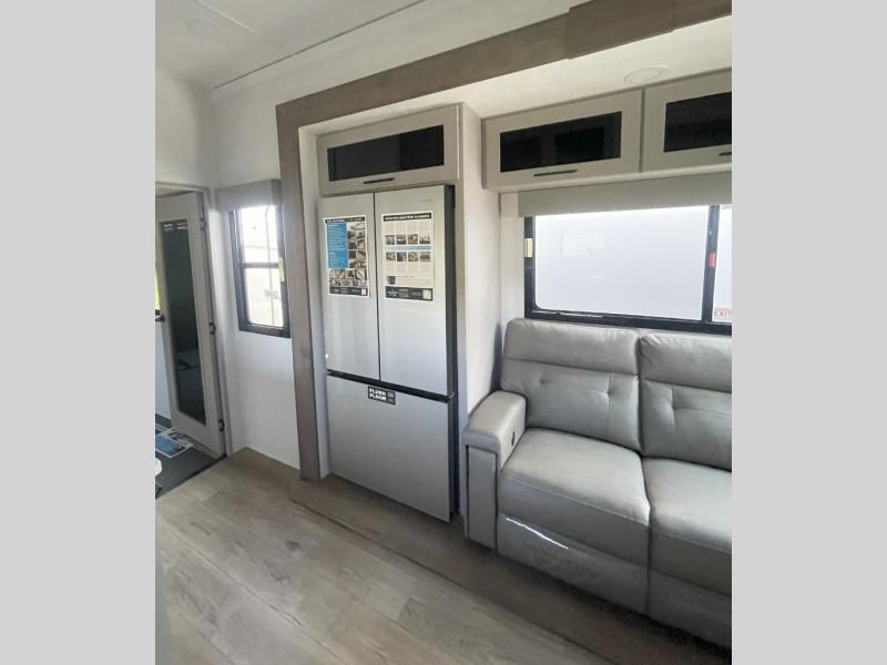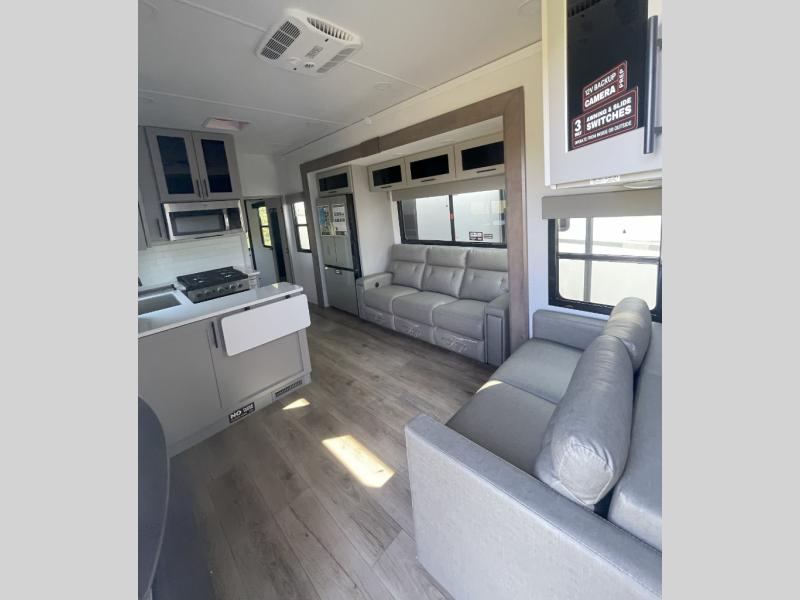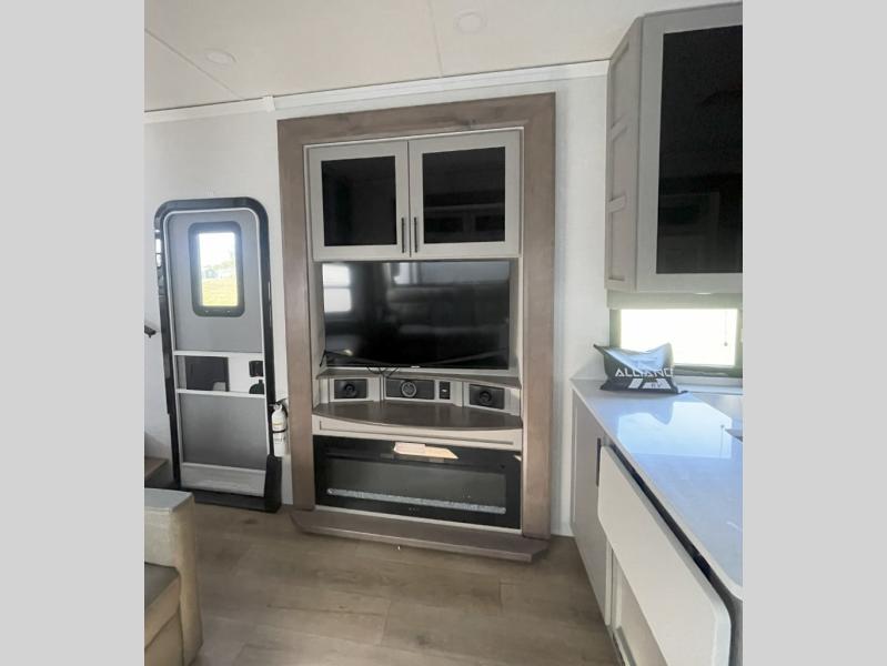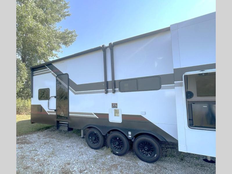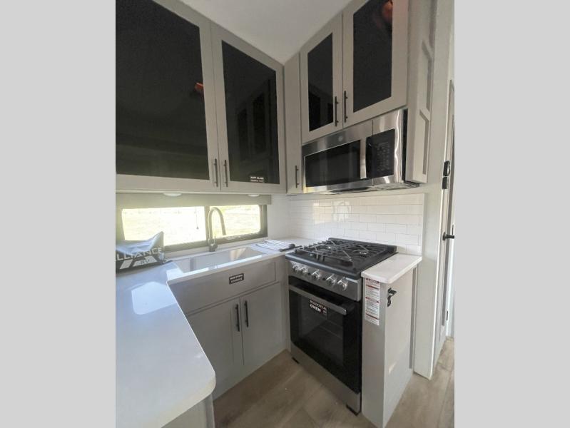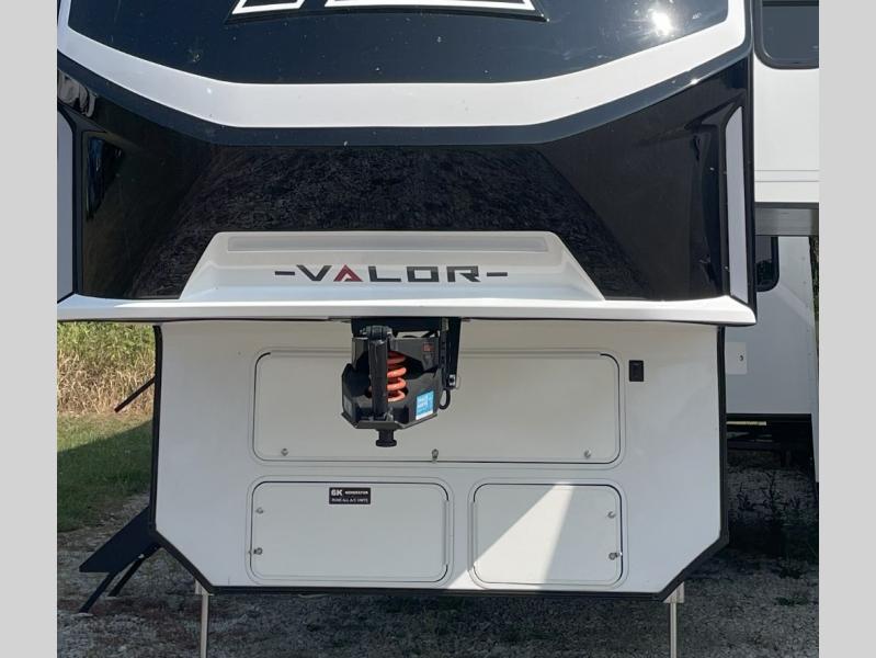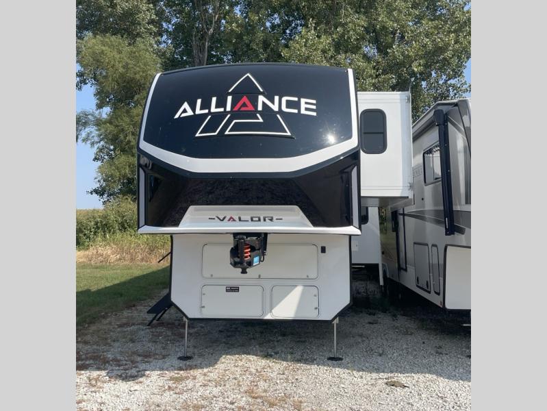 You can bring your toys with you wherever you go with any one of these Alliance RV Valor toy hauler fifth wheels! They are adventure-ready with a quality build from the walk on roof with seamless PVC roof covering to the commercial grade vinyl flooring and MorRyde CRE3000 suspension system. The Performance Running Gear package comes with a 101" wide-body benchmark chassis platform, 7,000 lb. Dexter axles, and a space enhancing drop frame storage compartment to pack in all your riding gear. You can even go off-gridding thanks to the Off the Grid Pack that has two 400 watt solar panels, generator prep, a 40 amp charge controller, and a 100 amp hour lithium iron phosphate battery. Some of the interior comforts you will enjoy are the hardwood cabinet doors and drawers, solid surface kitchen countertops, and commercial grade vinyl flooring with no carpet to make clean up a breeze. The Valor toy haulers are also the Masters of 12 Volt with USB charging station throughout, a stainless steel refrigerator, and more 12 volt features to make camping hassle-free!