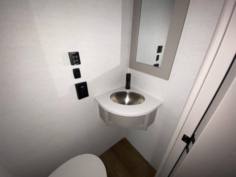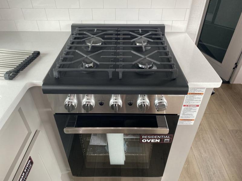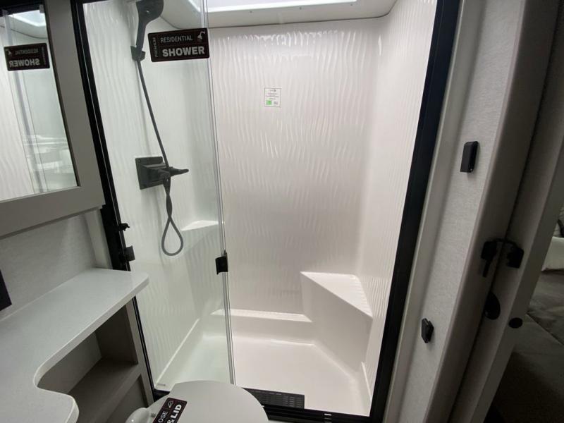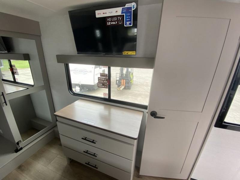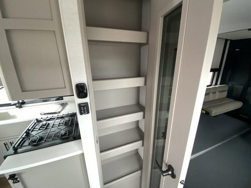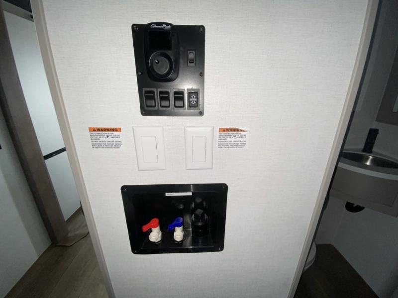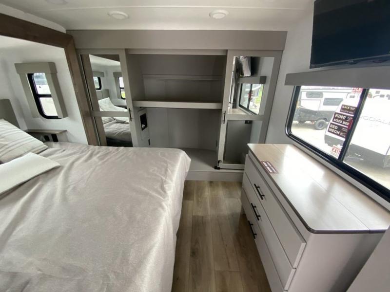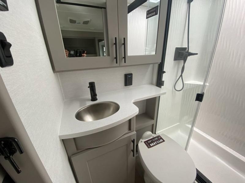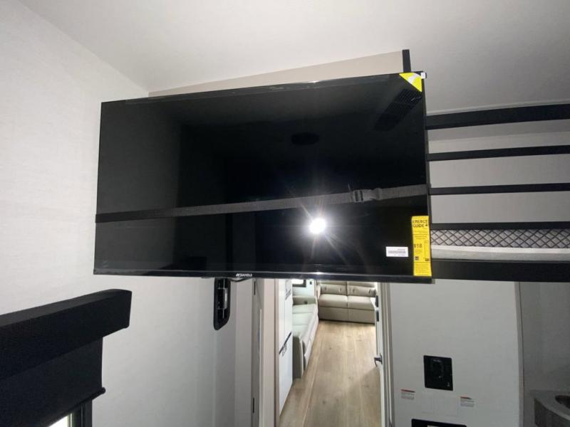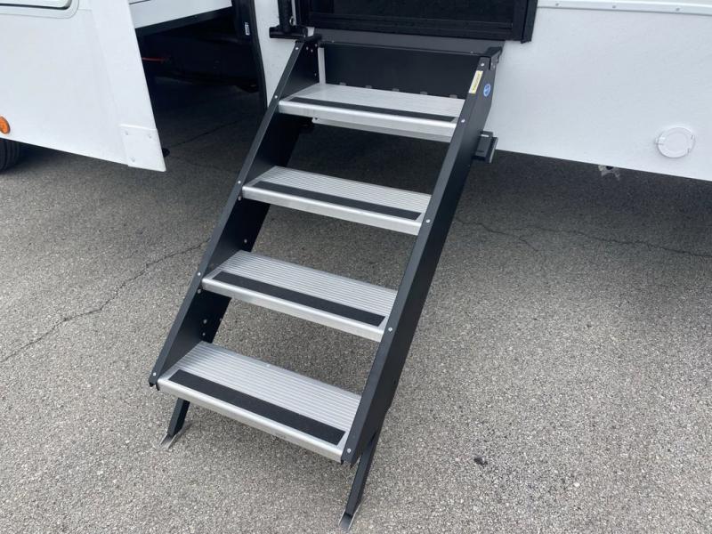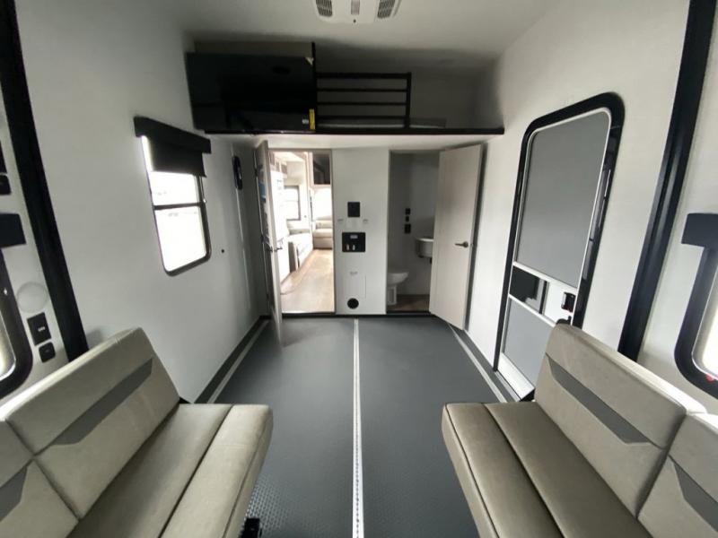 There is room for your off-road toys and the whole family in this toy hauler! The bath and a half makes life more convenient and the dual entry doors create a smooth flow of traffic in and out of the unit. Aside from 13' of garage space and an entrance/exit door, there are also opposing HappiJac sofas with a queen bed above them, a loft that opens to the garage, and a half bathroom. The chef can prepare their best meals with the four burner cooktop while two others sit at the flip up counter with two bar stools. After a fun day on the trails, wash up in the full bathroom with the 48" x 30" shower, grab your pajamas from the front wardrobe or flip top dresser in the front private bedroom then relax on one of the two sofas by the fireplace and 50" HDTV!