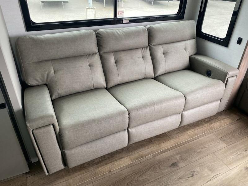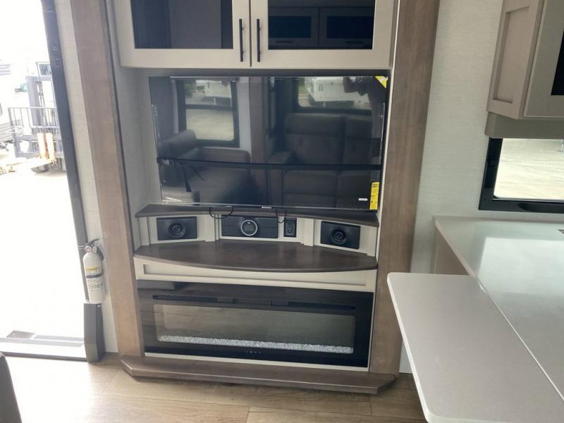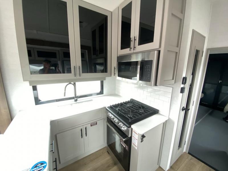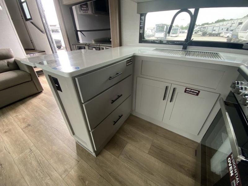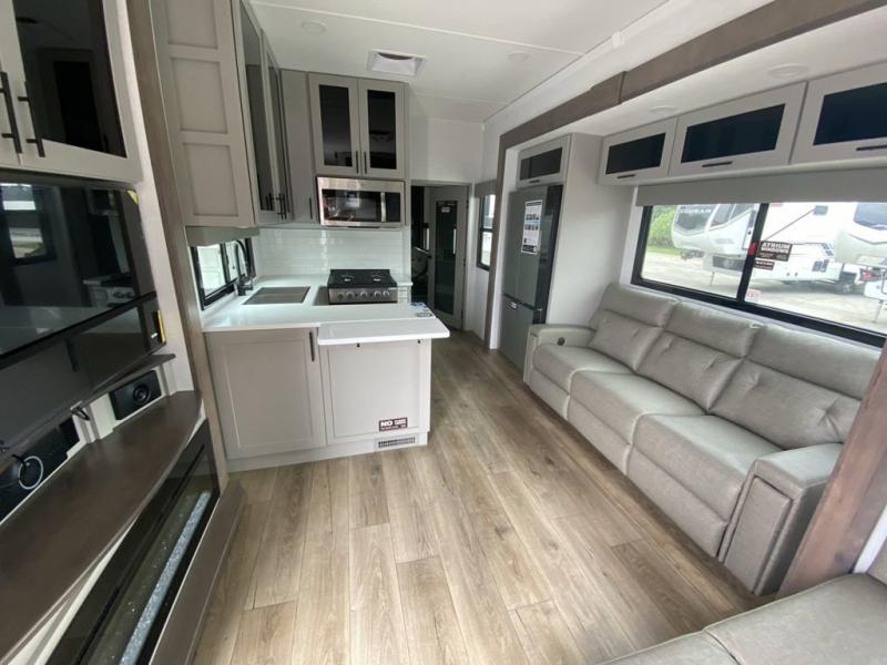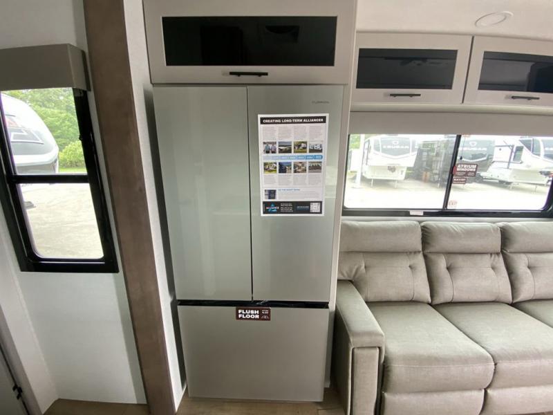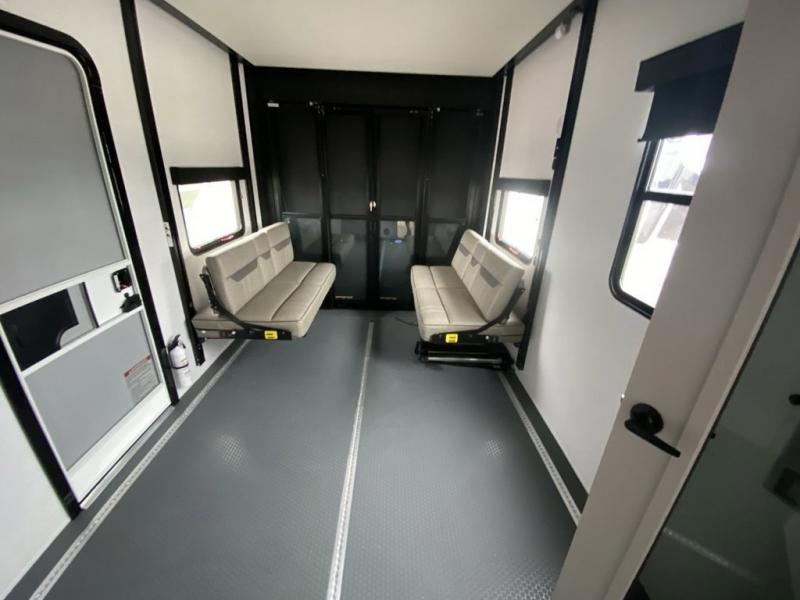 You can bring your toys with you wherever you go with any one of these Alliance RV Valor toy hauler fifth wheels! They are adventure-ready with a quality build from the walk on roof with seamless PVC roof covering to the commercial grade vinyl flooring and MorRyde CRE3000 suspension system. The Performance Running Gear package comes with a 101" wide-body benchmark chassis platform, 7,000 lb. Dexter axles, and a space enhancing drop frame storage compartment to pack in all your riding gear. You can even go off-gridding thanks to the Off the Grid Pack that has two 400 watt solar panels, generator prep, a 40 amp charge controller, and a 100 amp hour lithium iron phosphate battery. Some of the interior comforts you will enjoy are the hardwood cabinet doors and drawers, solid surface kitchen countertops, and commercial grade vinyl flooring with no carpet to make clean up a breeze. The Valor toy haulers are also the Masters of 12 Volt with USB charging station throughout, a stainless steel refrigerator, and more 12 volt features to make camping hassle-free!