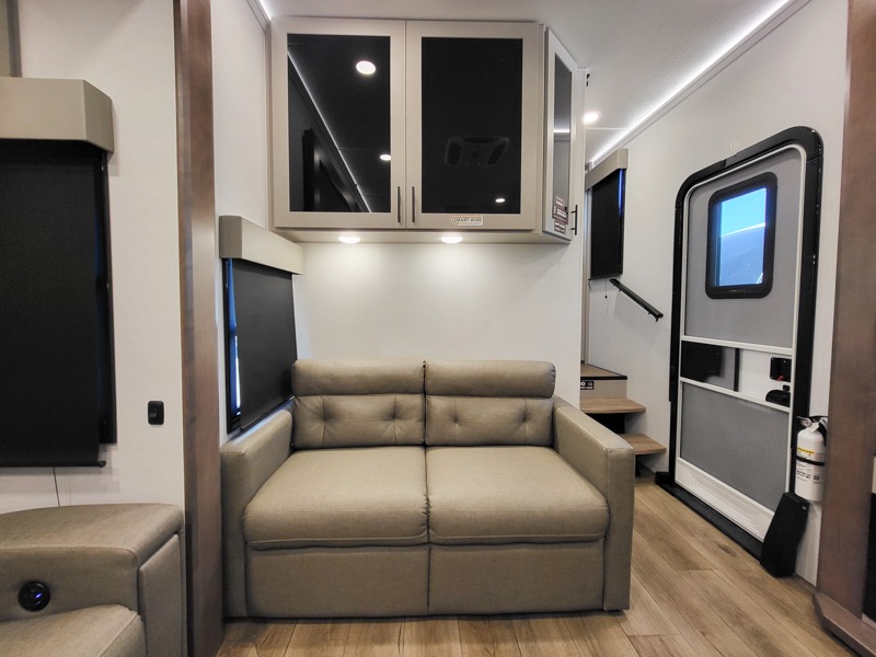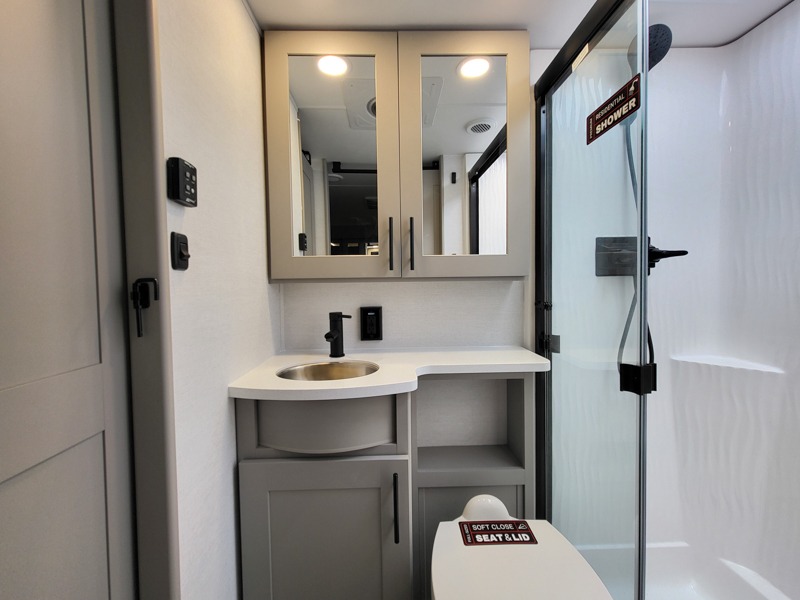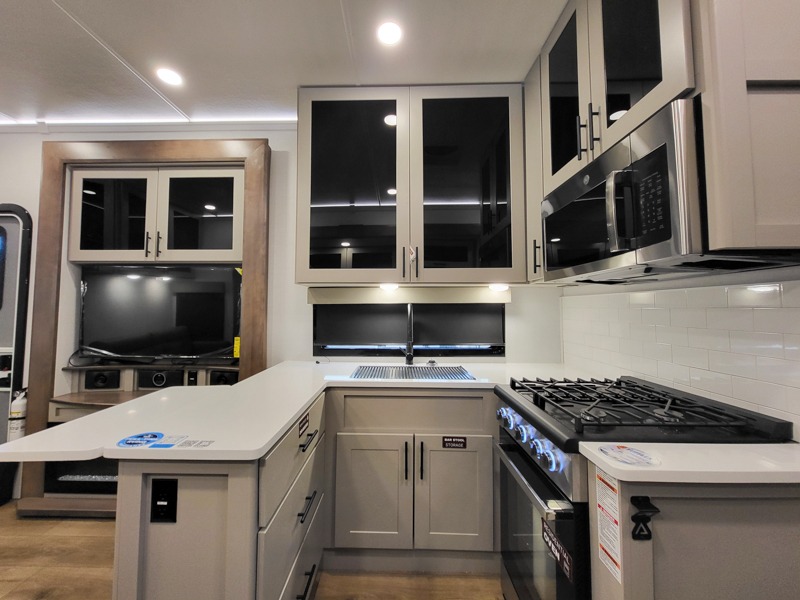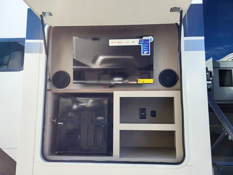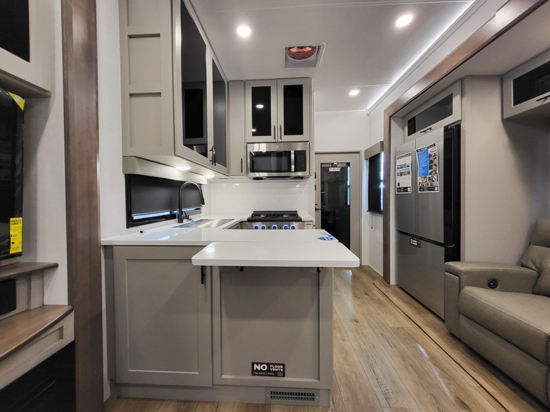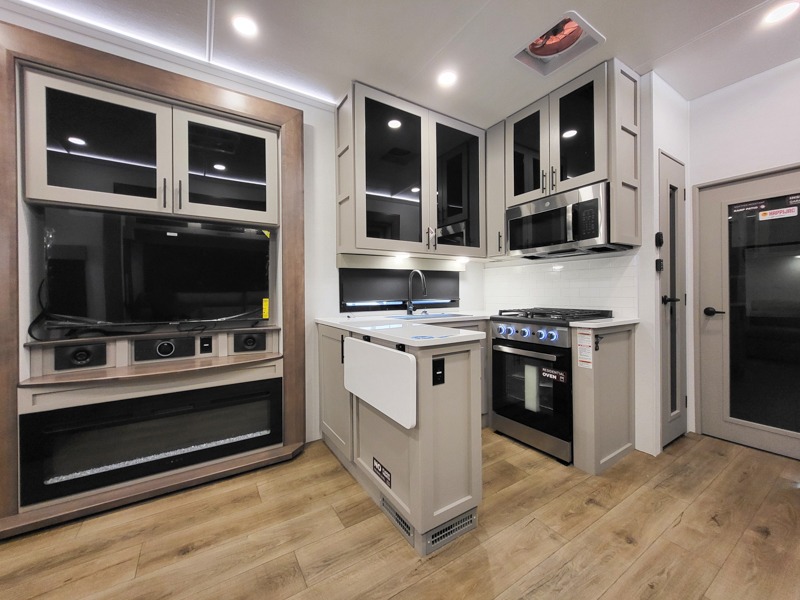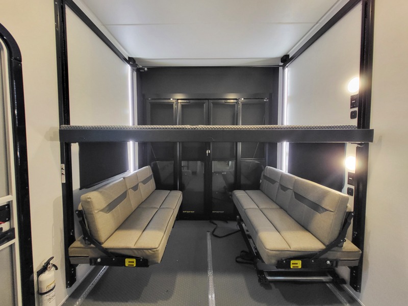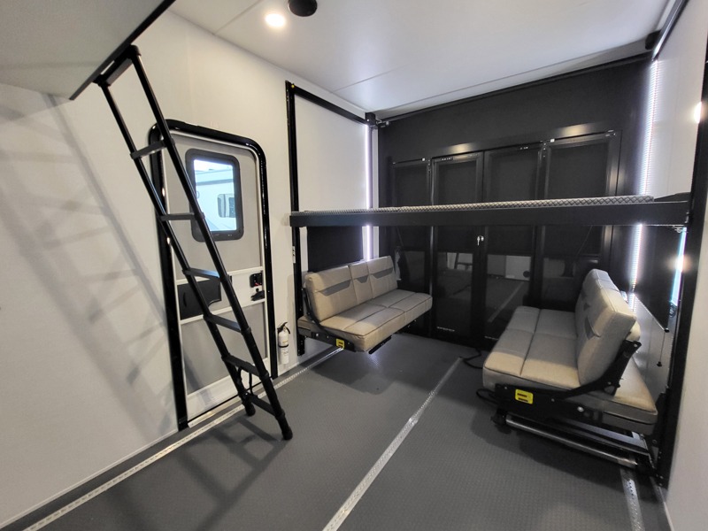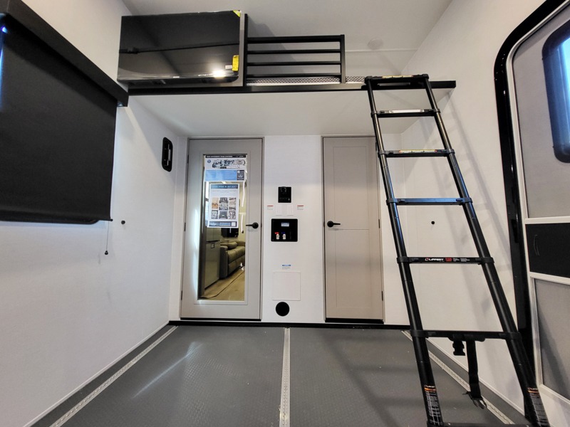 There is room for your off-road toys and the whole family in this toy hauler! The bath and a half makes life more convenient and the dual entry doors create a smooth flow of traffic in and out of the unit. Aside from 13' of garage space and an entrance/exit door, there are also opposing HappiJac sofas with a queen bed above them, a loft that opens to the garage, and a half bathroom. The chef can prepare their best meals with the four burner cooktop while two others sit at the flip up counter with two bar stools. After a fun day on the trails, wash up in the full bathroom with the 48" x 30" shower, grab your pajamas from the front wardrobe or flip top dresser in the front private bedroom then relax on one of the two sofas by the fireplace and 50" HDTV!