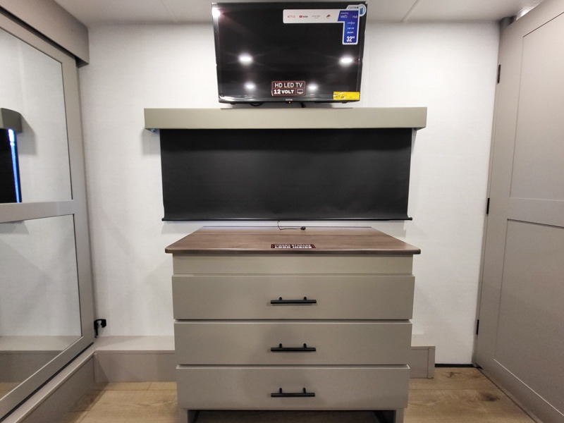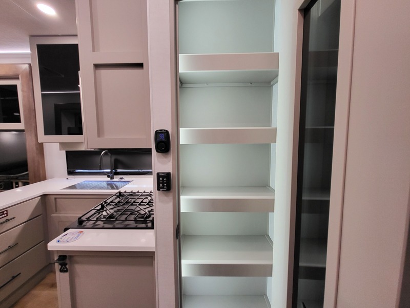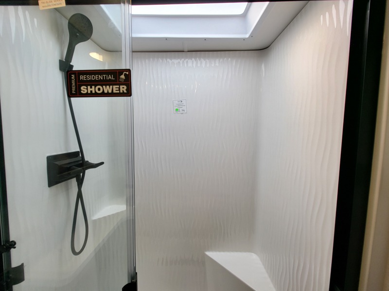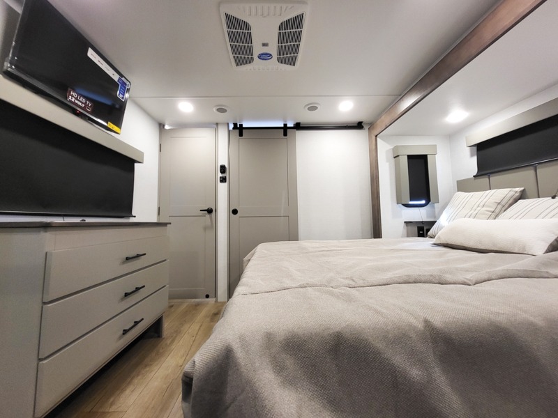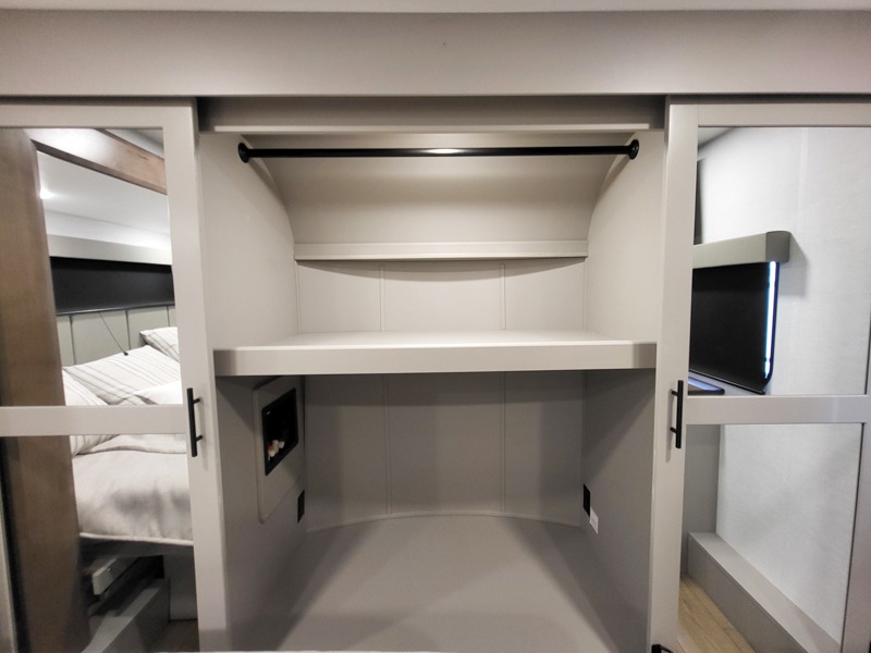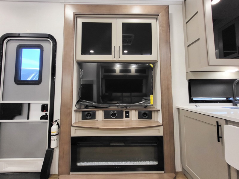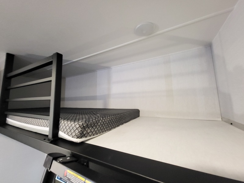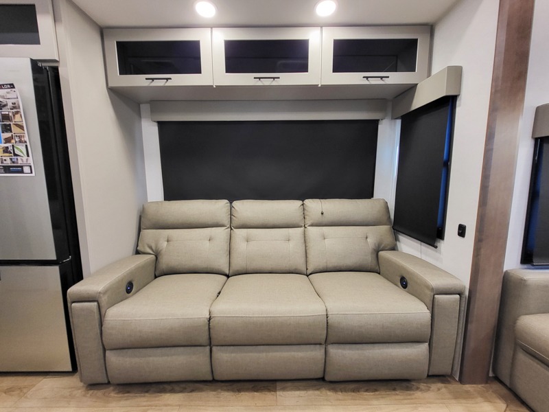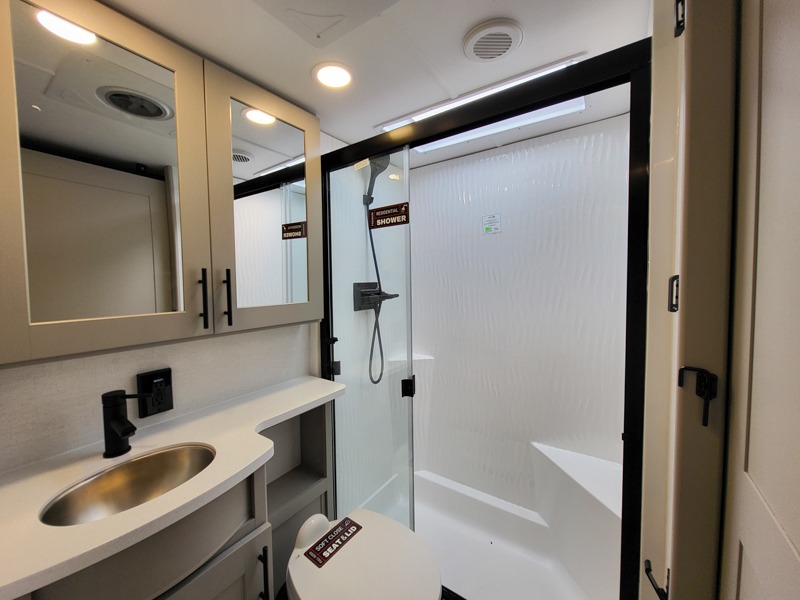 There is room for your off-road toys and the whole family in this toy hauler! The bath and a half makes life more convenient and the dual entry doors create a smooth flow of traffic in and out of the unit. Aside from 13' of garage space and an entrance/exit door, there are also opposing HappiJac sofas with a queen bed above them, a loft that opens to the garage, and a half bathroom. The chef can prepare their best meals with the four burner cooktop while two others sit at the flip up counter with two bar stools. After a fun day on the trails, wash up in the full bathroom with the 48" x 30" shower, grab your pajamas from the front wardrobe or flip top dresser in the front private bedroom then relax on one of the two sofas by the fireplace and 50" HDTV!