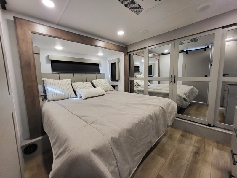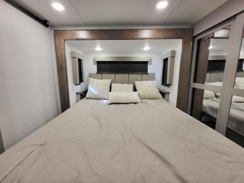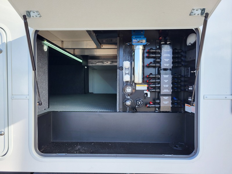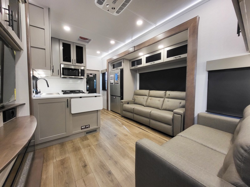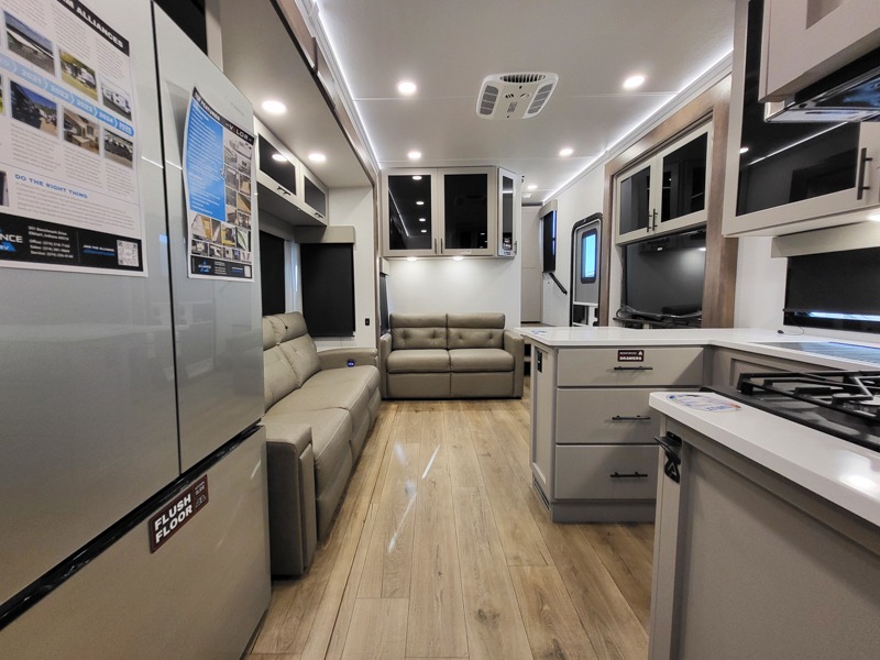 You can bring your toys with you wherever you go with any one of these Alliance RV Valor toy hauler fifth wheels! They are adventure-ready with a quality build from the walk on roof with seamless PVC roof covering to the commercial grade vinyl flooring and MorRyde CRE3000 suspension system. The Performance Running Gear package comes with a 101" wide-body benchmark chassis platform, 7,000 lb. Dexter axles, and a space enhancing drop frame storage compartment to pack in all your riding gear. You can even go off-gridding thanks to the Off the Grid Pack that has two 400 watt solar panels, generator prep, a 40 amp charge controller, and a 100 amp hour lithium iron phosphate battery. Some of the interior comforts you will enjoy are the hardwood cabinet doors and drawers, solid surface kitchen countertops, and commercial grade vinyl flooring with no carpet to make clean up a breeze. The Valor toy haulers are also the Masters of 12 Volt with USB charging station throughout, a stainless steel refrigerator, and more 12 volt features to make camping hassle-free!