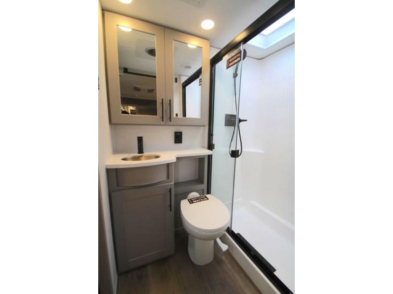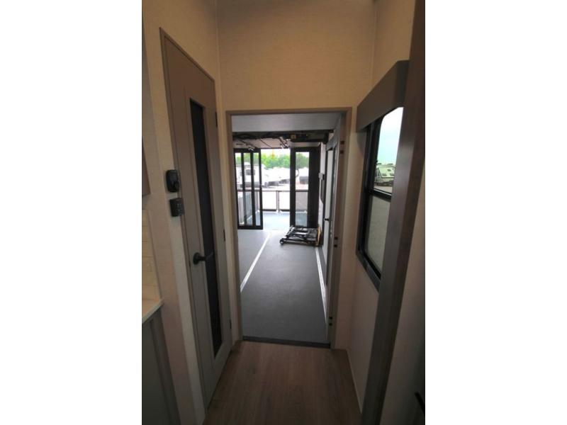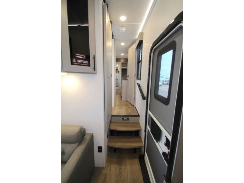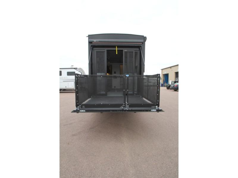 There is room for your off-road toys and the whole family in this toy hauler! The bath and a half makes life more convenient and the dual entry doors create a smooth flow of traffic in and out of the unit. Aside from 13' of garage space and an entrance/exit door, there are also opposing HappiJac sofas with a queen bed above them, a loft that opens to the garage, and a half bathroom. The chef can prepare their best meals with the four burner cooktop while two others sit at the flip up counter with two bar stools. After a fun day on the trails, wash up in the full bathroom with the 48" x 30" shower, grab your pajamas from the front wardrobe or flip top dresser in the front private bedroom then relax on one of the two sofas by the fireplace and 50" HDTV!
