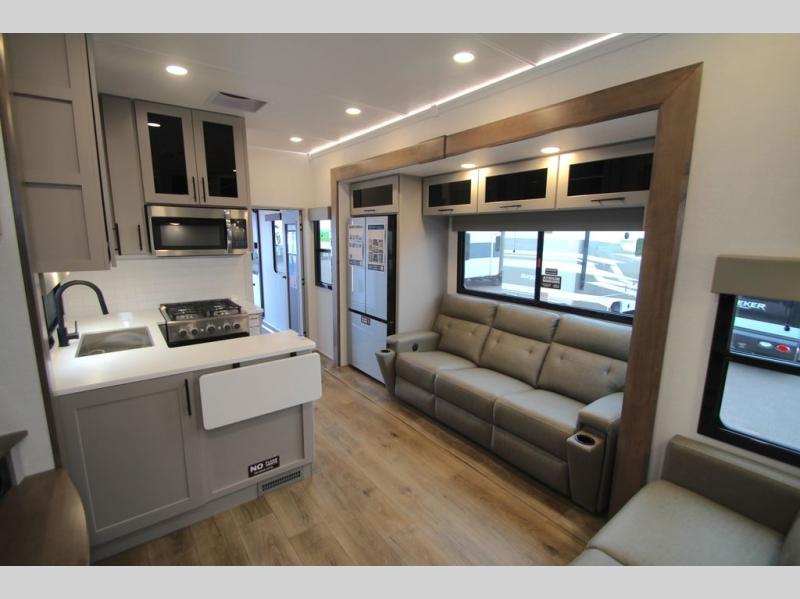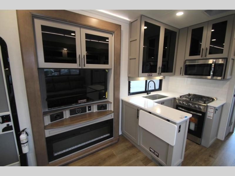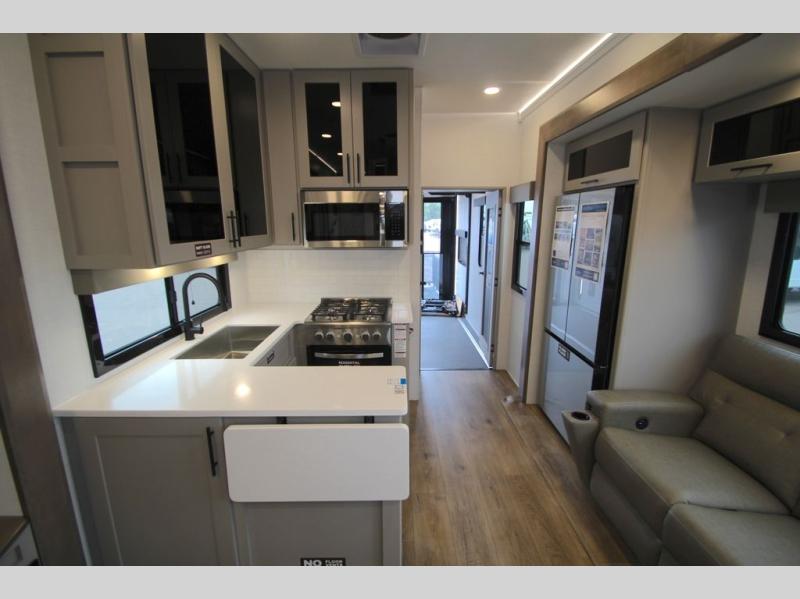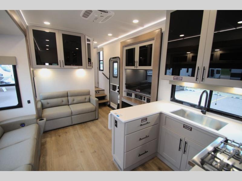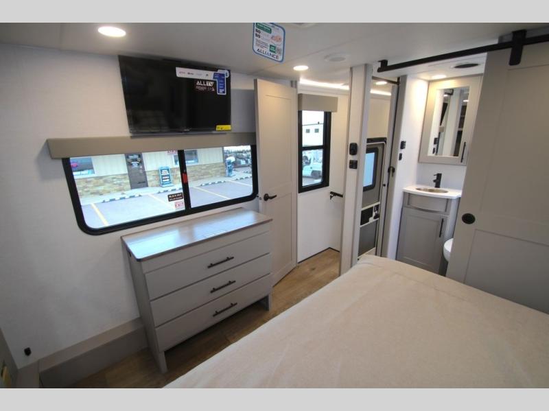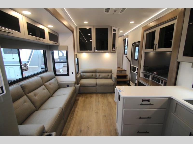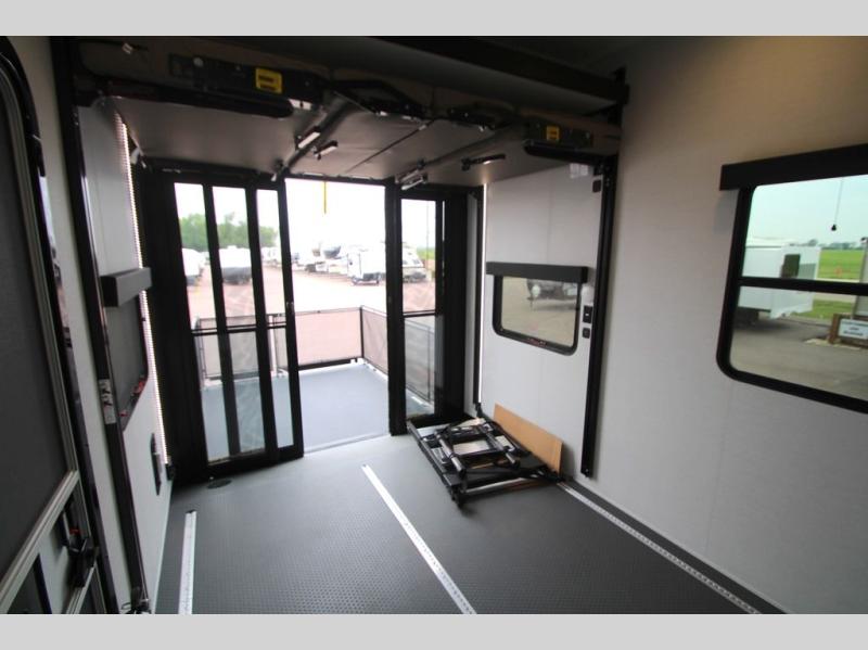 You can bring your toys with you wherever you go with any one of these Alliance RV Valor toy hauler fifth wheels! They are adventure-ready with a quality build from the walk on roof with seamless PVC roof covering to the commercial grade vinyl flooring and MorRyde CRE3000 suspension system. The Performance Running Gear package comes with a 101" wide-body benchmark chassis platform, 7,000 lb. Dexter axles, and a space enhancing drop frame storage compartment to pack in all your riding gear. You can even go off-gridding thanks to the Off the Grid Pack that has two 400-watt solar panels, generator prep, a 60-amp charge controller, and a 100-amp hour lithium iron phosphate battery. Some of the interior comforts you will enjoy are the hardwood cabinet doors and drawers, solid surface kitchen countertops, and commercial grade vinyl flooring with no carpet to make clean up a breeze. The Valor toy haulers are also the Masters of 12 Volt with USB charging station throughout, a 12V refrigerator, and more 12-volt features to make camping hassle-free!