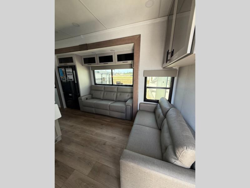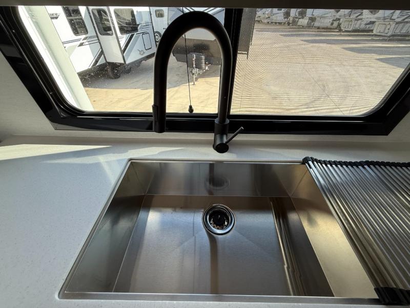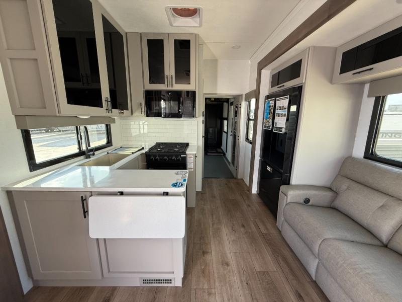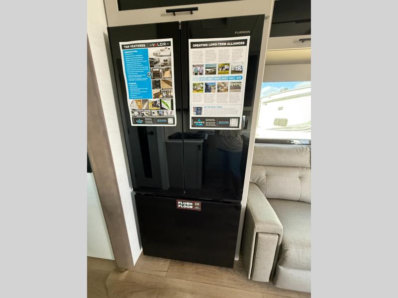You can bring your toys with you wherever you go with any one of these Alliance RV Valor toy hauler fifth wheels! They are adventure-ready with a quality build from the walk on roof with seamless PVC roof covering to the commercial grade vinyl flooring and MorRyde CRE3000 suspension system. The Performance Running Gear package comes with a 101" wide-body benchmark chassis platform, 7,000 lb. Dexter axles, and a space enhancing drop frame storage compartment to pack in all your riding gear. You can even go off-gridding thanks to the Off the Grid Pack that has two 400-watt solar panels, generator prep, a 60-amp charge controller, and a 100-amp hour lithium iron phosphate battery. Some of the interior comforts you will enjoy are the hardwood cabinet doors and drawers, solid surface kitchen countertops, and commercial grade vinyl flooring with no carpet to make clean up a breeze. The Valor toy haulers are also the Masters of 12 Volt with USB charging station throughout, a 12V refrigerator, and more 12-volt features to make camping hassle-free!
