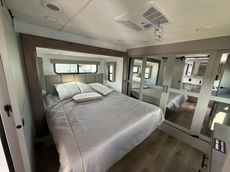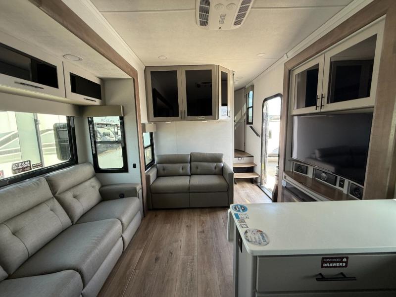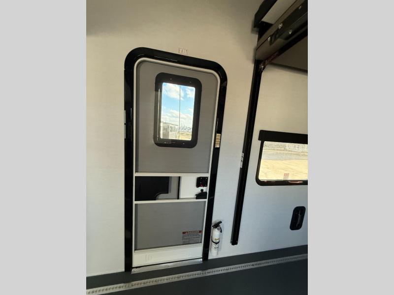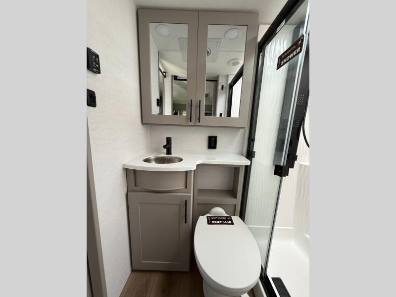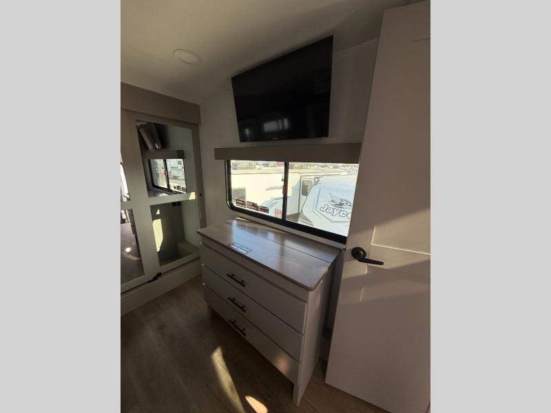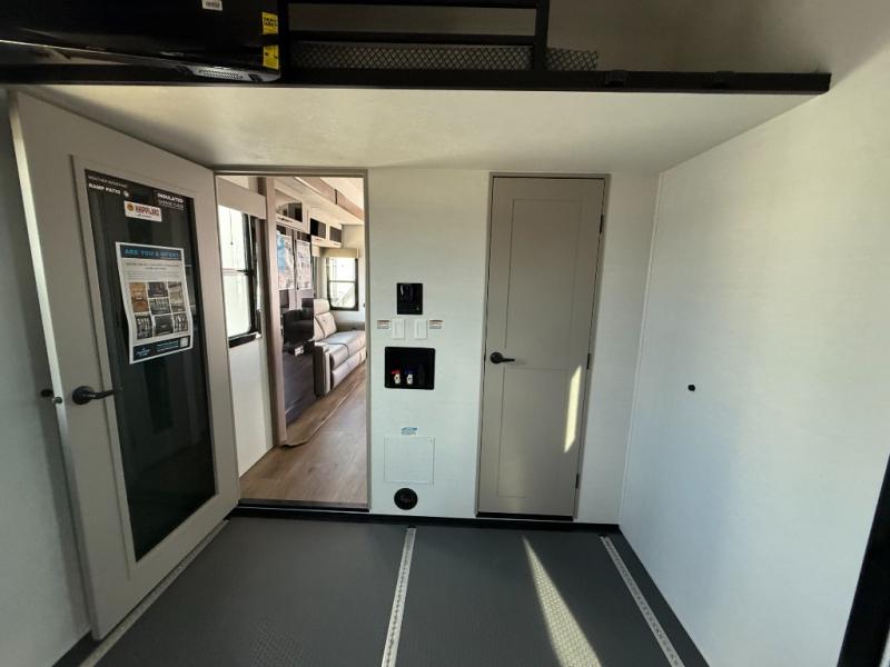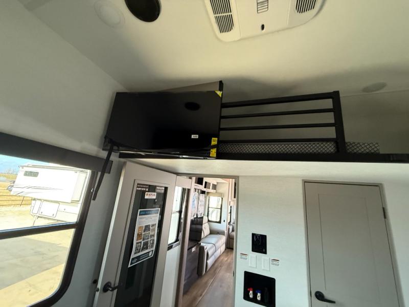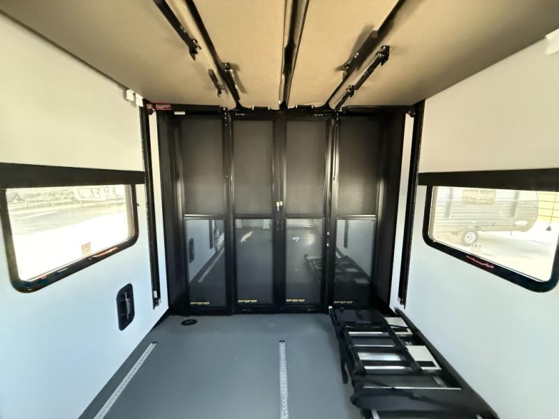 There is room for your off-road toys and the whole family in this toy hauler! The bath and a half makes life more convenient and the dual entry doors create a smooth flow of traffic in and out of the unit. Aside from 13' of garage space and an entrance/exit door, there are also opposing HappiJac sofas with a queen bed above them, a loft that opens to the garage, and a half bathroom. The chef can prepare their best meals with the four burner cooktop while two others sit at the flip up counter with two bar stools. After a fun day on the trails, wash up in the full bathroom with the 48" x 30" shower, grab your pajamas from the front wardrobe or flip top dresser in the front private bedroom then relax on one of the two sofas by the fireplace and 50" HDTV!