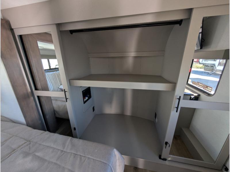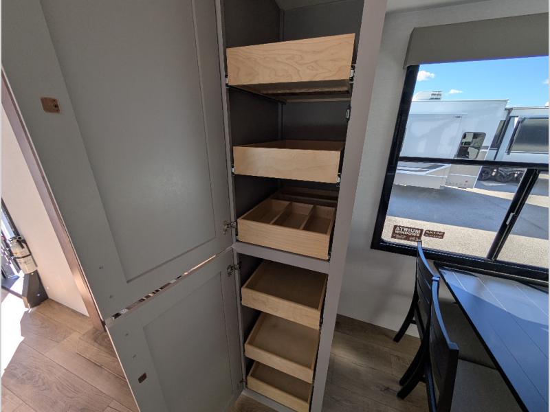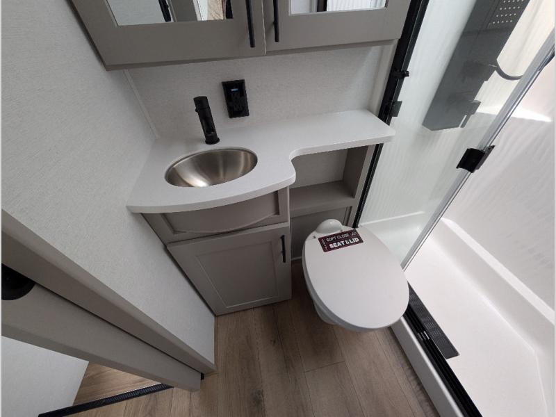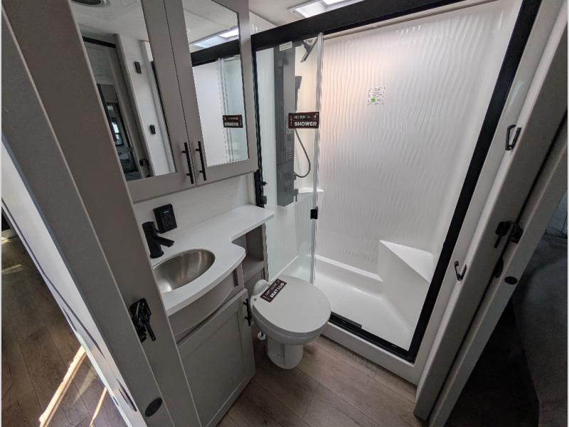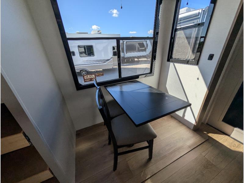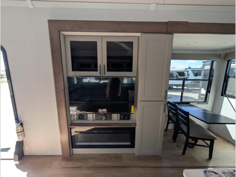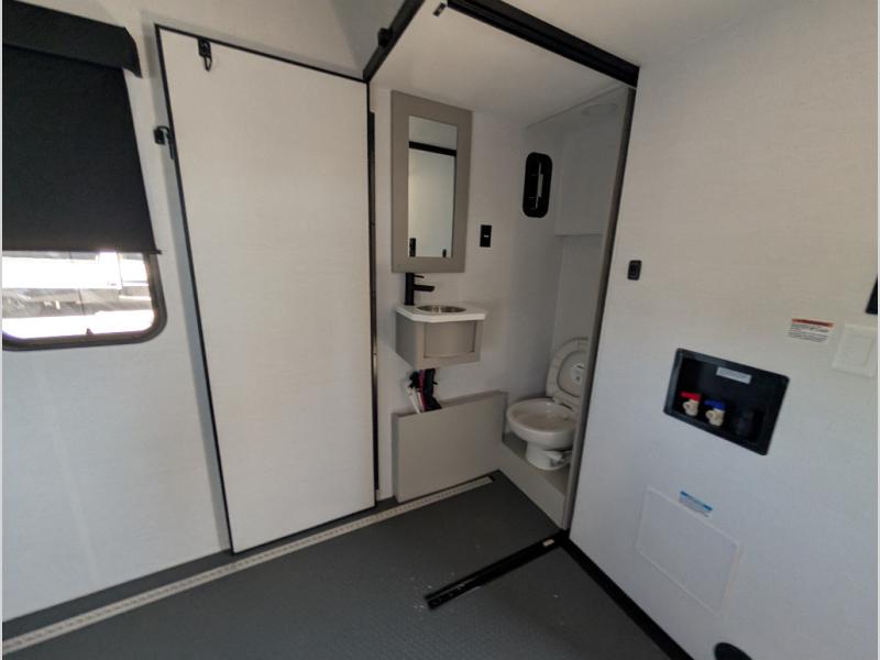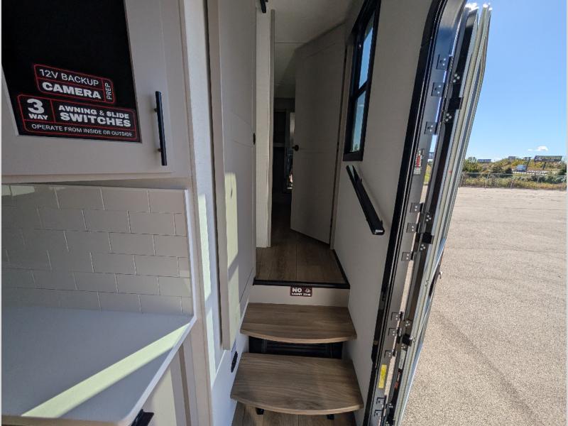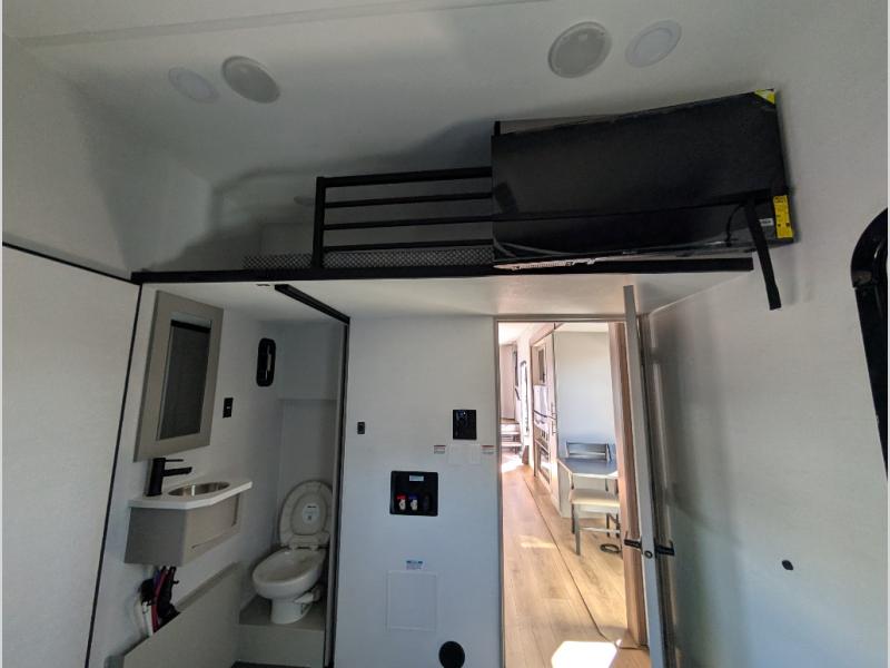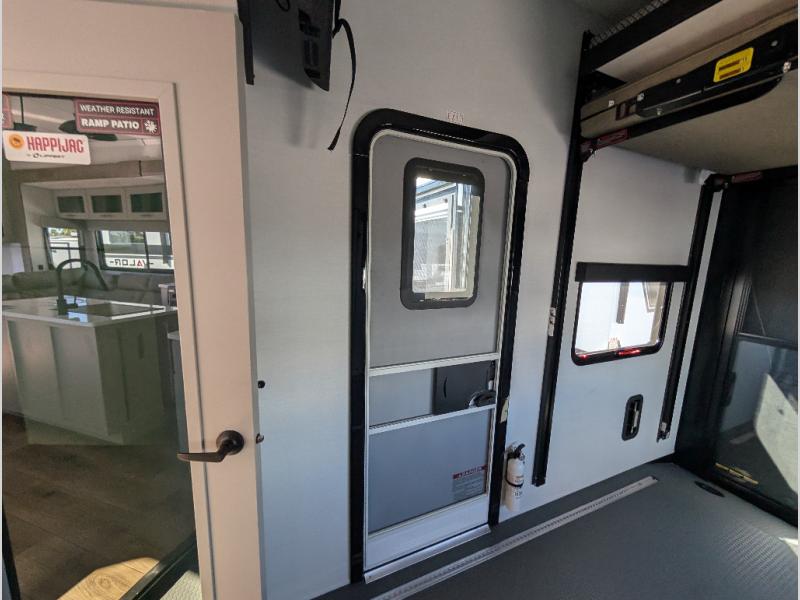 There is room for your off-road toys and the whole family in this toy hauler! The bath and a half makes life more convenient and the dual entry doors create a smooth flow of traffic in and out of the unit. Aside from 13' of garage space and an entrance/exit door, there are also opposing 60" sofas with a HappiJac queen bed above them, a loft that opens to the garage, and a half bathroom. The chef can prepare their best meals with the four-burner cooktop while your crew plays a game at the free-standing dinette with chairs. After a fun day on the trails, wash up in the full bathroom with the 48" x 30" shower, grab your pajamas from the front wardrobe or flip top dresser in the front private bedroom, and sleep soundly on the king bed slide out!