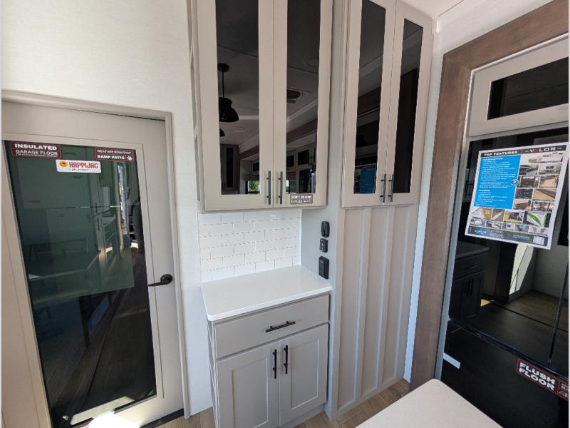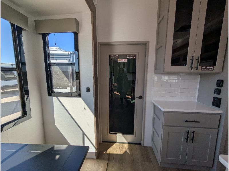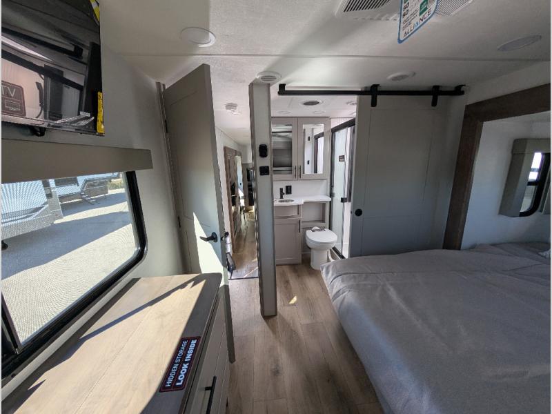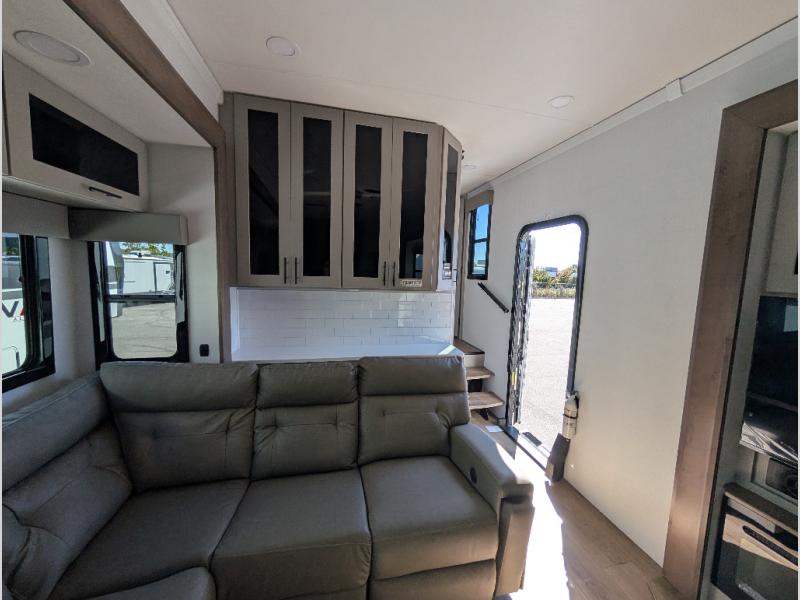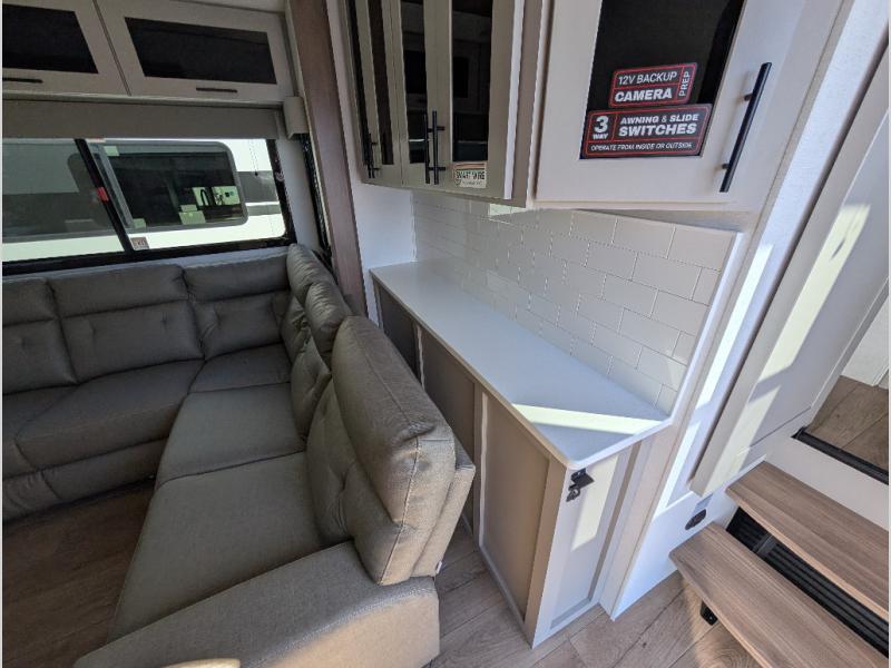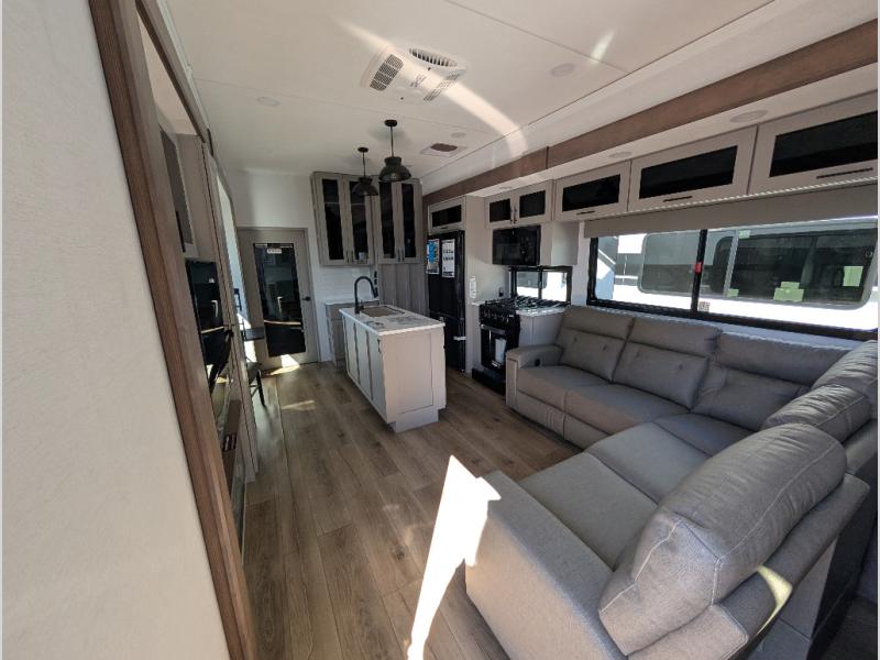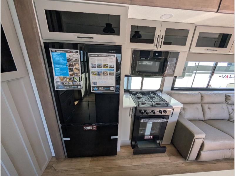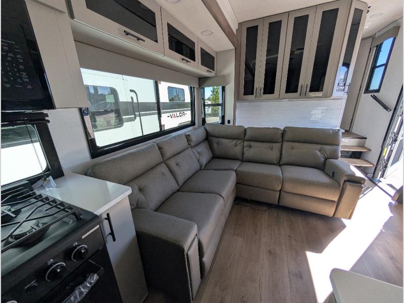 You can bring your toys with you wherever you go with any one of these Alliance RV Valor toy hauler fifth wheels! They are adventure-ready with a quality build from the walk on roof with seamless PVC roof covering to the commercial grade vinyl flooring and MorRyde CRE3000 suspension system. The Performance Running Gear package comes with a 101" wide-body benchmark chassis platform, 7,000 lb. Dexter axles, and a space enhancing drop frame storage compartment to pack in all your riding gear. You can even go off-gridding thanks to the Off the Grid Pack that has two 400-watt solar panels, generator prep, a 60-amp charge controller, and a 100-amp hour lithium iron phosphate battery. Some of the interior comforts you will enjoy are the hardwood cabinet doors and drawers, solid surface kitchen countertops, and commercial grade vinyl flooring with no carpet to make clean up a breeze. The Valor toy haulers are also the Masters of 12 Volt with USB charging station throughout, a 12V refrigerator, and more 12-volt features to make camping hassle-free!