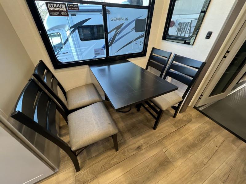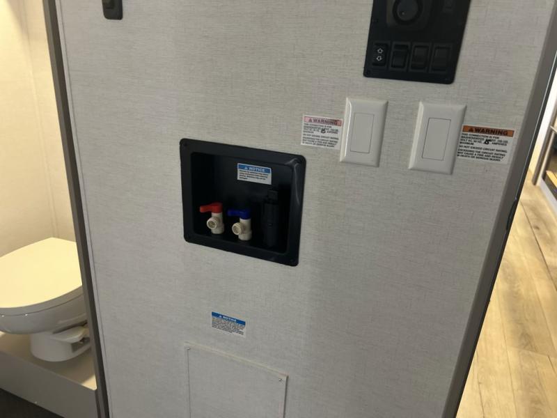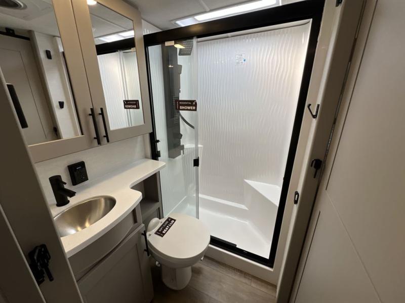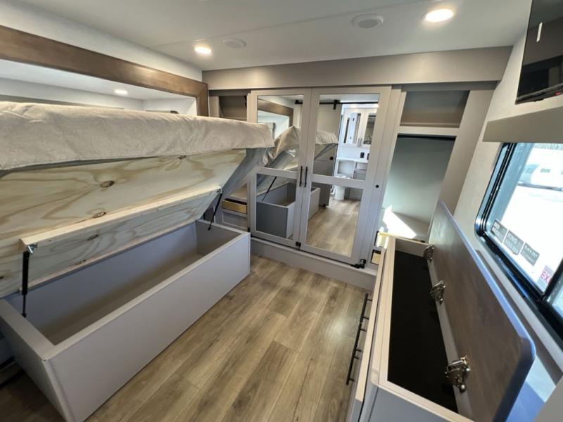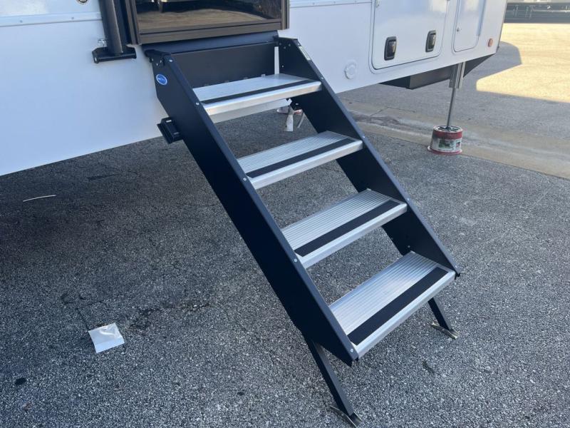 There is room for your off-road toys and the whole family in this toy hauler! The bath and a half makes life more convenient and the dual entry doors create a smooth flow of traffic in and out of the unit. Aside from 13' of garage space and an entrance/exit door, there are also opposing 60" sofas with a HappiJac queen bed above them, a loft that opens to the garage, and a half bathroom. The chef can prepare their best meals with the four-burner cooktop while your crew plays a game at the free-standing dinette with chairs. After a fun day on the trails, wash up in the full bathroom with the 48" x 30" shower, grab your pajamas from the front wardrobe or flip top dresser in the front private bedroom, and sleep soundly on the king bed slide out!