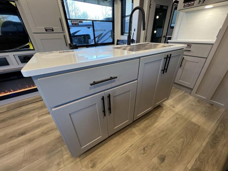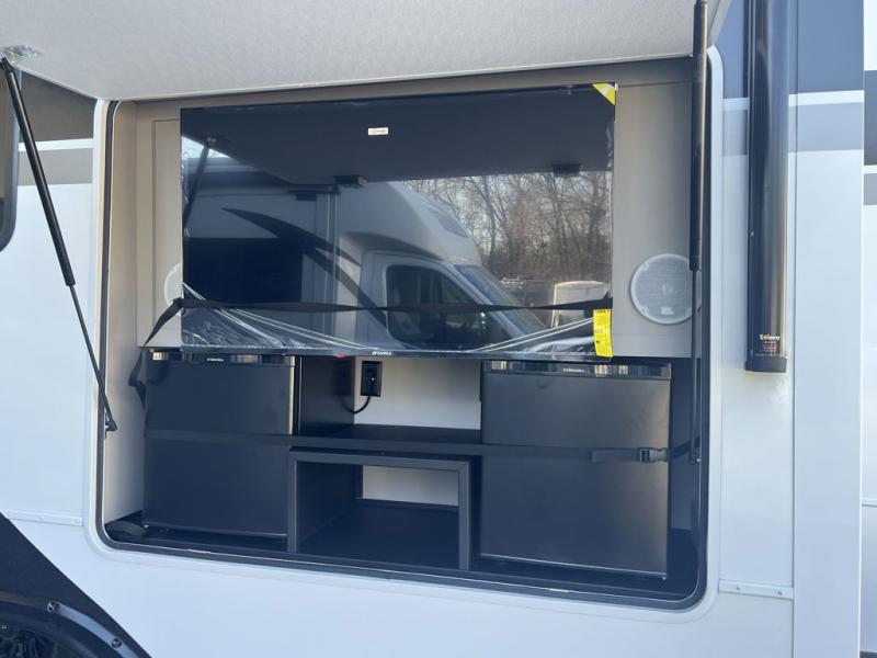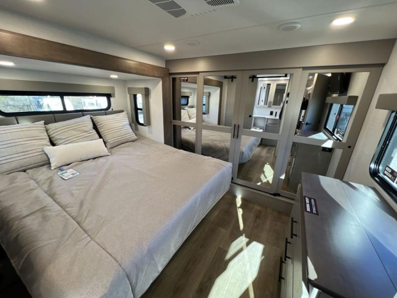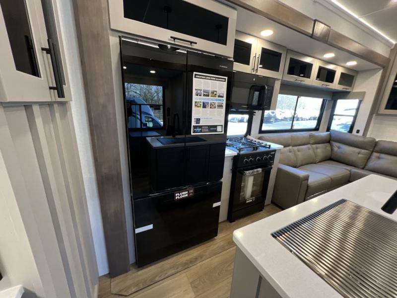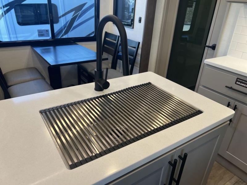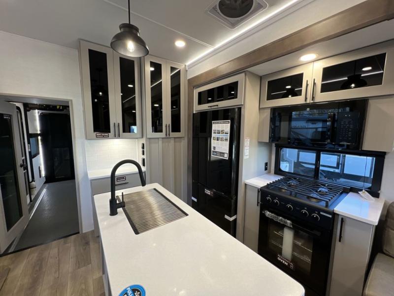 You can bring your toys with you wherever you go with any one of these Alliance RV Valor toy hauler fifth wheels! They are adventure-ready with a quality build from the walk on roof with seamless PVC roof covering to the commercial grade vinyl flooring and MorRyde CRE3000 suspension system. The Performance Running Gear package comes with a 101" wide-body benchmark chassis platform, 7,000 lb. Dexter axles, and a space enhancing drop frame storage compartment to pack in all your riding gear. You can even go off-gridding thanks to the Off the Grid Pack that has two 400-watt solar panels, generator prep, a 60-amp charge controller, and a 100-amp hour lithium iron phosphate battery. Some of the interior comforts you will enjoy are the hardwood cabinet doors and drawers, solid surface kitchen countertops, and commercial grade vinyl flooring with no carpet to make clean up a breeze. The Valor toy haulers are also the Masters of 12 Volt with USB charging station throughout, a 12V refrigerator, and more 12-volt features to make camping hassle-free!